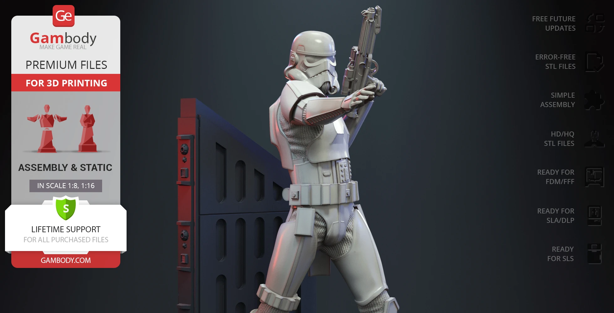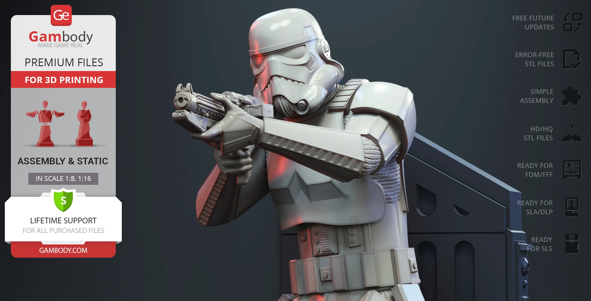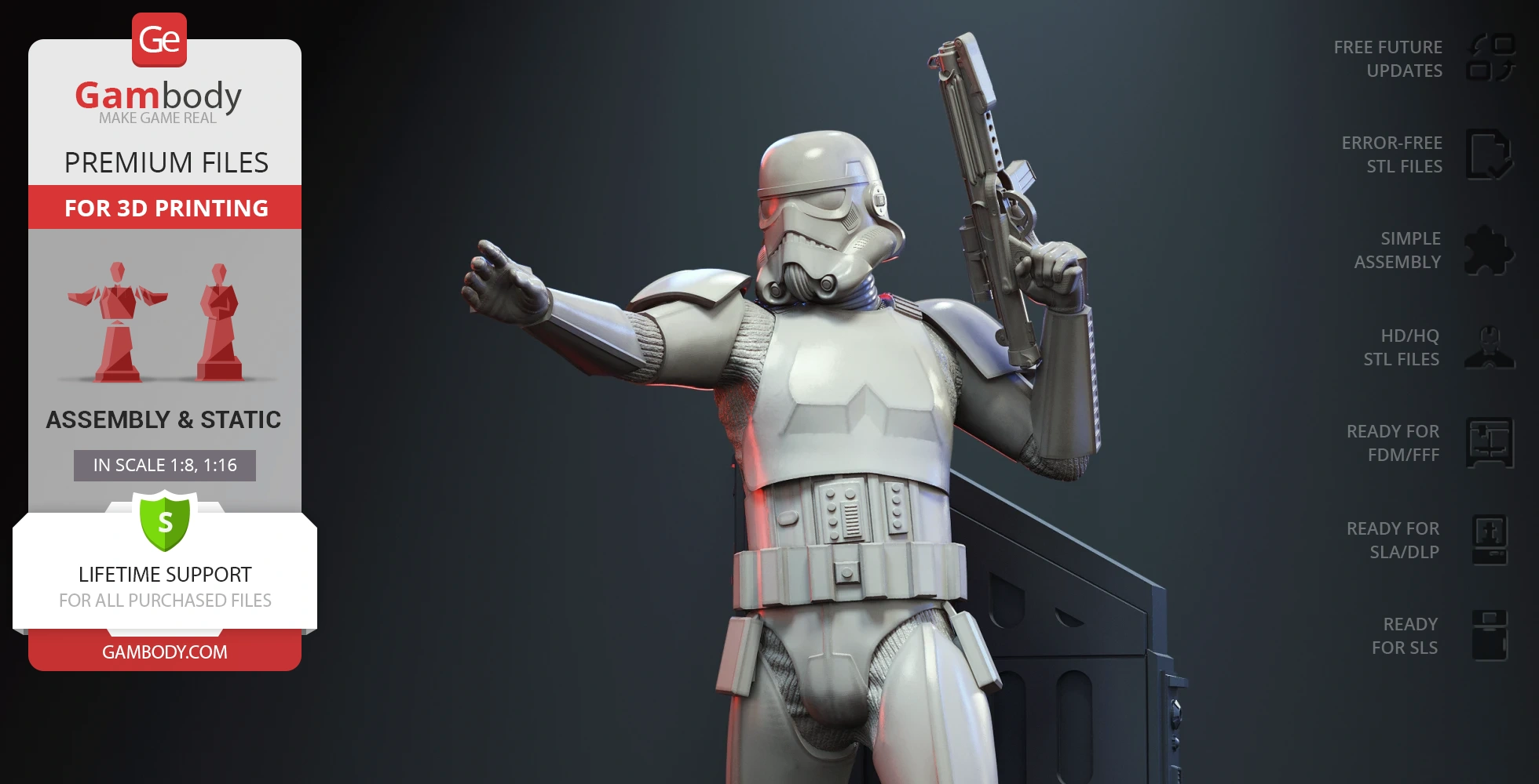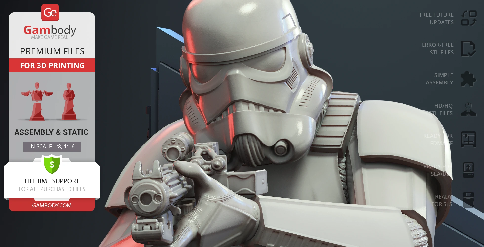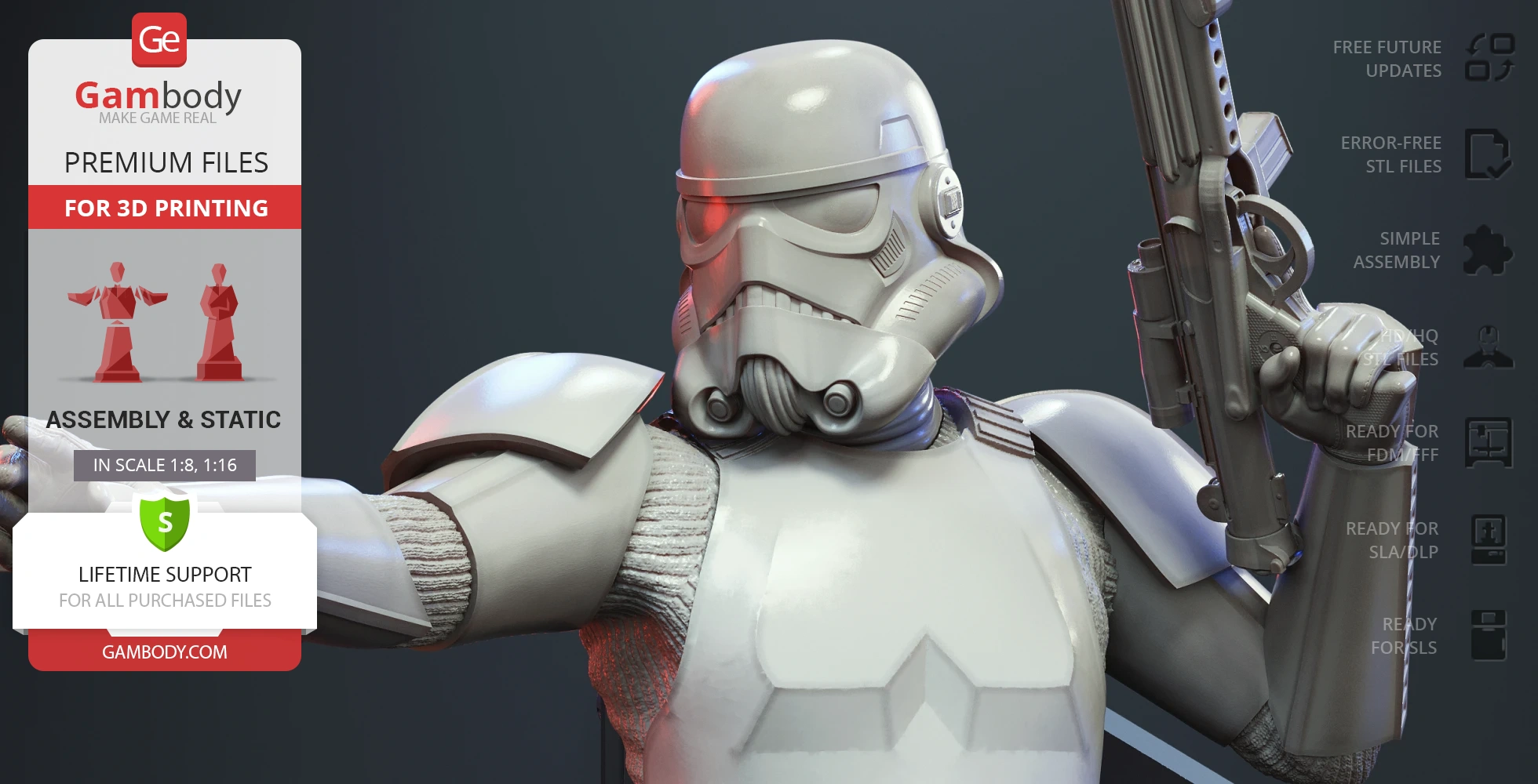 • STL files of high-poly Imperial Stormtrooper model for 3D printing consist of 106 files;