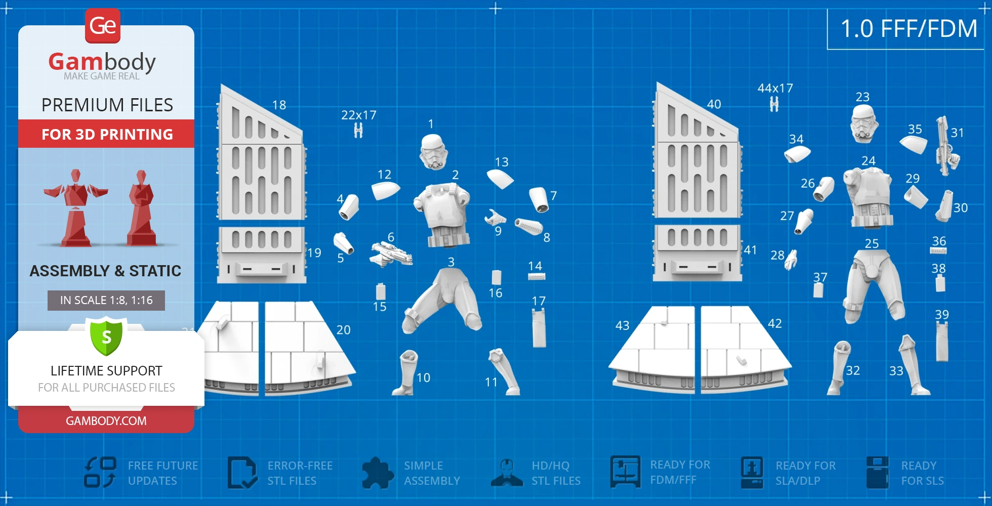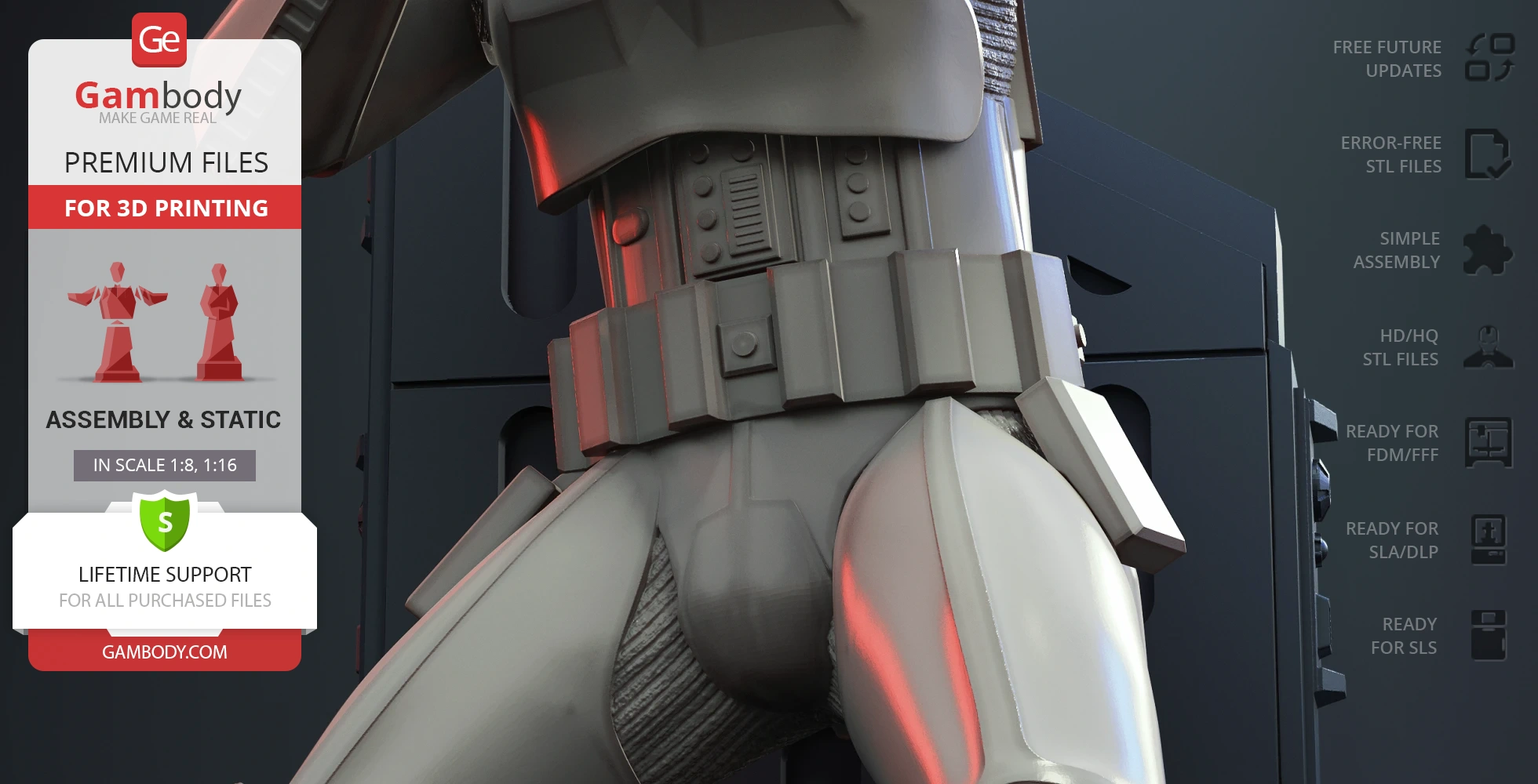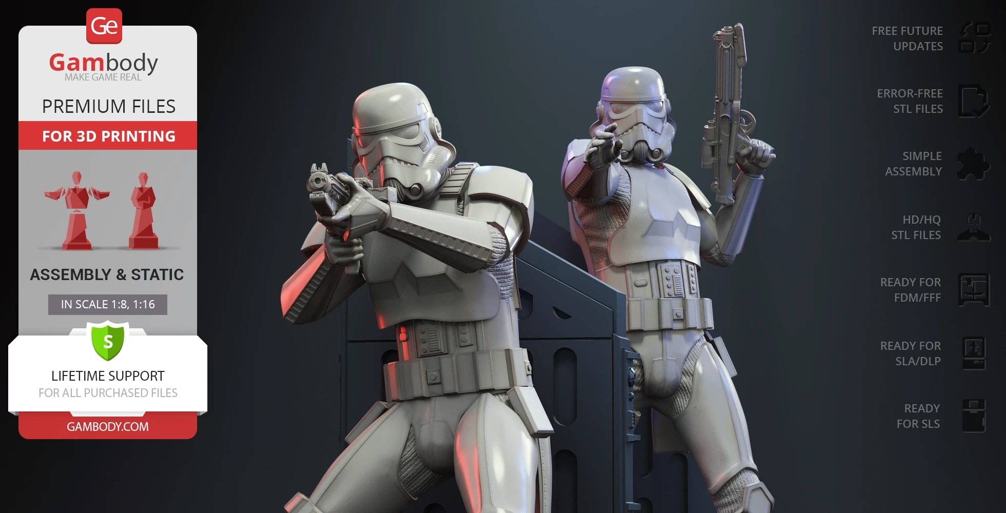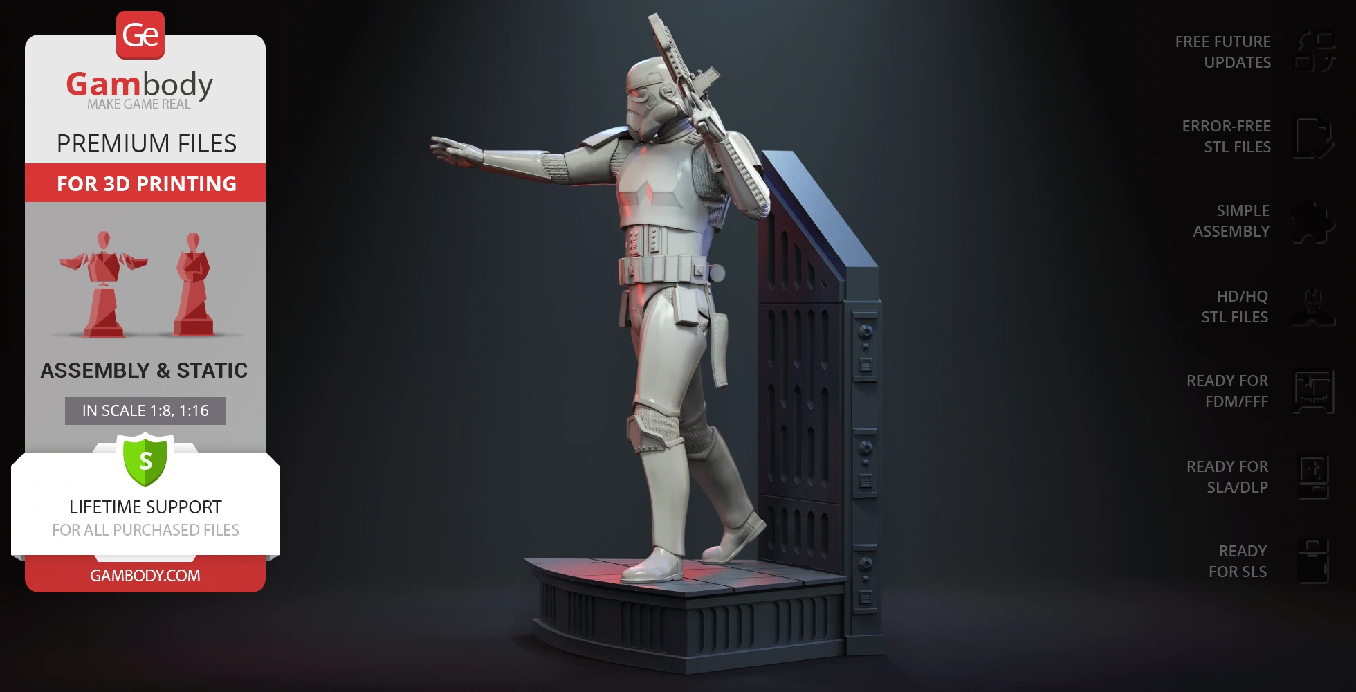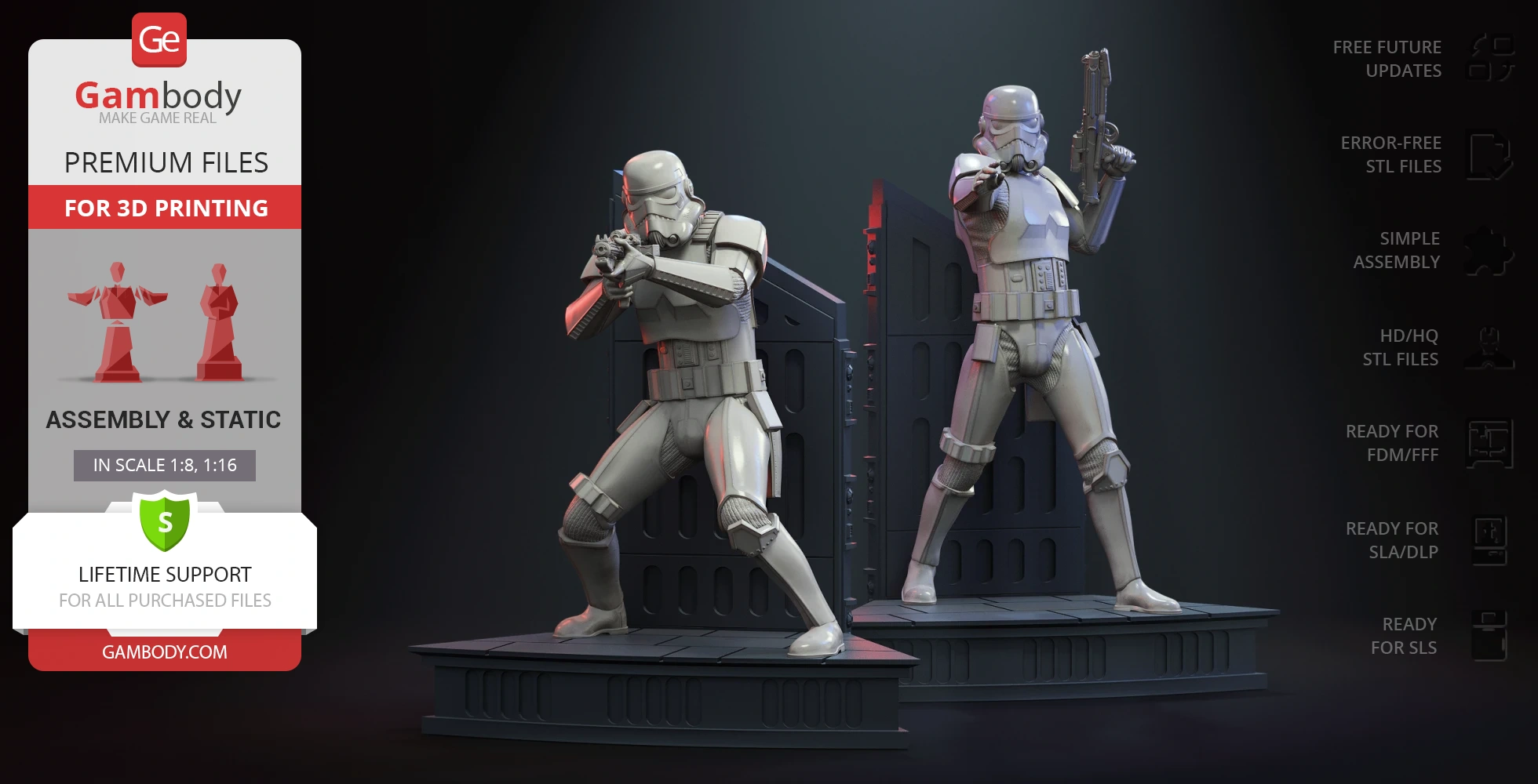 • STL files of high-poly Imperial Stormtrooper model for 3D printing consist of 106 files;