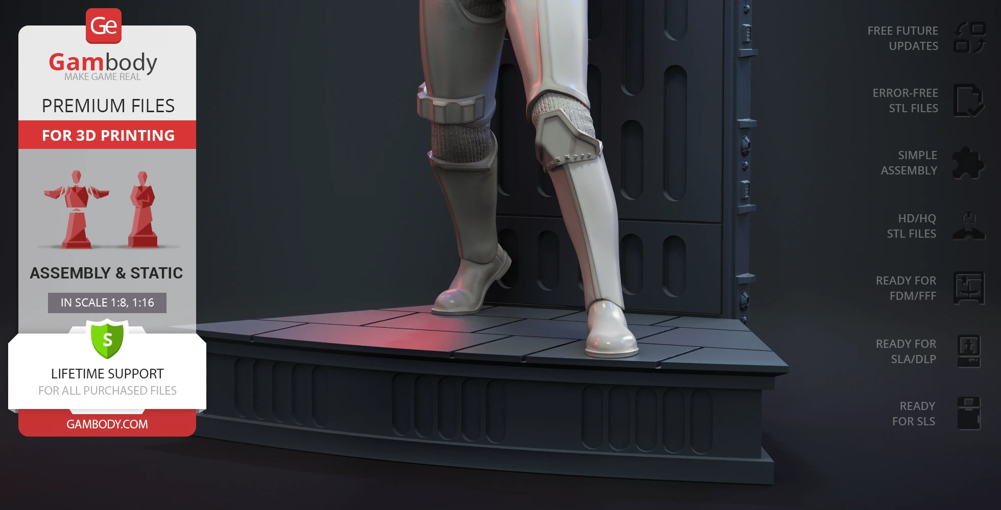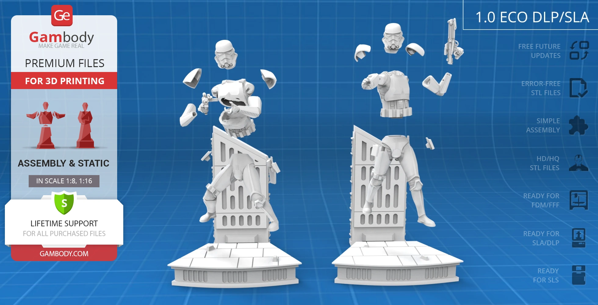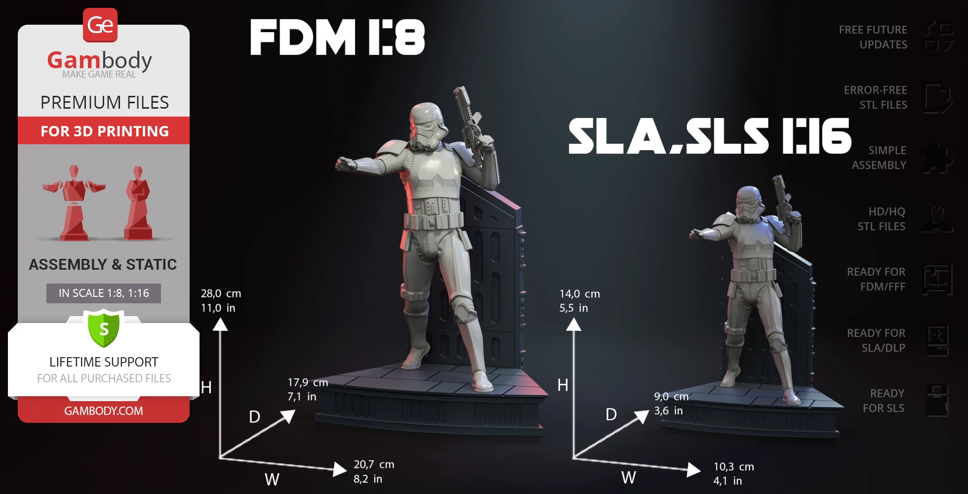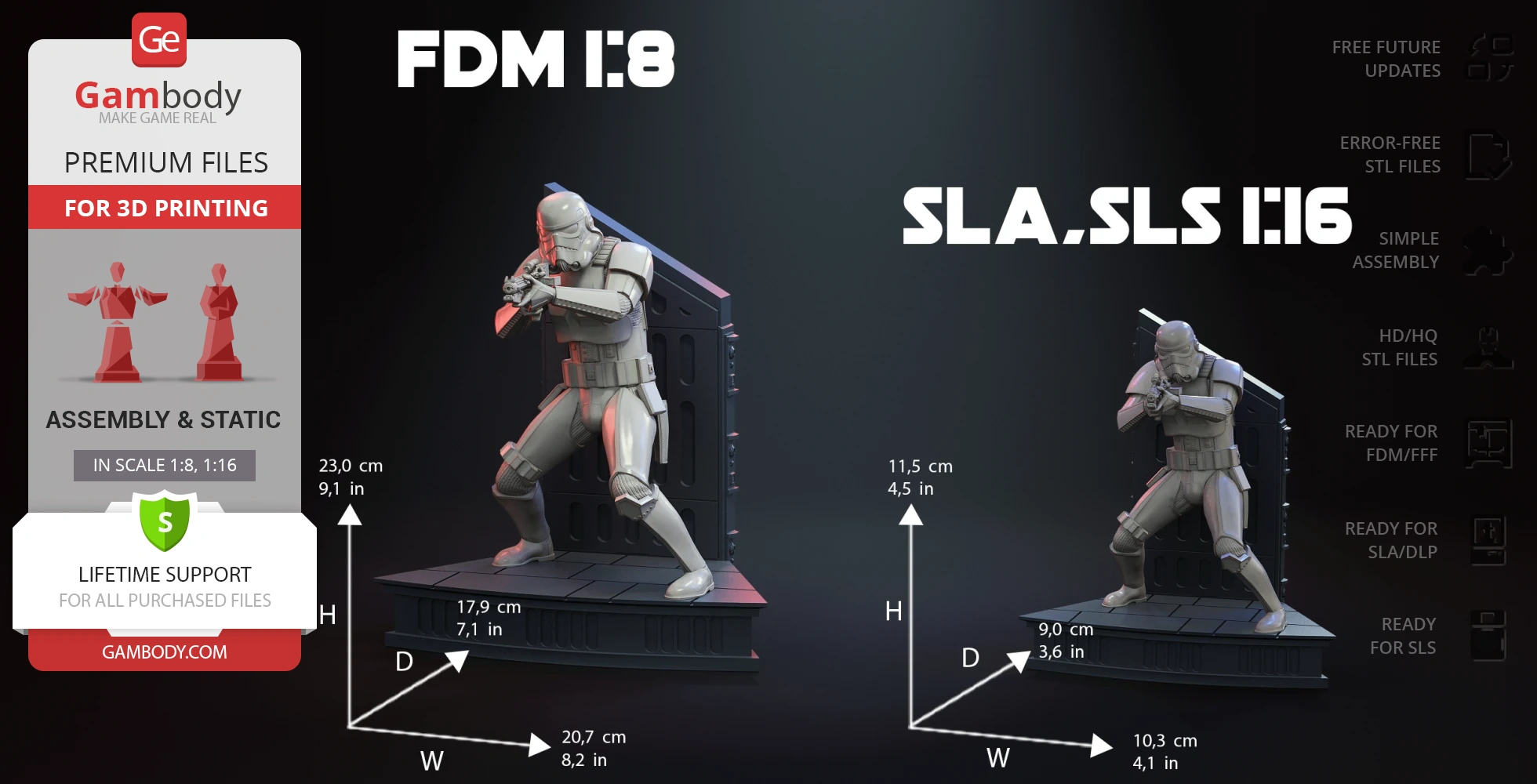 • The model is available in recommended scales of 1:8 for the FFF/FDM version and 1:16 for the DLP/SLA/SLS versions, based on the height of Stormtrooper.