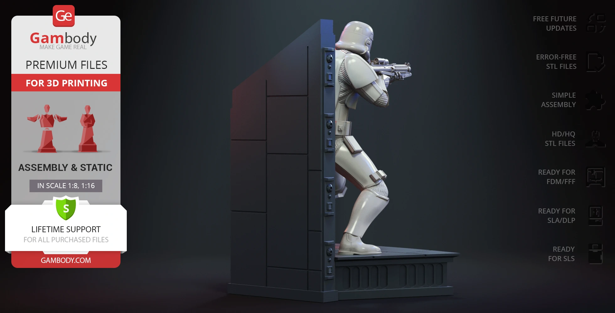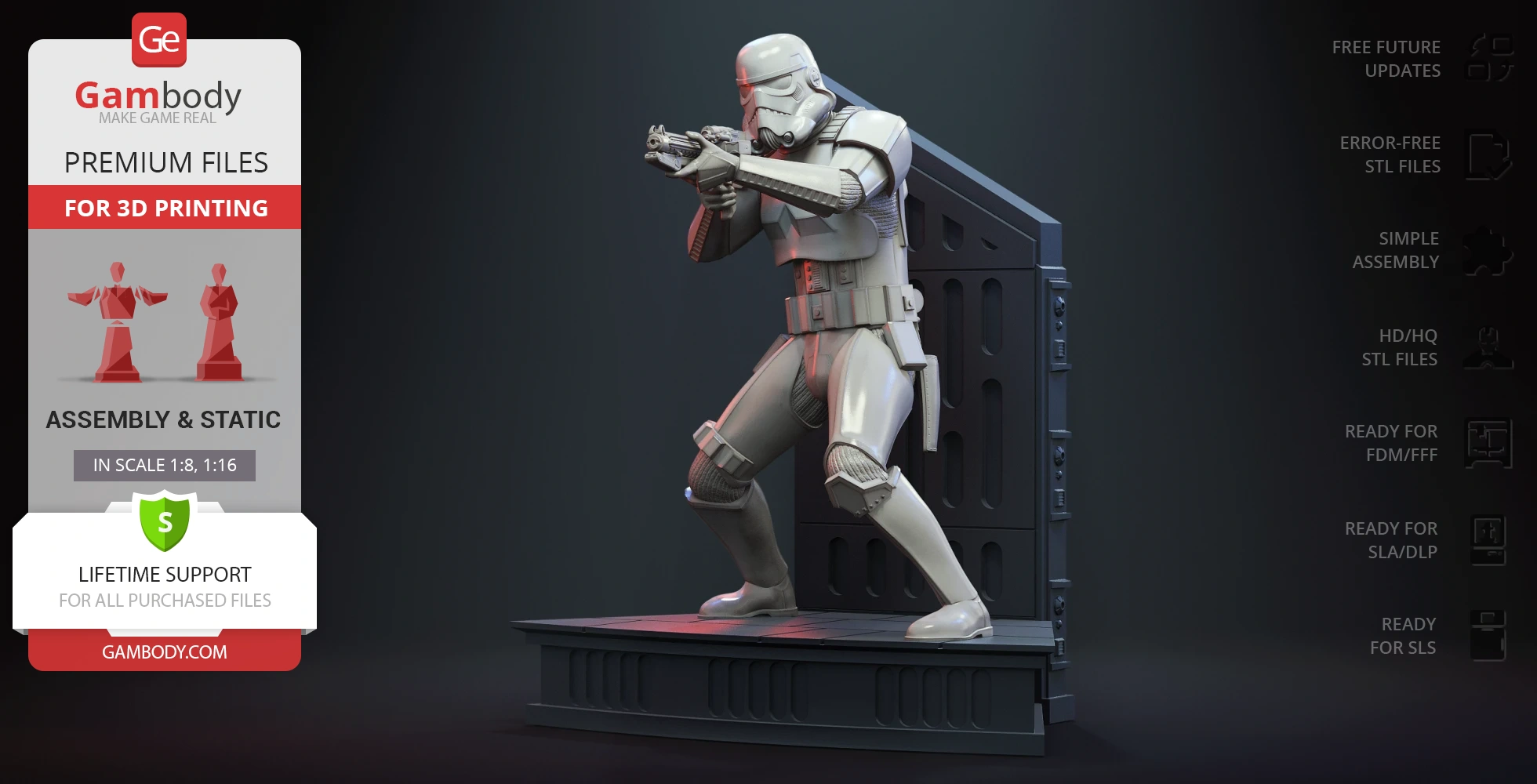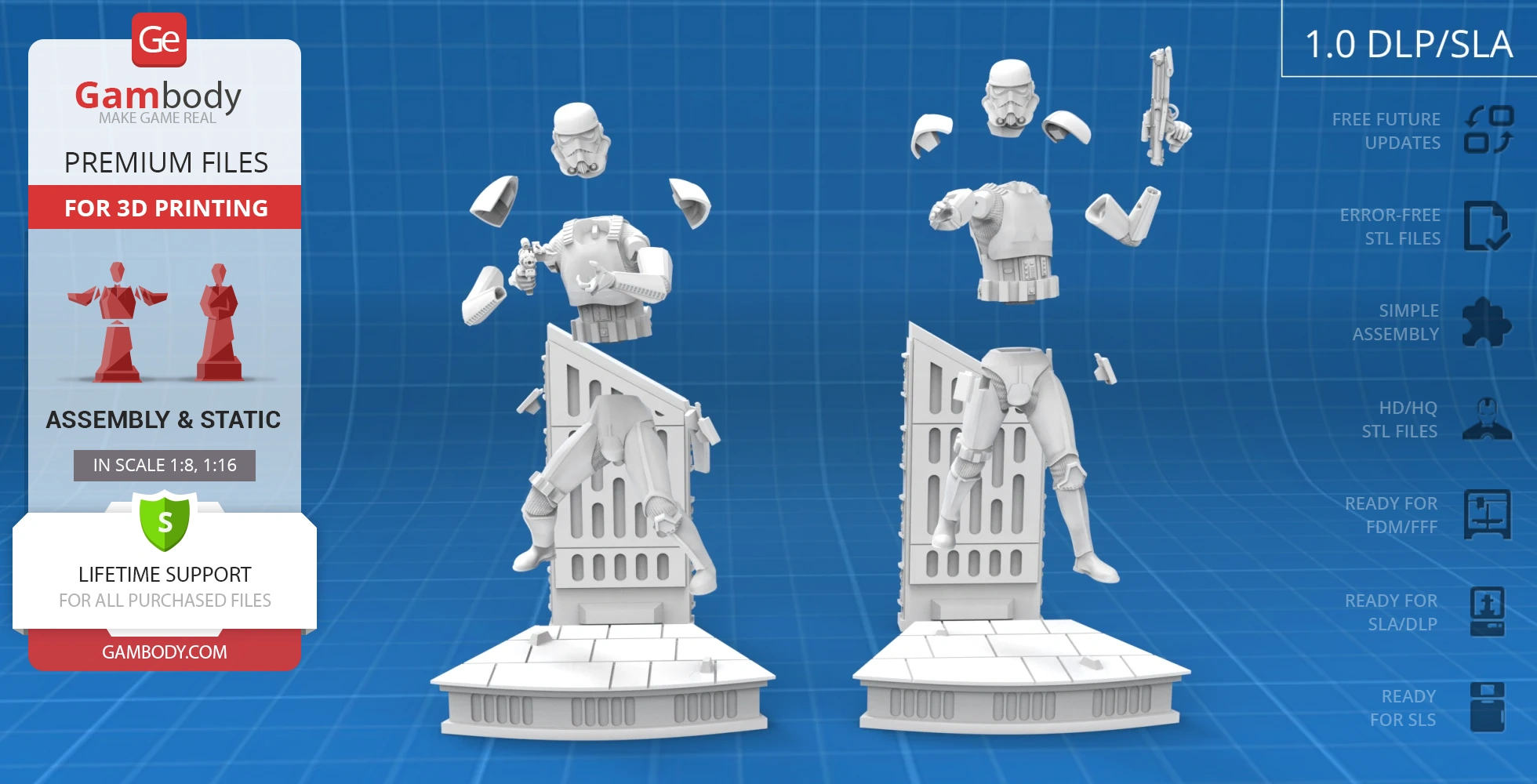 • The model is available in recommended scales of 1:8 for the FFF/FDM version and 1:16 for the DLP/SLA/SLS versions, based on the height of Stormtrooper.