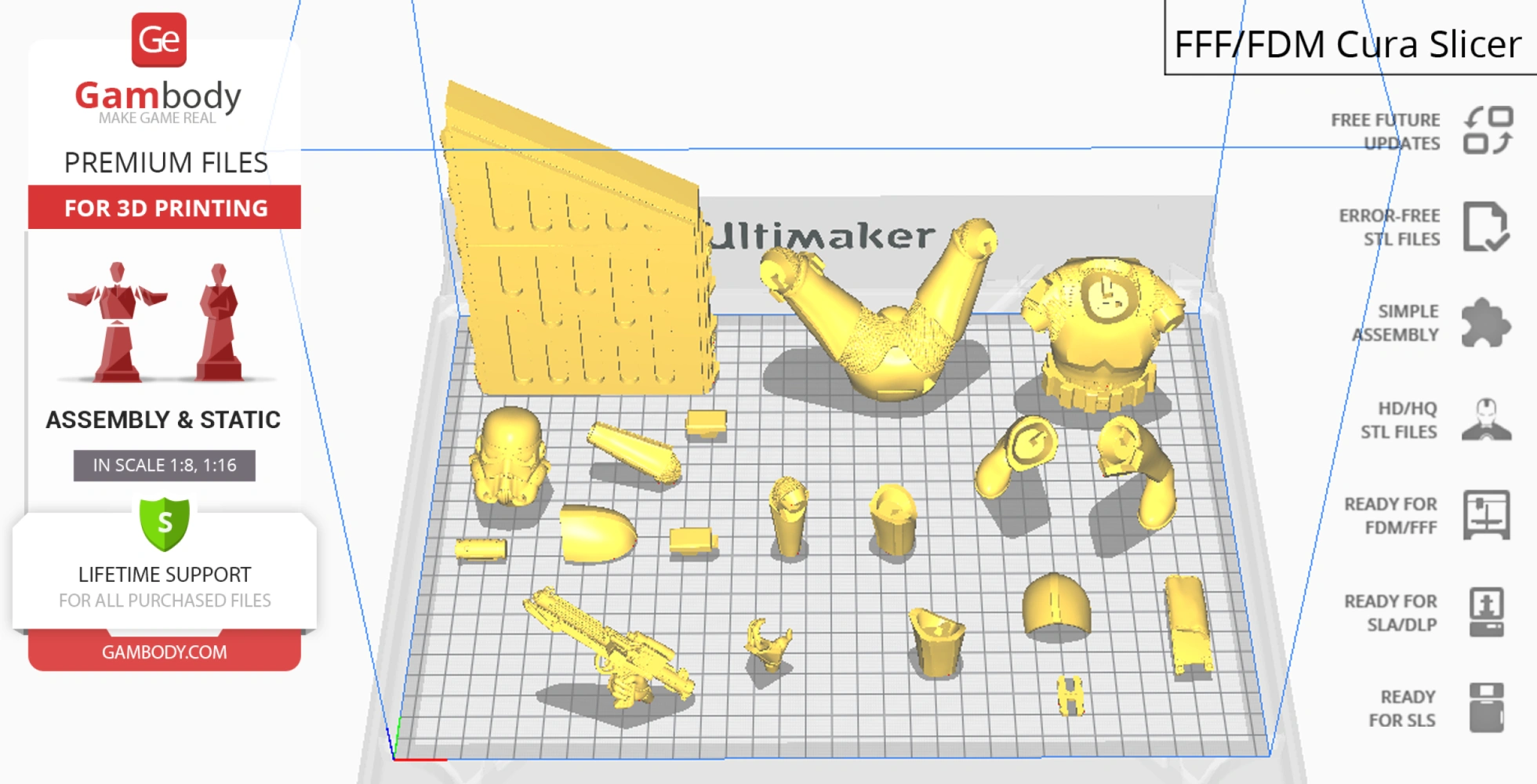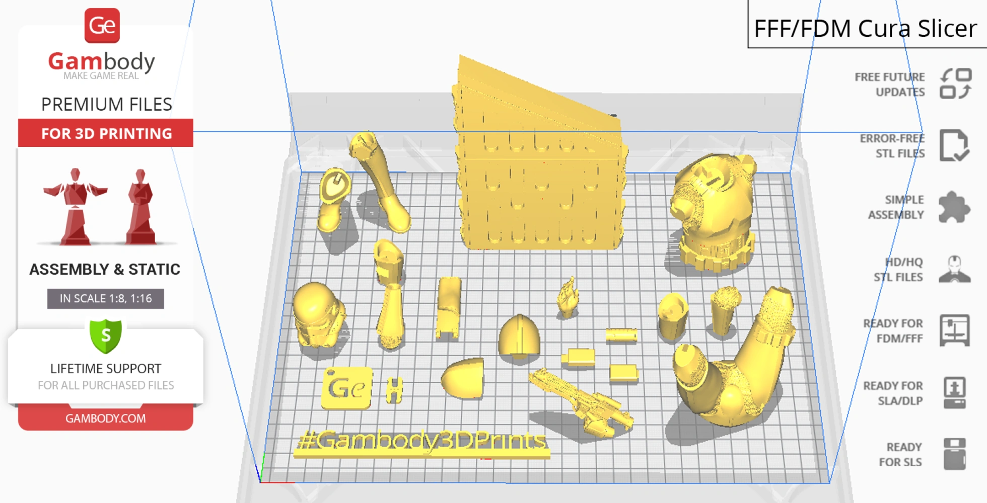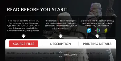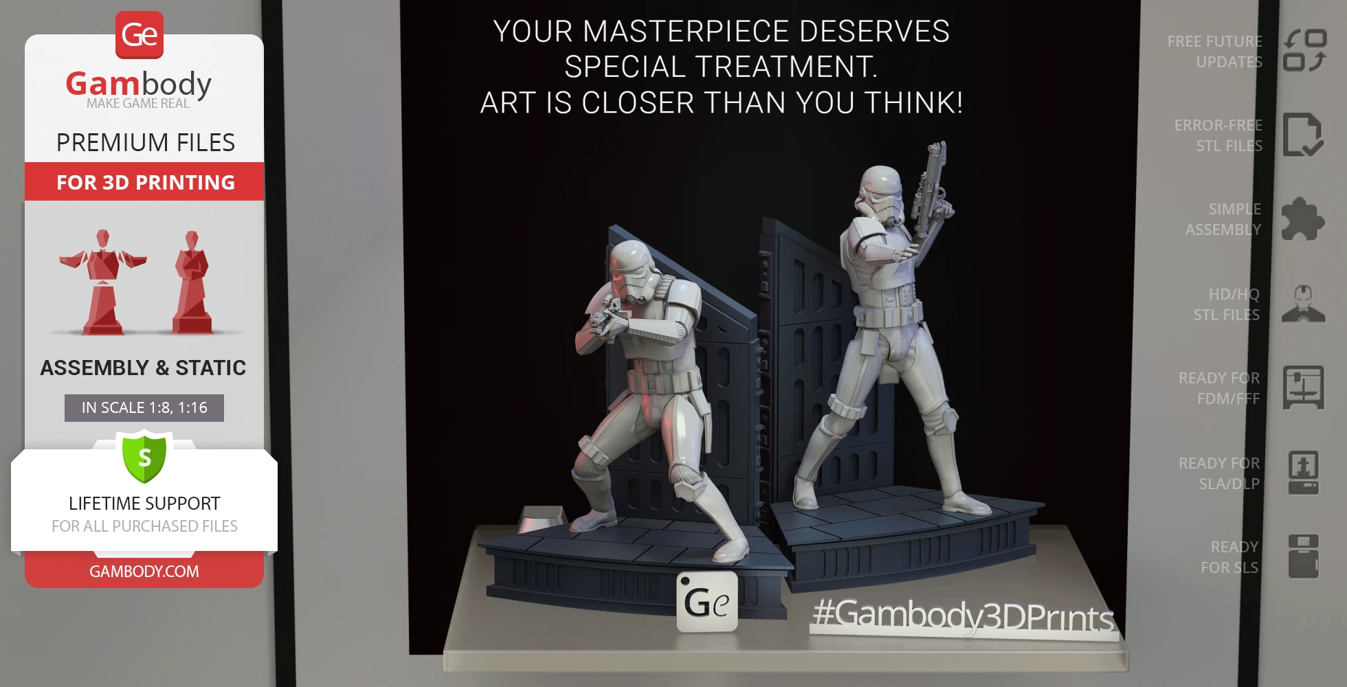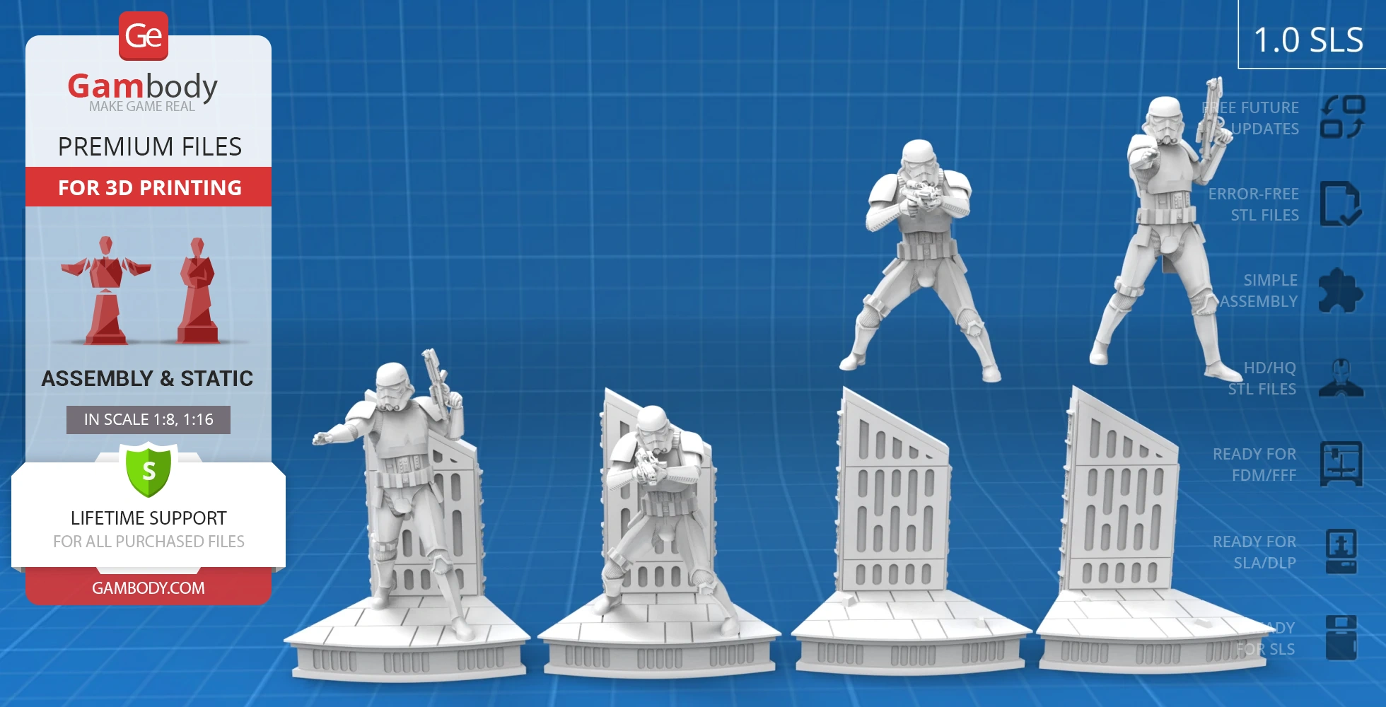 • The model is available in recommended scales of 1:8 for the FFF/FDM version and 1:16 for the DLP/SLA/SLS versions, based on the height of Stormtrooper.