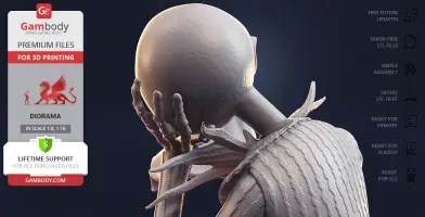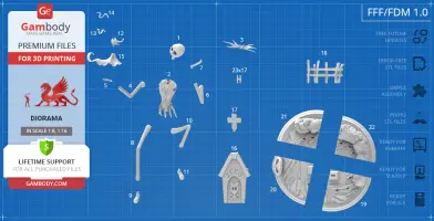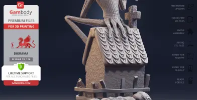 Jack Skellington & Zero figurines for 3D printing in diorama is a static assembly model and its moderation and adaptation for different types of 3D printers took Gambody team 45 hours in total. The diorama’s cutting was chosen by our team to minimize the amount of filament needed for generated support and some of the parts were hollowed out for you to save resin in the model’s Eco version. In order to conceal the places where the assembly parts of the model must be connected, Jack figurine was cut along the contour of its suit seams and properly “taken off” the gravestone-like platform. Zero was carefully separated from Jack’s palm and its wavy ears were "cut off" as well in order to guarantee a clean 3D printing process. What is more, in order to ensure an excellent quality of the 3D printed result, such smaller parts as Jack’s hands, dress shoes, bat-like bow tie, Zero’s head, body and ears, cross on top of the gravestone, crooked fence, etc. are provided as separate assembly elements. The spooky platform was divided into four parts in order to fit the build plates of the smallest 3D printers. All assembly parts come in STL files in recommended positions that were worked out in order to ensure the smoothness of the details’ surfaces after printing and to make sure that the 3D printing beginners won't face difficulties when placing the parts on a build plate. When downloading any diorama’s file you will also receive "Assembly Manual" for FFF/FDM 1.0 and DLP/SLA 1.0 versions in PDF format.