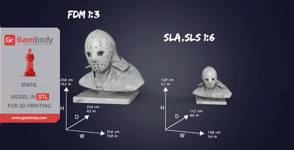 - 6 versions of Jason Bust STL files for FFF/FDM, DLP/SLA, DLP/SLA Eco, and SLS - files for each version are available for download after the purchase