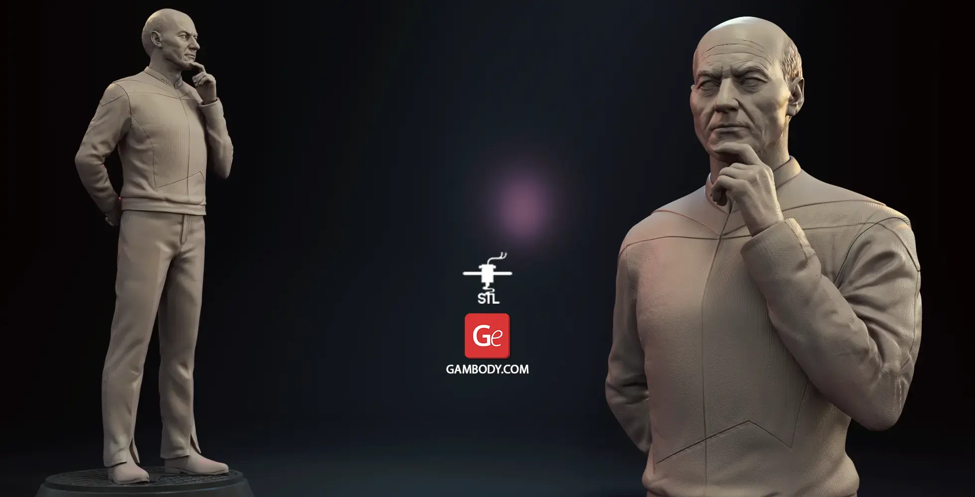 - This high-fidelity model captures Captain Jean-Luc Picard in a contemplative, full-body standing pose atop a textured Starfleet delta base.