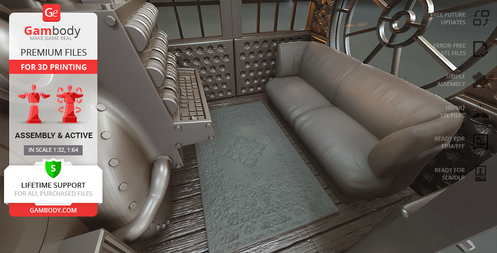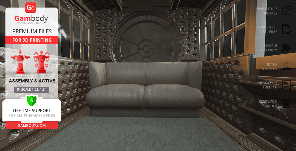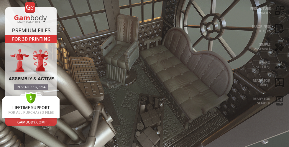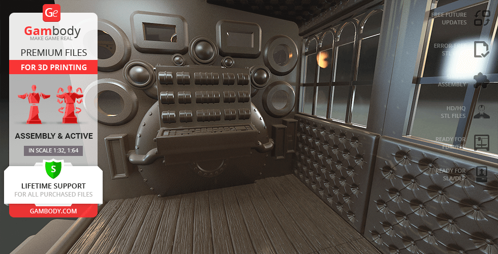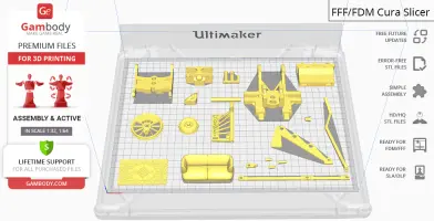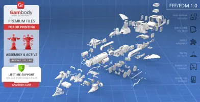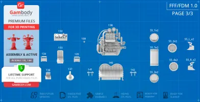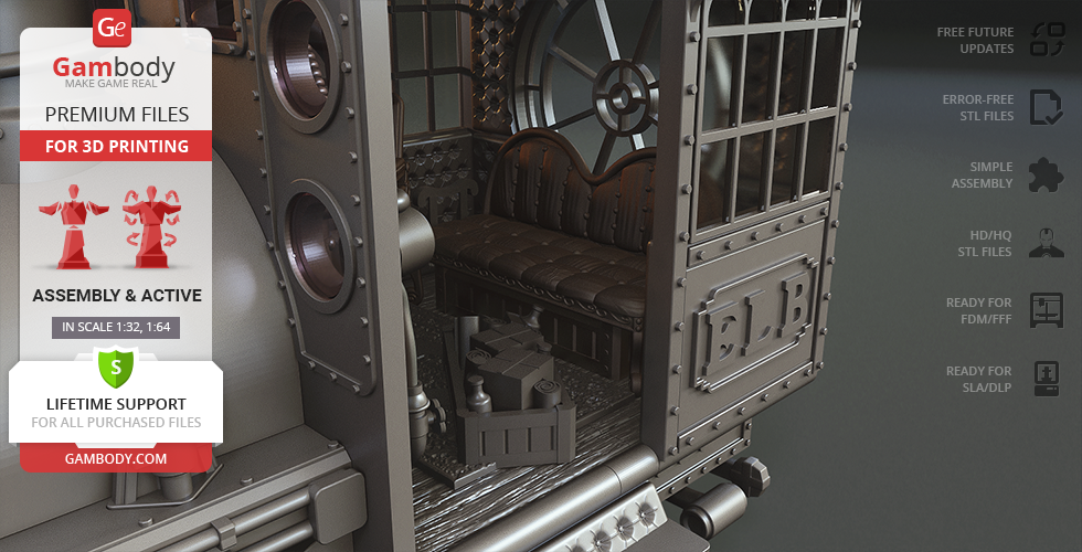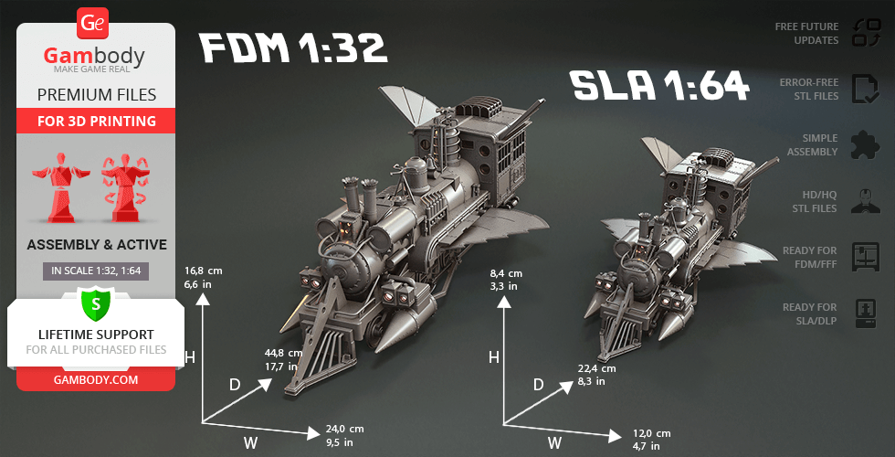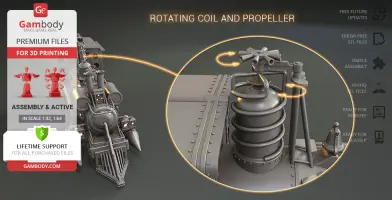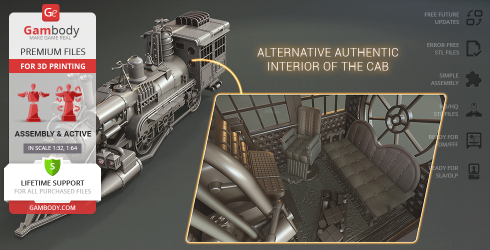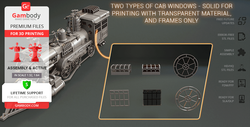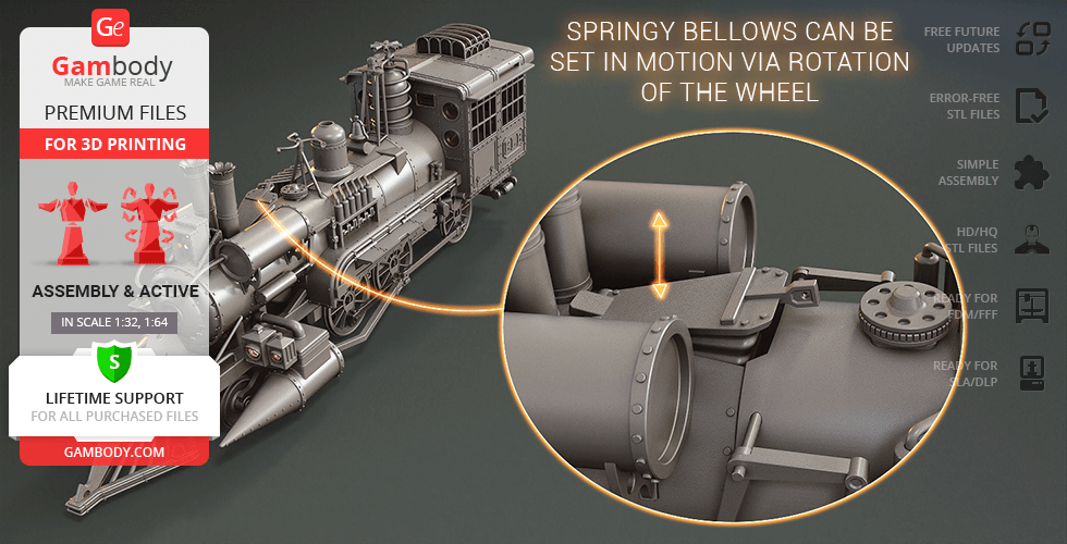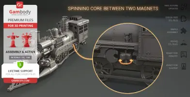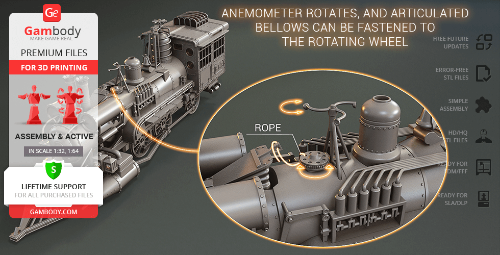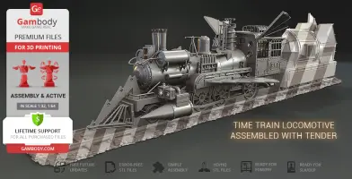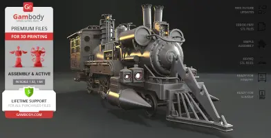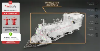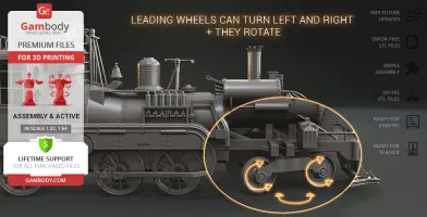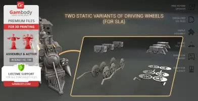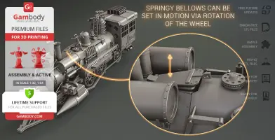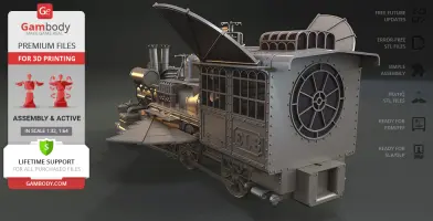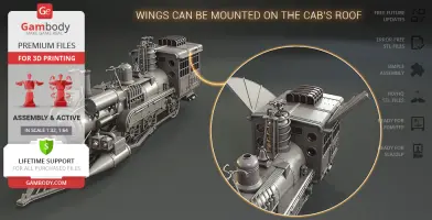 FFF/FDM 1.0 version features:- Contains 142 parts;- A printed model is 168 mm tall, 240 mm wide, 448 mm deep;- Gull-wing door and folding step open to access the interior of the cab that boasts an exceptional level of detail;- There are two interior options for you to choose from;- Synchronised rotation of driving wheels is ensured by an authentic active mechanism of locomotive’s runninggear;- Two front leading axles turn left and right + leading wheels can also rotate;- One pair of "time travel" wings can be mounted on the cab’s roof, another can be installed on each side of the locomotive once you lift the covers;- Driving wheels (all 9 of them) can fold to imitate the train’s flight;- There are two types of cab windows - solid frames with window glasses for printing with transparent filament, and frames only;- The locomotive's boiler features a lot of articulatedelements: rotating coilpropeller, and anemometer;- Also, there are springy bellows that can be fastened to the rotating wheel with a rope and set in motion via rotation of the wheel;- Spinning core is located between two magnets on the side of the locomotive;- There is a spot to install the rotating adjustable grip connector and attach the Jules Verne Train Tender;- You can light up the model's headlampboiler lamp, and cabLED wiring can be easily installed throughout the body of the vehicle, while the battery can be hidden inside the cab or in Jules Verne Train Tender;- The assembly of the version's parts requires additional "pins" made out of short pieces of regular 1.75mm filament;- All parts are divided in such a way that you will print them with the smallest number of support structures.