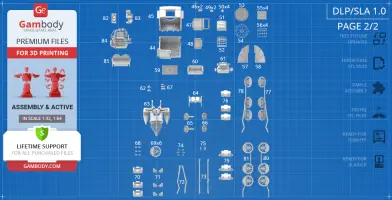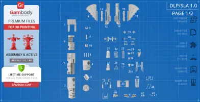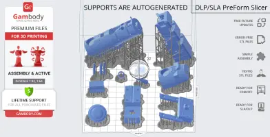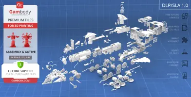 DLP/SLA/SLS 1.0 version features:- Contains 85 parts;- A printed model is 84 mm tall, 120 mm wide, 224 mm deep;- Gull-wing door and folding step open to access the interior of the cab that boasts an exceptional level of detail;- There are two interior options for you to choose from;- Synchronised rotation of driving wheels is ensured by an authentic active mechanism of locomotive’s runninggear;- Two front leading axles turn left and right + leading wheels can also rotate;- This version also features two static variants of driving wheels - usual and folded for flight;- One pair of "time travel" wings can be mounted on the cab’s roof, another can be installed on each side of the locomotive once you lift the covers;- Driving wheels (all 9 of them) can fold to imitate the train’s flight;- There are two types of cab windows - solid frames with window glasses for printing with transparent material, and frames only;- The locomotive's boiler features a lot of articulatedelements: rotating coilpropeller, and anemometer;- Also, there are springy bellows that can be fastened to the wheel with a rope;- Spinning core is located between two magnets on the side of the locomotive;- There is a spot to install the rotating adjustable grip connector and attach the Jules Verne Train Tender;- You can light up the model's headlampboiler lamp, and cabLED wiring can be easily installed throughout the body of the vehicle, while the battery can be hidden inside the cab or in Jules Verne Train Tender;- The assembly of the version's parts requires additional "pins" made out of short pieces of a regular paper clip;- All parts are divided in such a way to fit the build plates and to ensure that support structures are generated where needed.