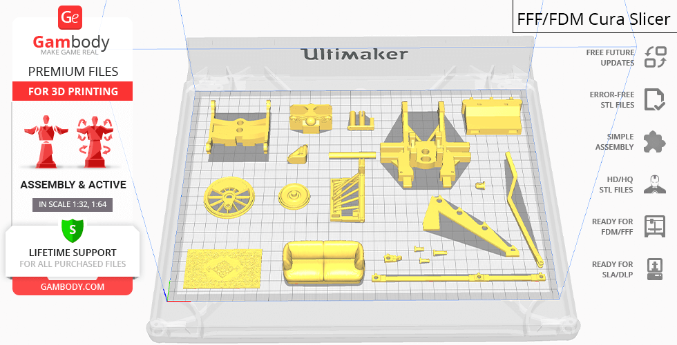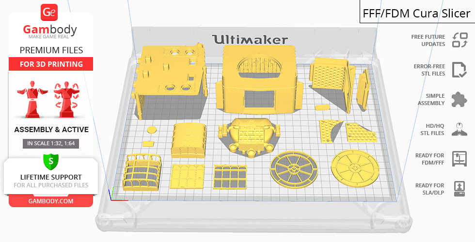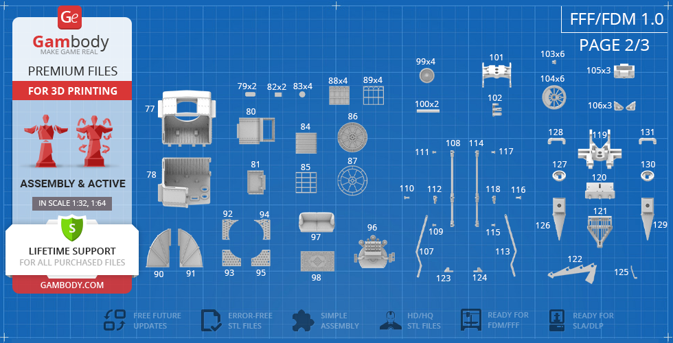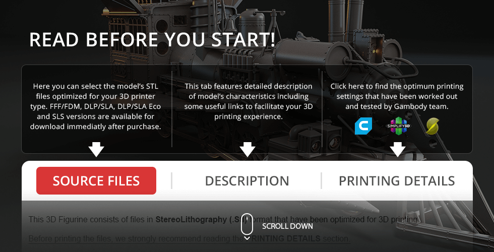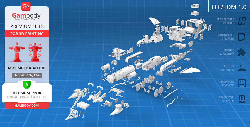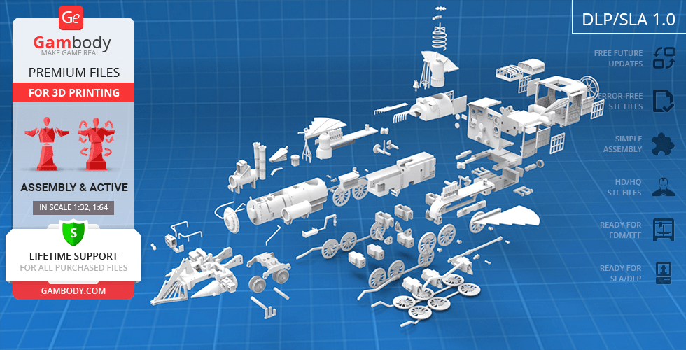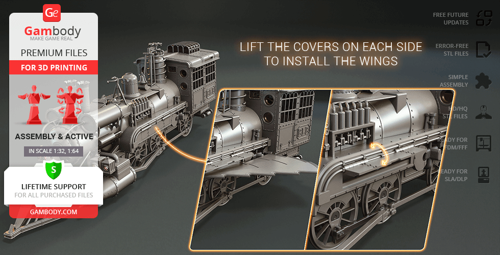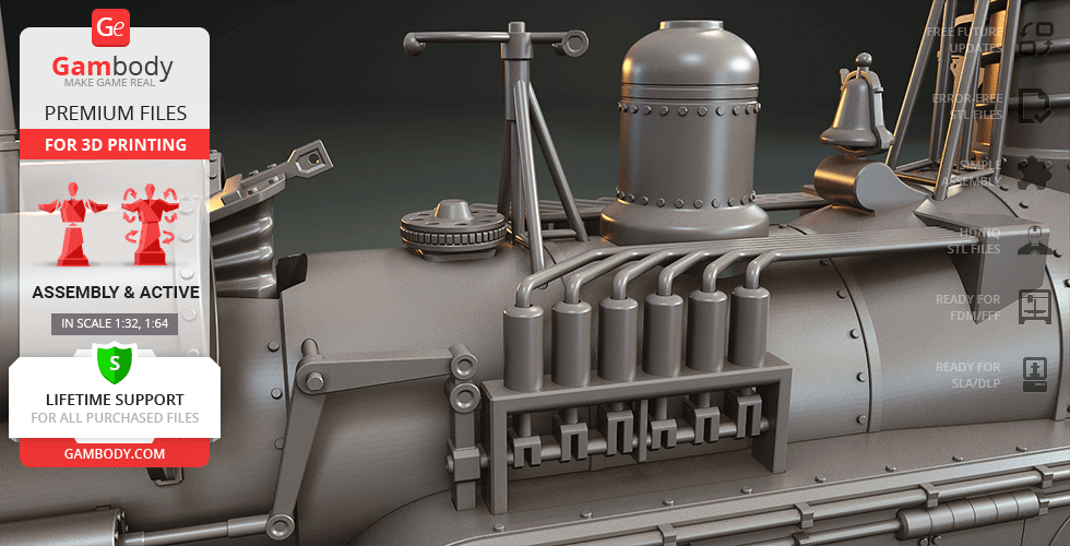 All assembly parts are provided in STL files of FFF/FDM version in recommended positions that were worked out in order to ensure the smoothness of the details’ surfaces after printing and so that the 3D printing beginners won't face difficulties when placing the parts on a build plate. We highly recommend that you get acquainted with the “Assembly video” and "Assembly Manual" before getting down to the Jules Verne Train Locomotive model.