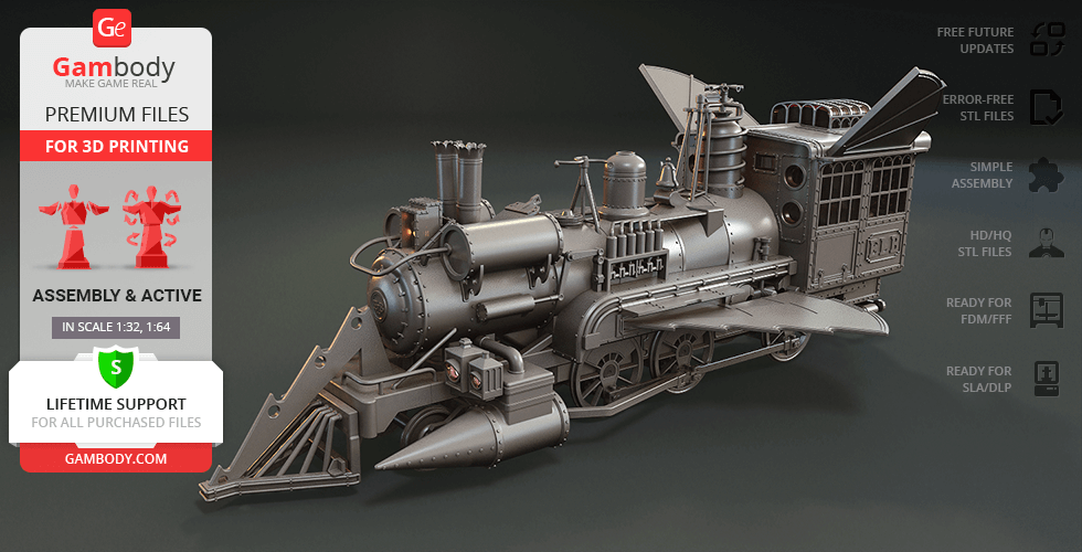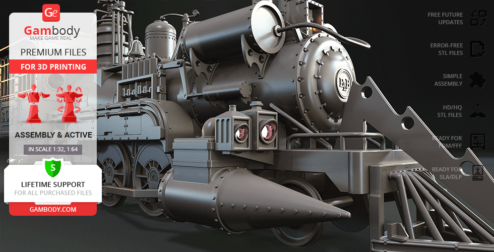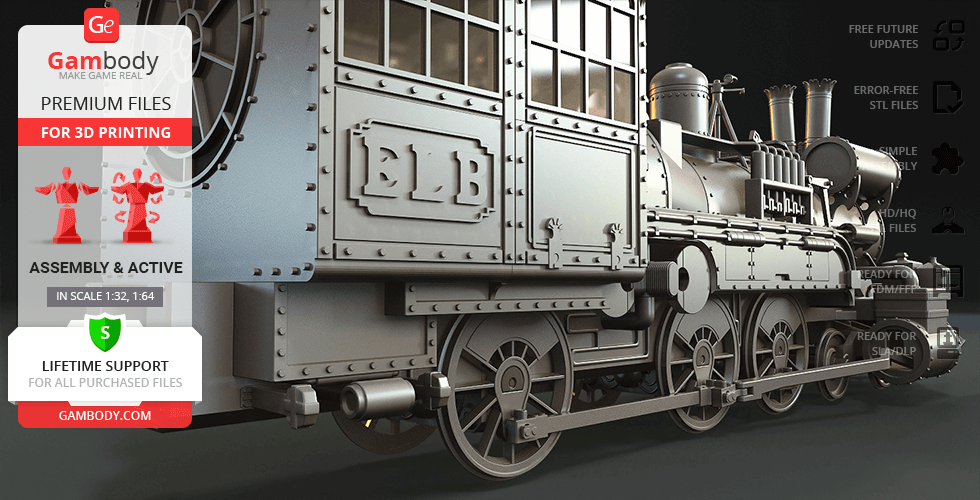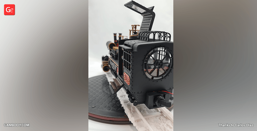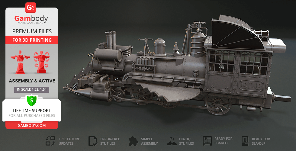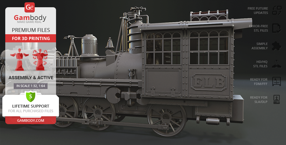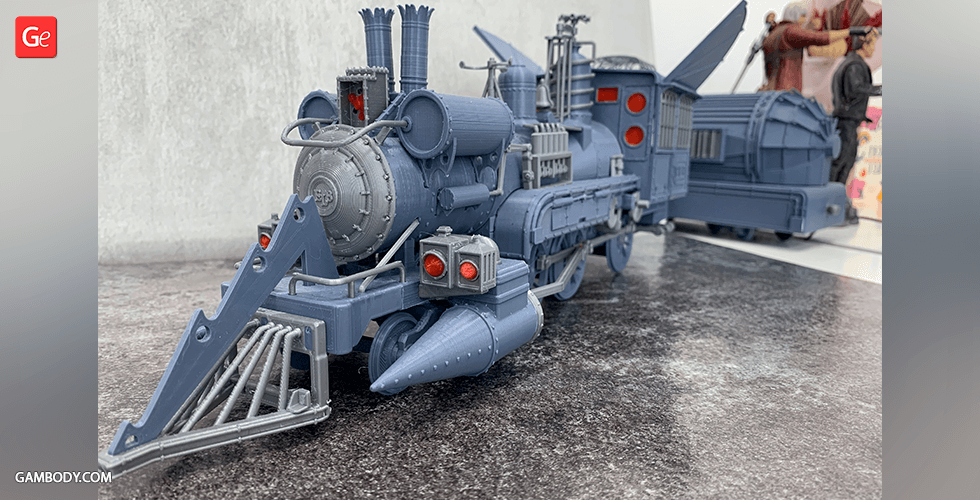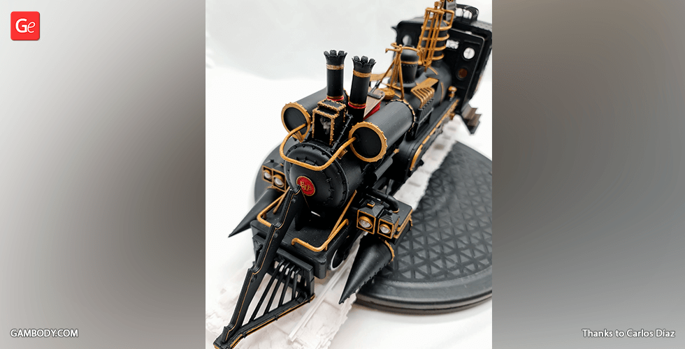 Jules Verne Train Locomotive 3D printing model is a highly detailed assembly model and its moderation and adaptation for different types of 3D printers took Gambody team 120 hours in total. In order to preserve the accurate likeness of the original Sierra No. 3 ‘The Movie Star locomotive’ as well as the modified movie Jules Verne “ELB” Train, the model was divided into many parts that are to be assembled as if a real locomotive. Taking into account the willingness of our customers to make their 3D printing projects as true to life as possible, Gambody team worked on the highly-articulated assembly of the locomotive that presupposes active runninggear and a variety of movable elements.