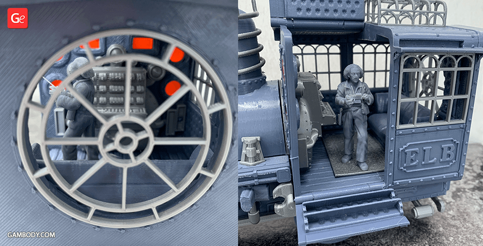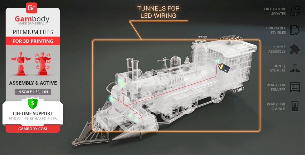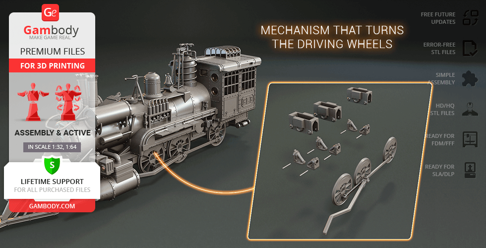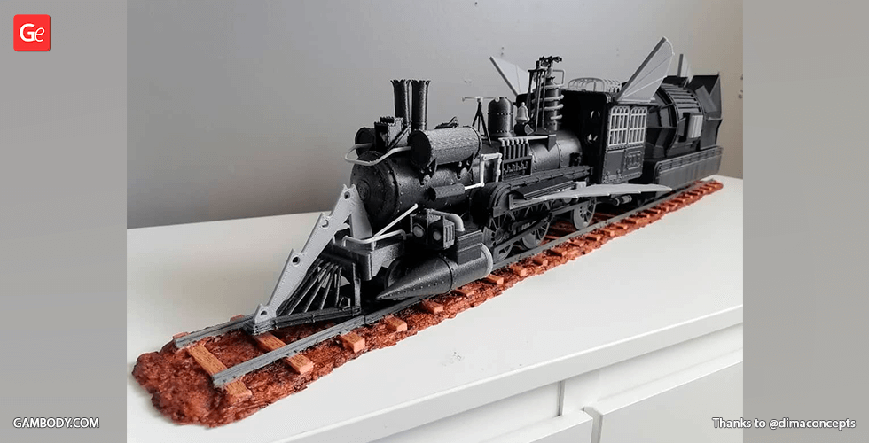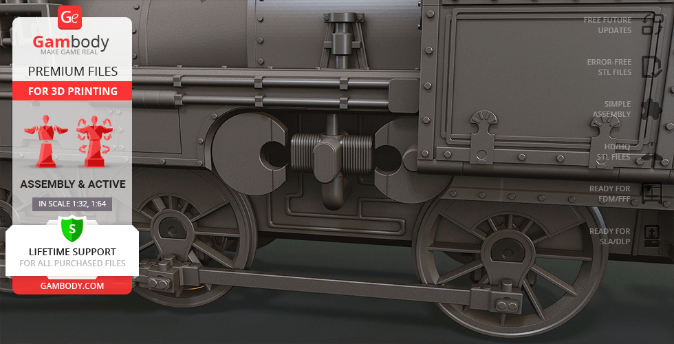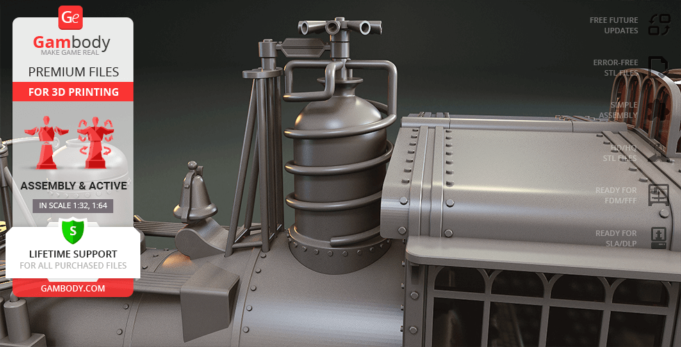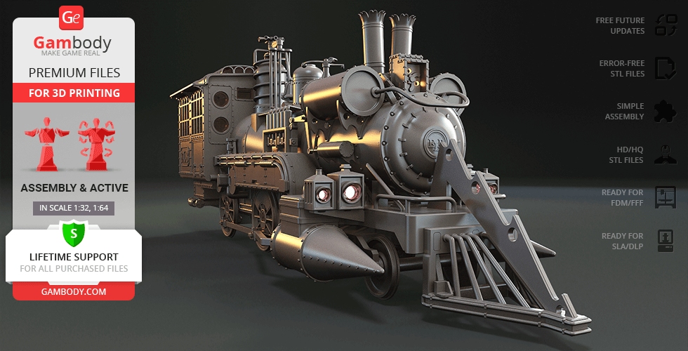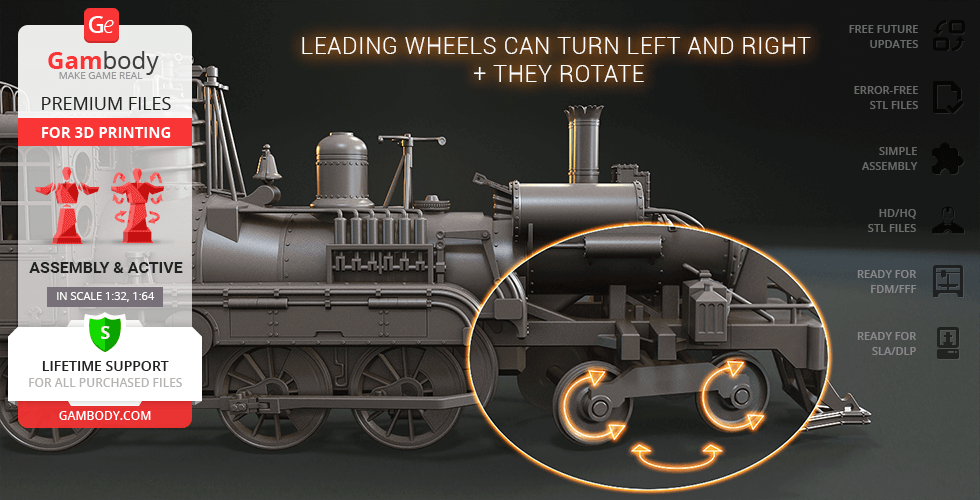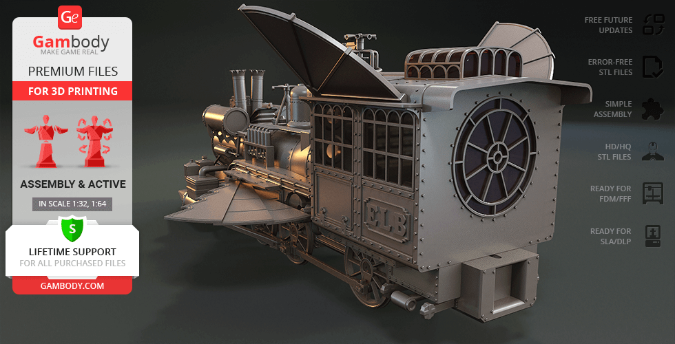 Jules Verne Train Locomotive 3D printing model is a highly detailed assembly model and its moderation and adaptation for different types of 3D printers took Gambody team 120 hours in total. In order to preserve the accurate likeness of the original Sierra No. 3 ‘The Movie Star locomotive’ as well as the modified movie Jules Verne “ELB” Train, the model was divided into many parts that are to be assembled as if a real locomotive. Taking into account the willingness of our customers to make their 3D printing projects as true to life as possible, Gambody team worked on the highly-articulated assembly of the locomotive that presupposes active runninggear and a variety of movable elements.
