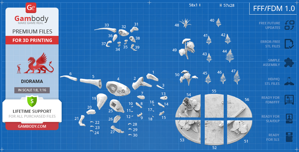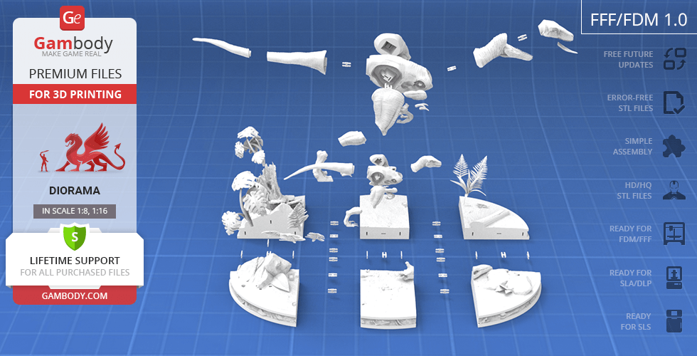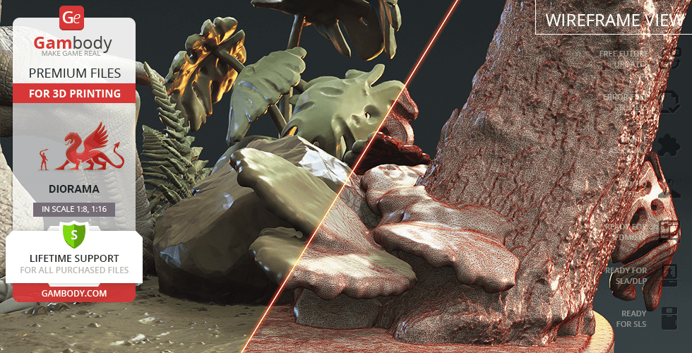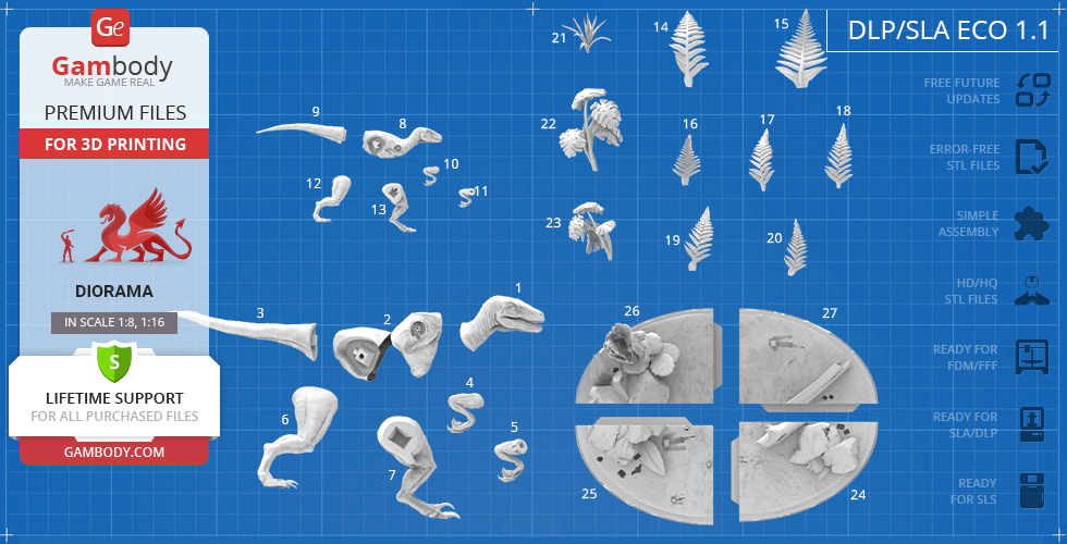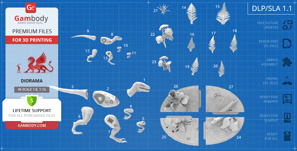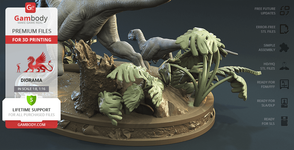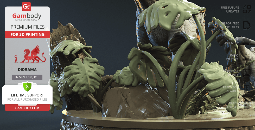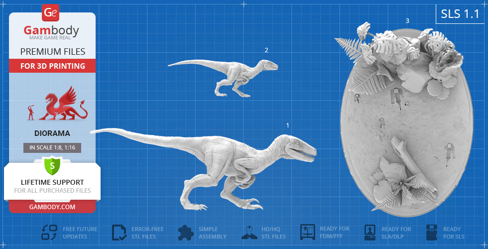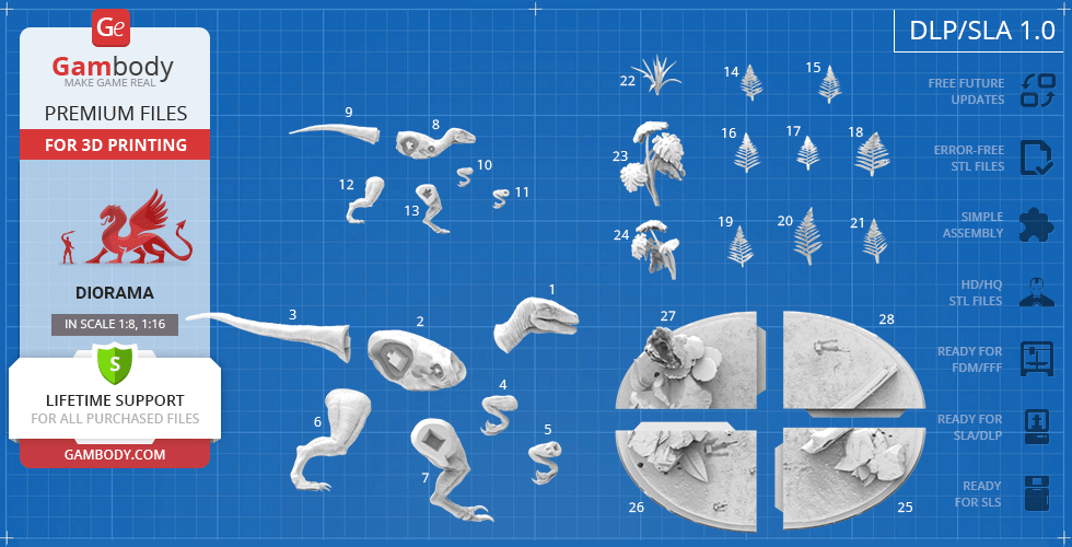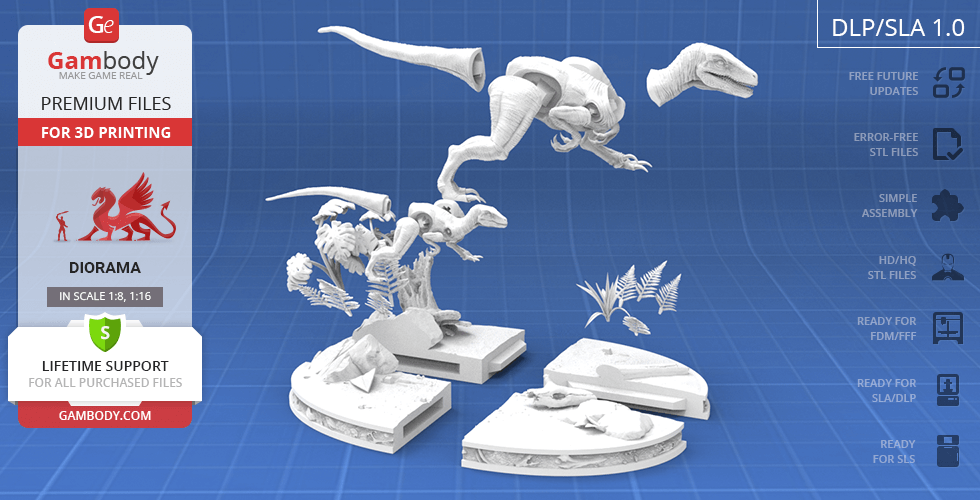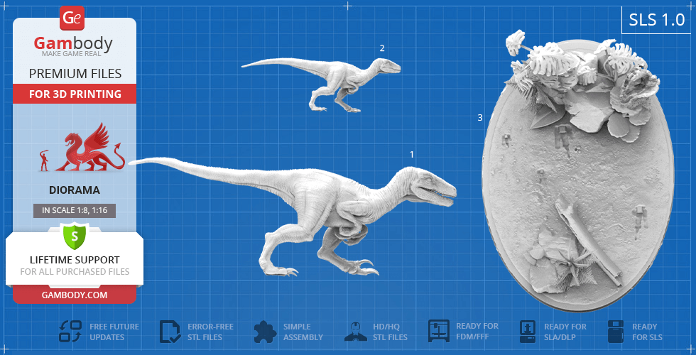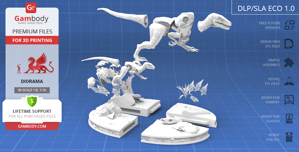 - 8 versions of Blue & Baby Hunting in Diorama STL files — original and updated FFF/FDM, DLP/SLA, DLP/SLA Eco, and SLS — files for all versions are available for download after the purchase;