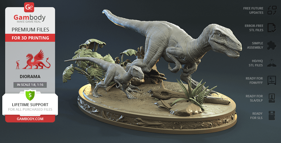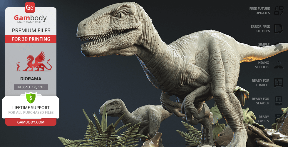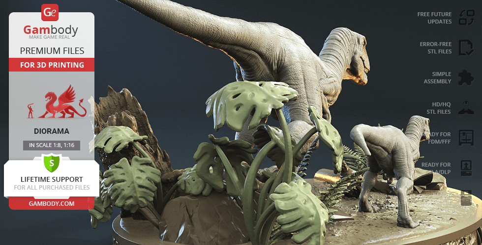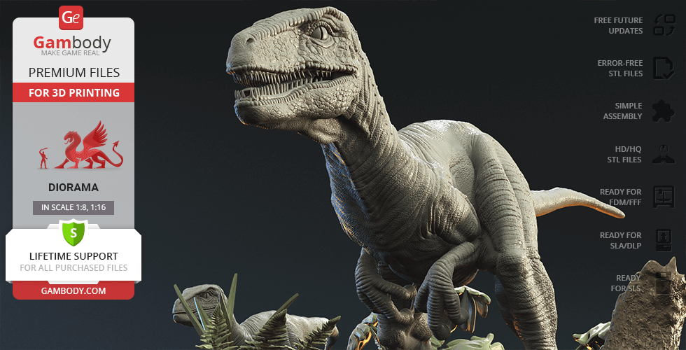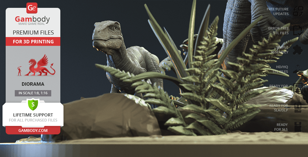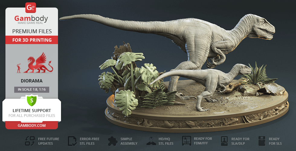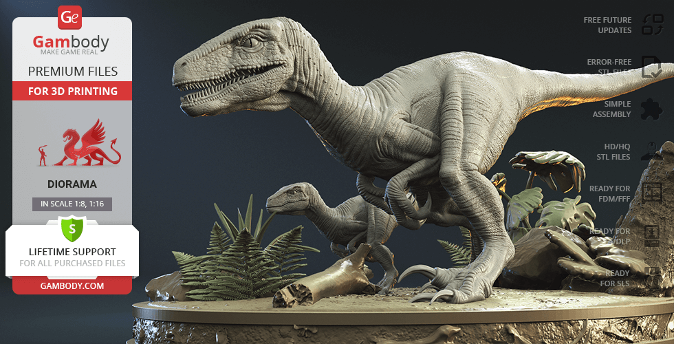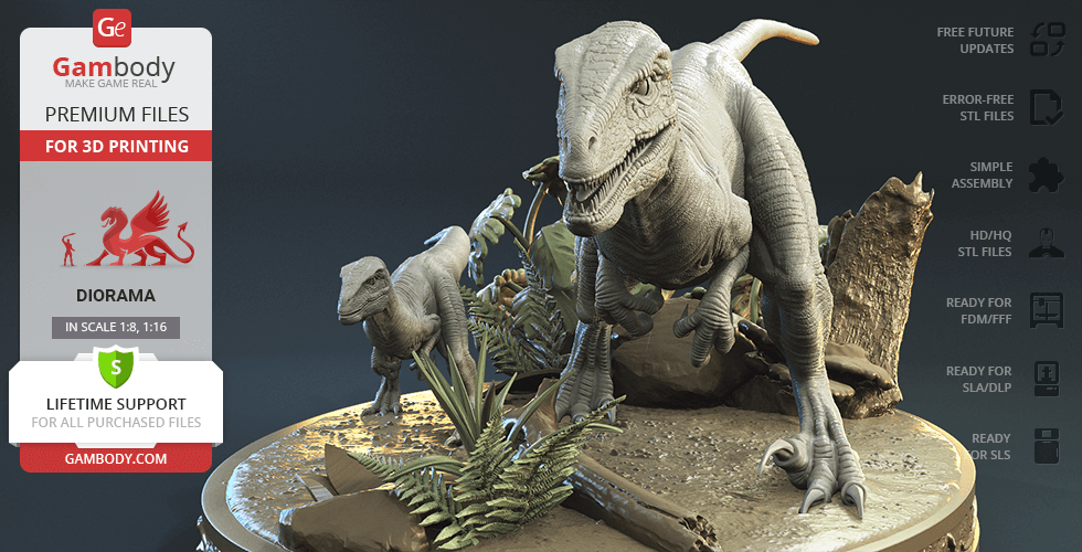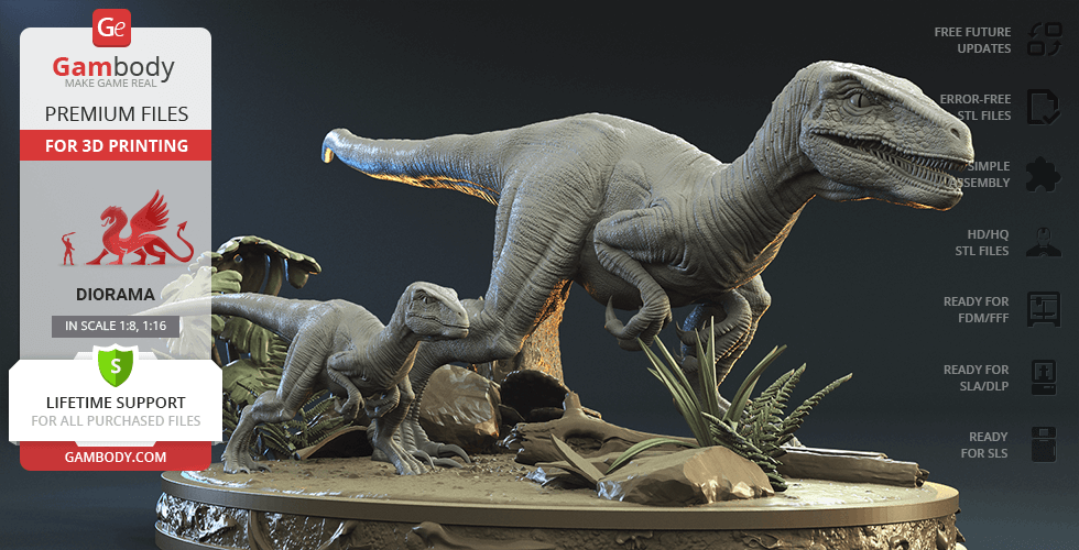 Do you still remember Velociraptor Blue being a playful little creature? Now that many years have passed, Blue has a Baby of her own and teaches it to co-exist with humans and survive in the wild. In the fantastically detailed Blue & Baby Hunting diorama, the two of them are threading through a forest with the focus of chilling predators searching for a lovely family dinner. They invite you to join the hunt and observe just how fascinating nature, or its 3D printed form, is!