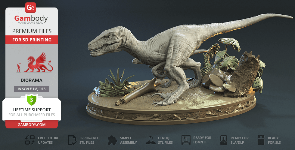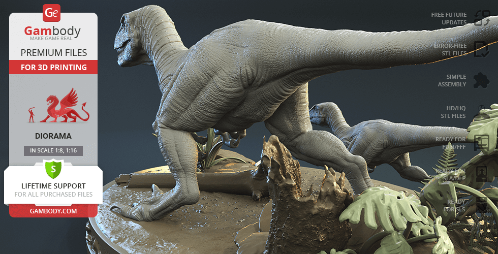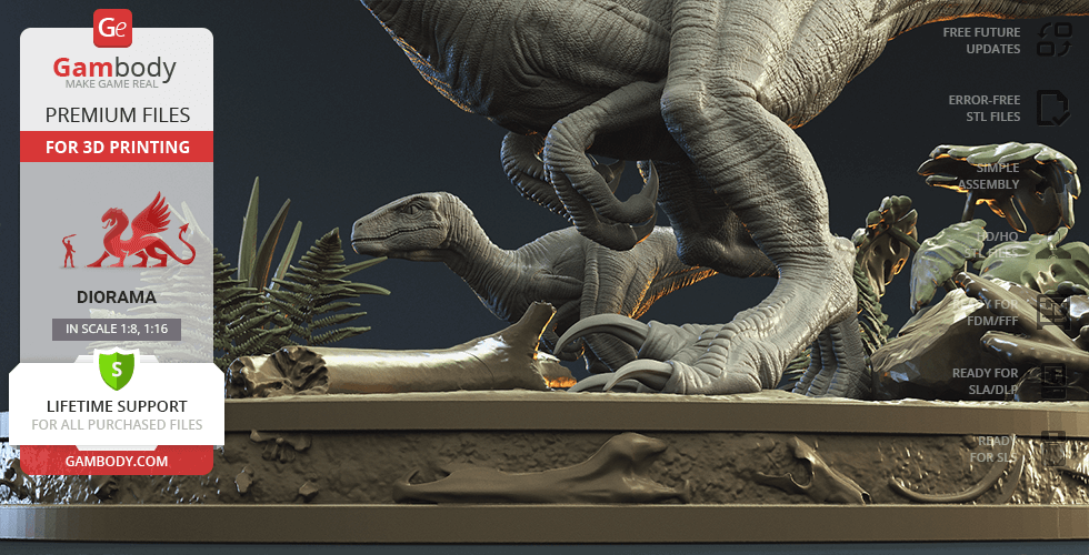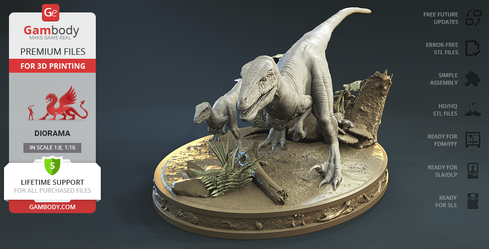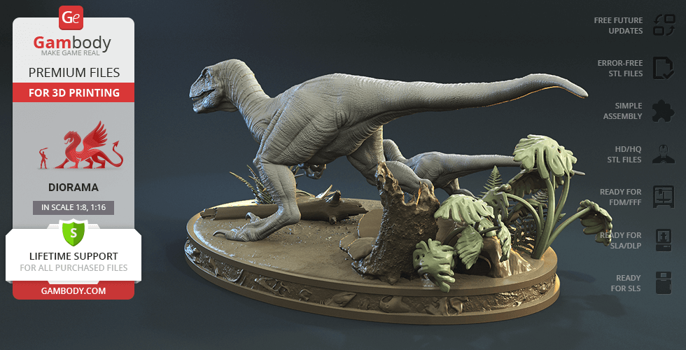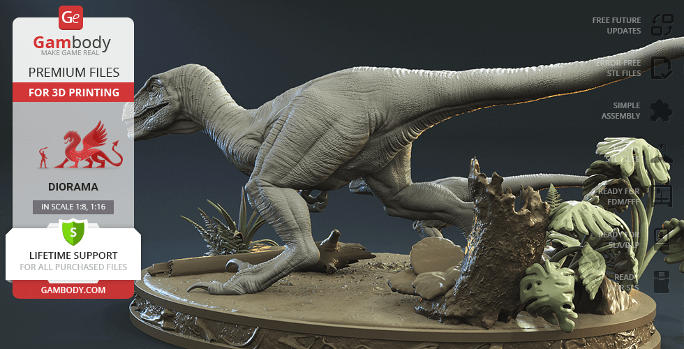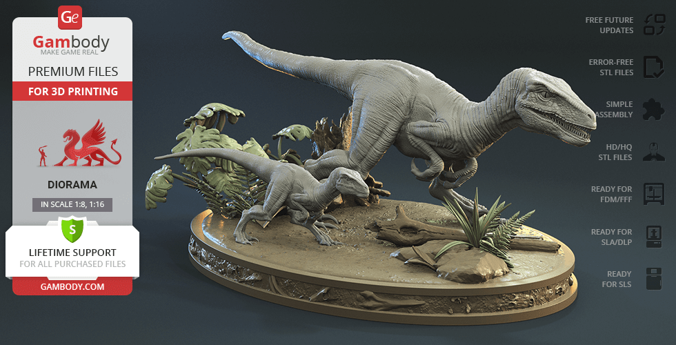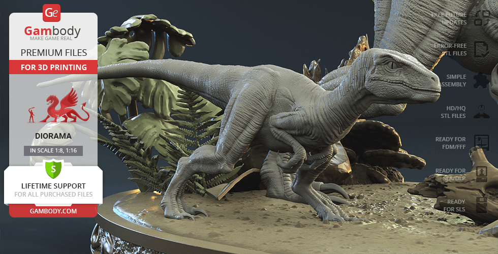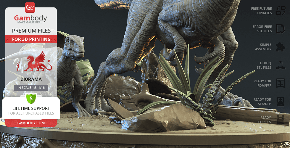 Do you still remember Velociraptor Blue being a playful little creature? Now that many years have passed, Blue has a Baby of her own and teaches it to co-exist with humans and survive in the wild. In the fantastically detailed Blue & Baby Hunting diorama, the two of them are threading through a forest with the focus of chilling predators searching for a lovely family dinner. They invite you to join the hunt and observe just how fascinating nature, or its 3D printed form, is!