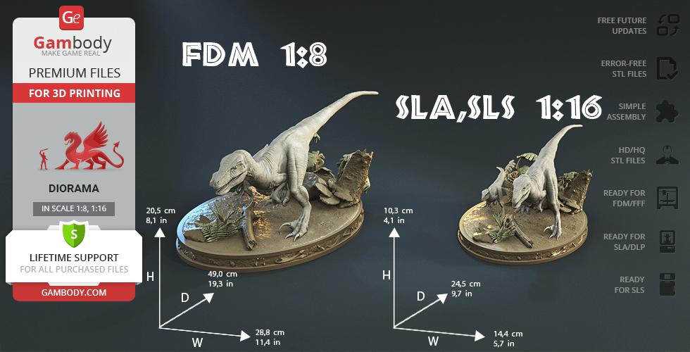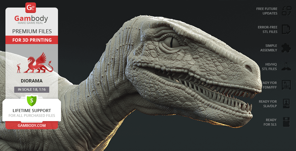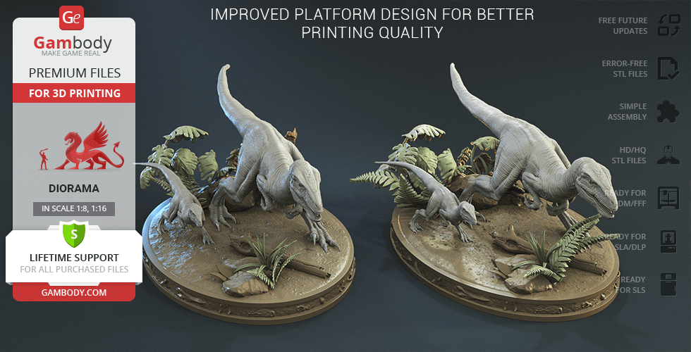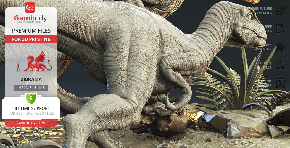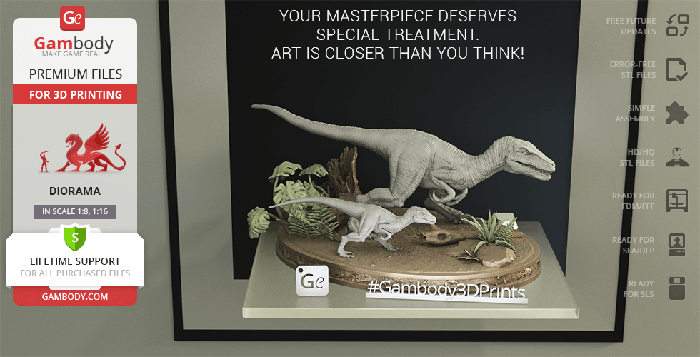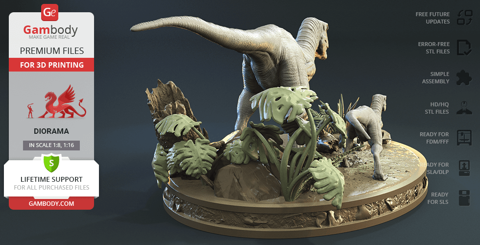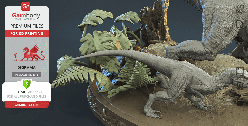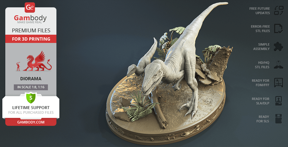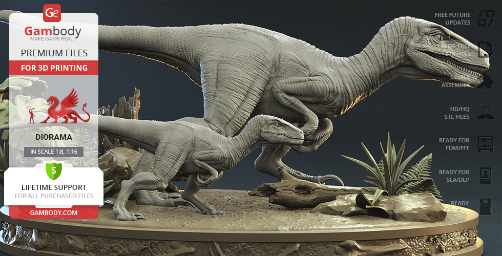 Do you still remember Velociraptor Blue being a playful little creature? Now that many years have passed, Blue has a Baby of her own and teaches it to co-exist with humans and survive in the wild. In the fantastically detailed Blue & Baby Hunting diorama, the two of them are threading through a forest with the focus of chilling predators searching for a lovely family dinner. They invite you to join the hunt and observe just how fascinating nature, or its 3D printed form, is!