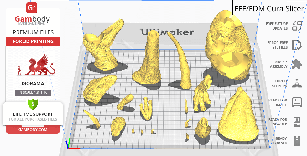 - The model is available in recommended scales of 1:8 for the FFF/FDM version and 1:16 for the DLP/SLA/SLS versions, based on the height of Blue and Baby.