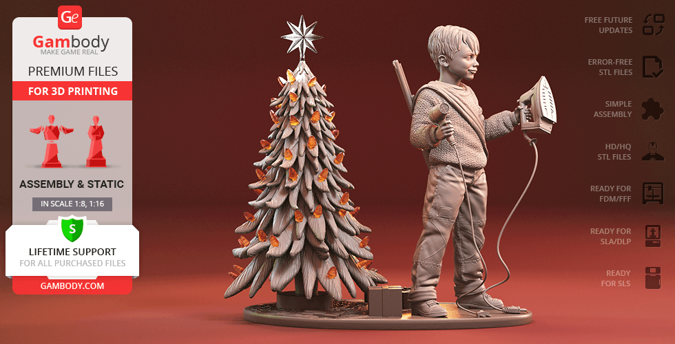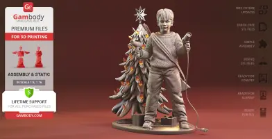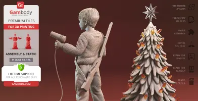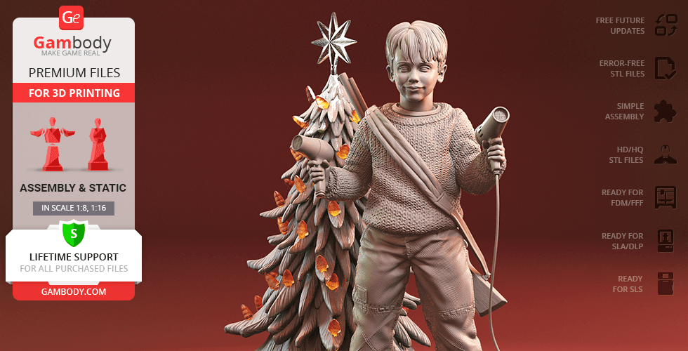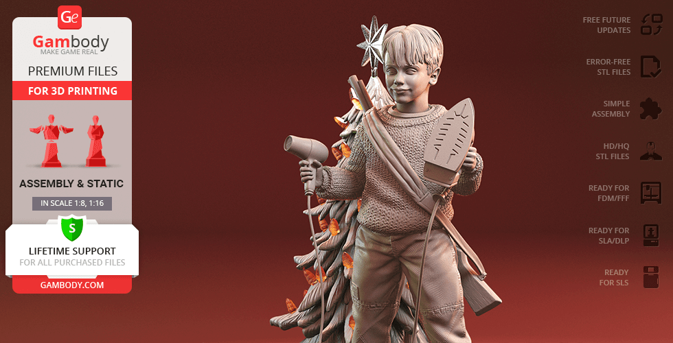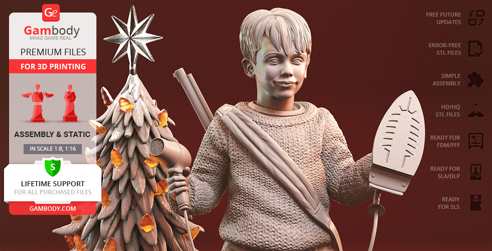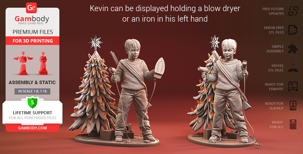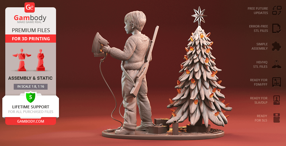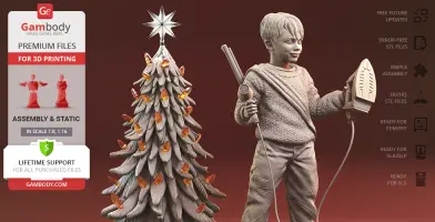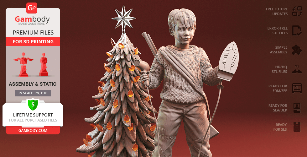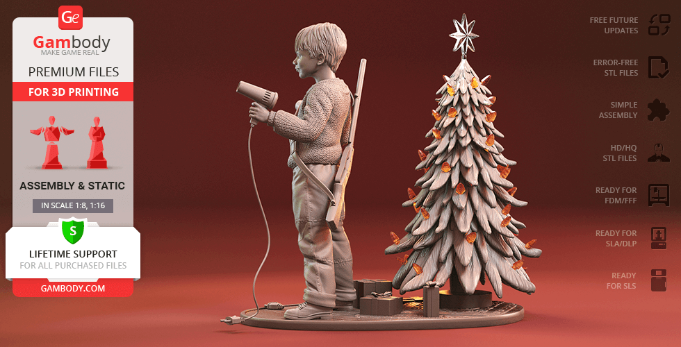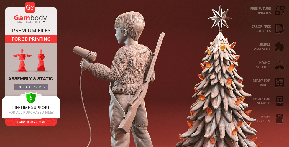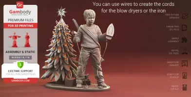 Kevin figurine for 3D printing is a static assembly model and its moderation and adaptation for different types of 3D printers took Gambody team 48 hours in total. Figurine’s anatomy was thoroughly reviewed during the moderation process for the resourceful kid to be depicted harmoniously in the intended pose. The model’s cutting was chosen by our team to minimise the amount of filament needed for generated support and some of the parts were hollowed out for you to save resin in the figurine’s Eco version. In order to conceal the places where the assembly parts of the model must be connected, the figurine was cut along the contour of Kevin’s clothes seams. For the same purpose, the blow dryers were extracted from Kevin’s hold, while the Daisy BB gun was “taken off” and separated from the sling. Every single piece of decoration on the Christmas tree, as well as the star on top, were separated as well. For you to achieve the cleanest 3D printed result, the figurine’s head, shoes, hands, blow dryers, iron, gun, sling, plugs, etc. are provided as separate files. The cords do not come with STL files but can be made of a wire, a thin cable, a thick string, etc. All the assembly parts come in STL files in recommended positions that were worked out in order to ensure the smoothness of the details’ surfaces after printing and so that the 3D printing beginners won't face difficulties when placing the parts on a build plate. When downloading any figurine's file you will also receive "Assembly Manual" for FFF/FDM 1.0 and DLP/SLA 1.0 versions in PDF format.