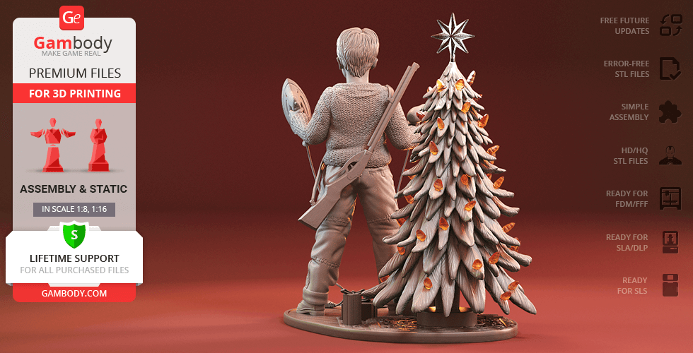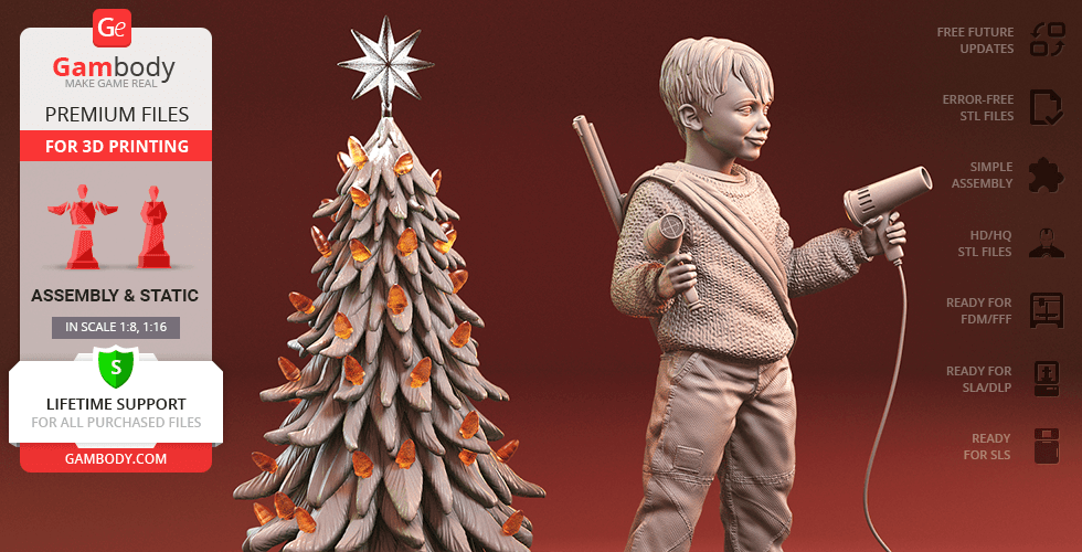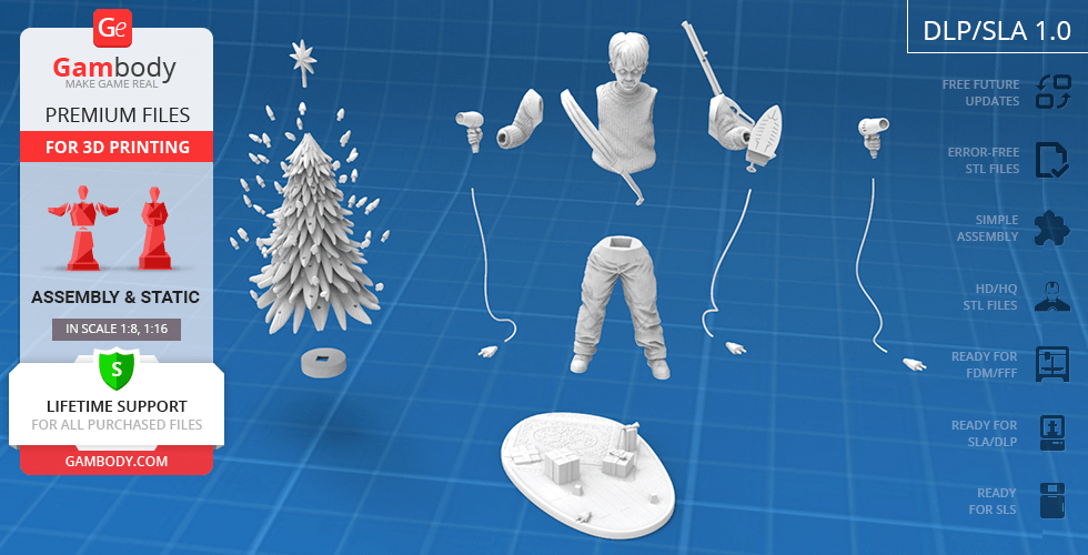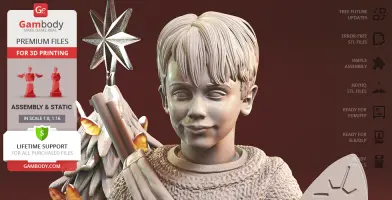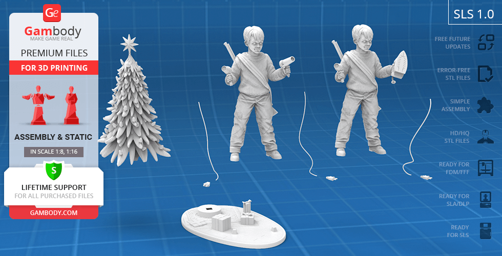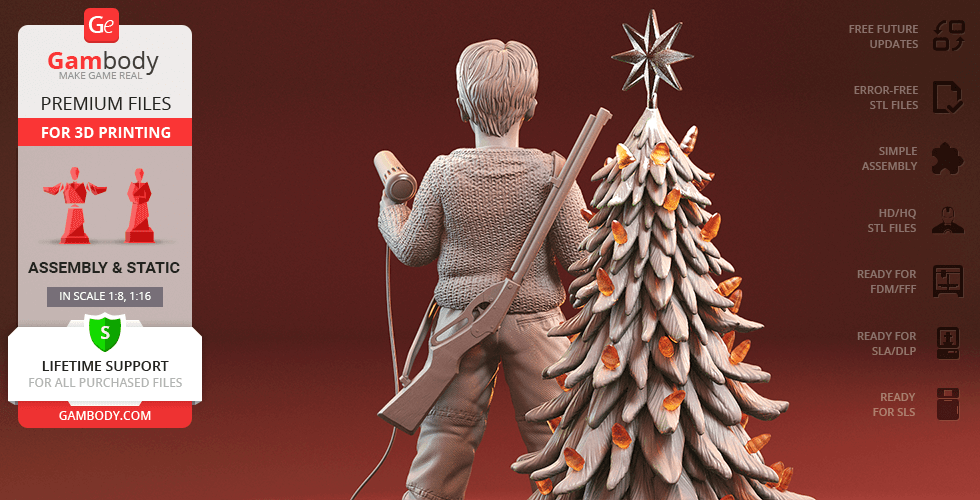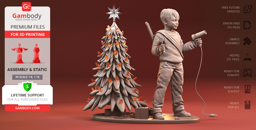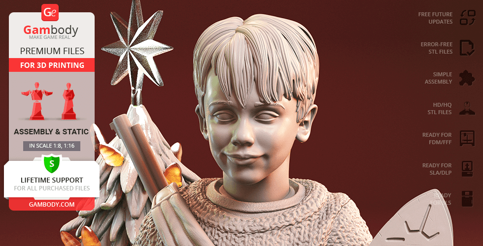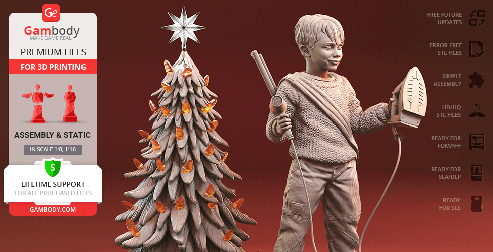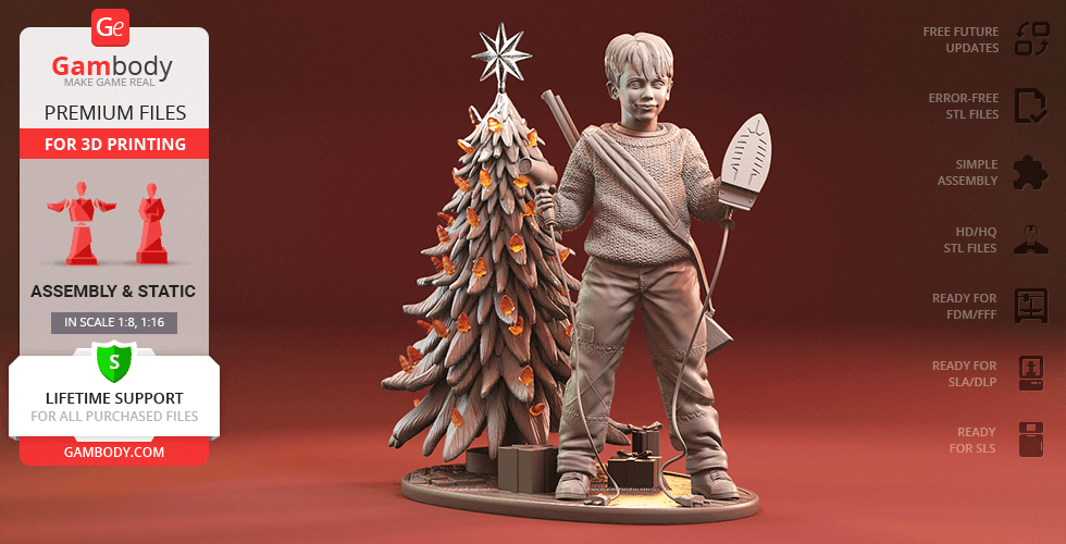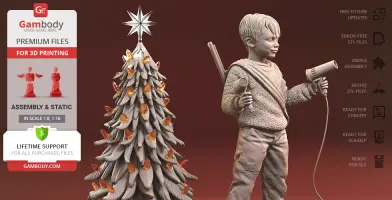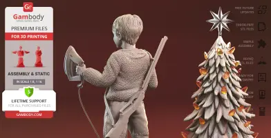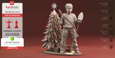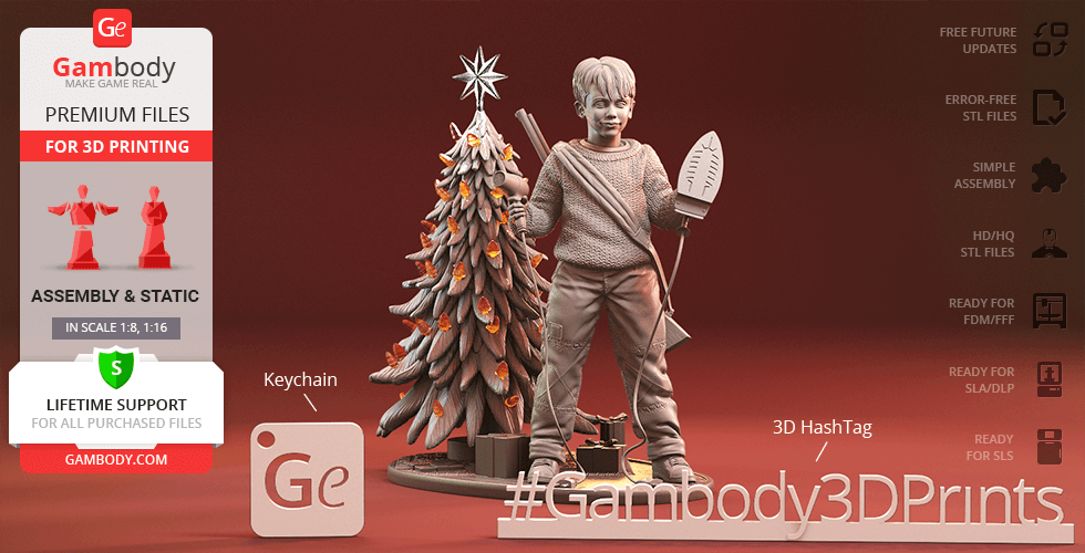 Kevin figurine for 3D printing is a static assembly model and its moderation and adaptation for different types of 3D printers took Gambody team 48 hours in total. Figurine’s anatomy was thoroughly reviewed during the moderation process for the resourceful kid to be depicted harmoniously in the intended pose. The model’s cutting was chosen by our team to minimise the amount of filament needed for generated support and some of the parts were hollowed out for you to save resin in the figurine’s Eco version. In order to conceal the places where the assembly parts of the model must be connected, the figurine was cut along the contour of Kevin’s clothes seams. For the same purpose, the blow dryers were extracted from Kevin’s hold, while the Daisy BB gun was “taken off” and separated from the sling. Every single piece of decoration on the Christmas tree, as well as the star on top, were separated as well. For you to achieve the cleanest 3D printed result, the figurine’s head, shoes, hands, blow dryers, iron, gun, sling, plugs, etc. are provided as separate files. The cords do not come with STL files but can be made of a wire, a thin cable, a thick string, etc. All the assembly parts come in STL files in recommended positions that were worked out in order to ensure the smoothness of the details’ surfaces after printing and so that the 3D printing beginners won't face difficulties when placing the parts on a build plate. When downloading any figurine's file you will also receive "Assembly Manual" for FFF/FDM 1.0 and DLP/SLA 1.0 versions in PDF format.