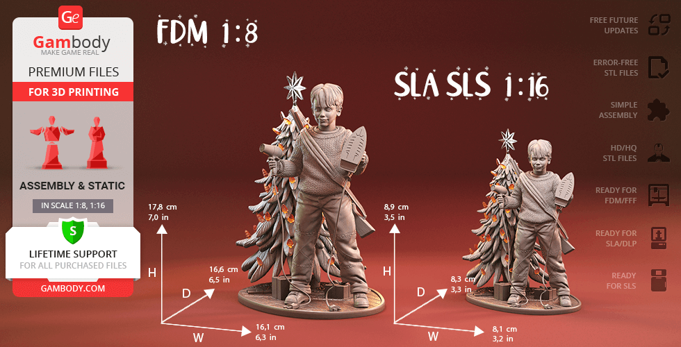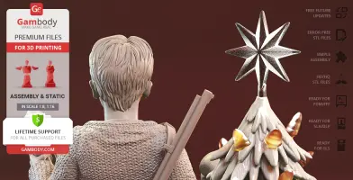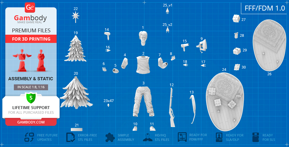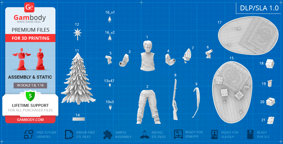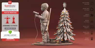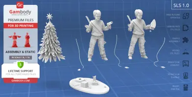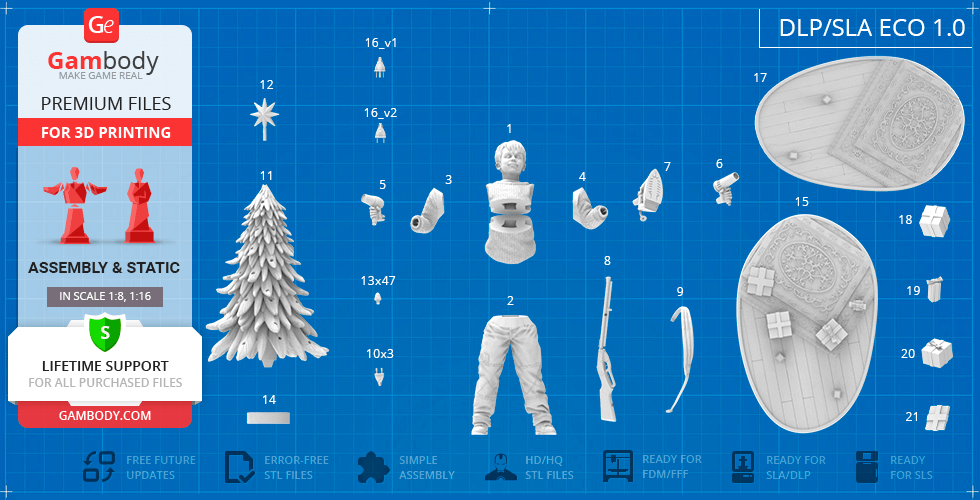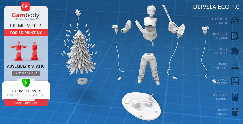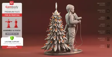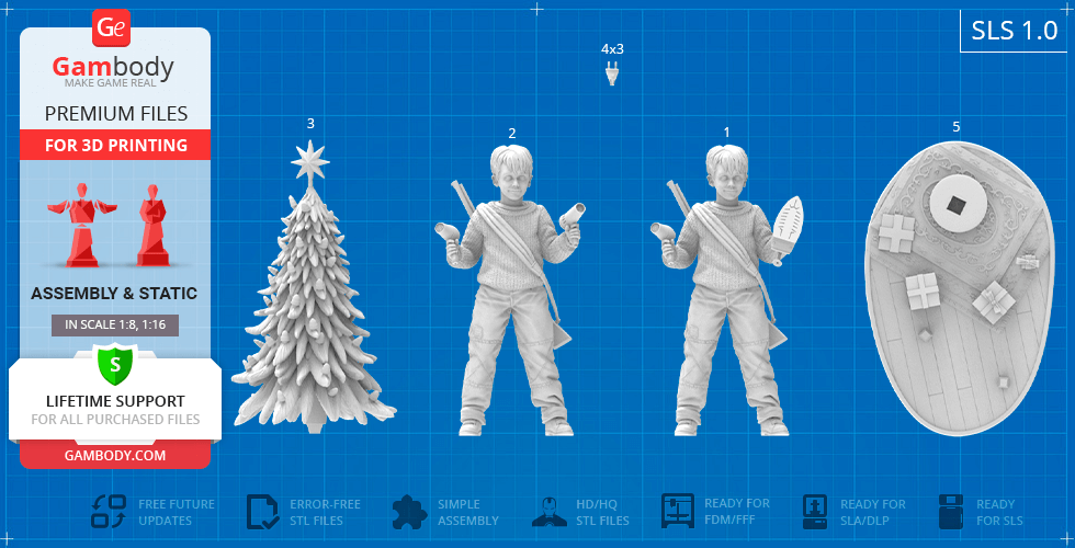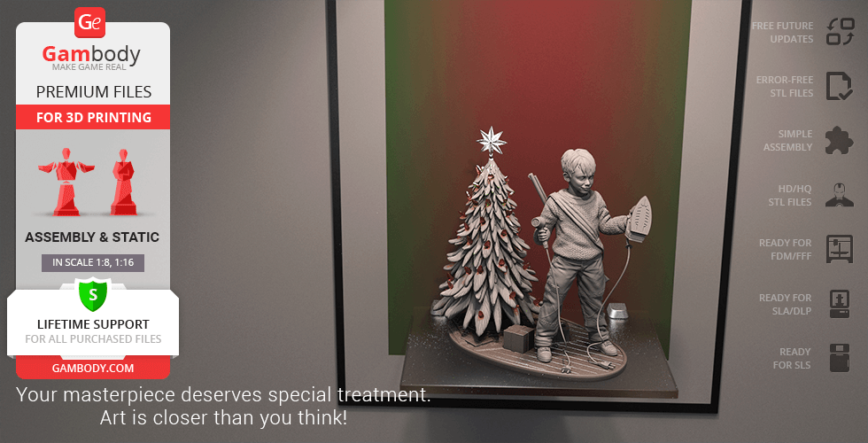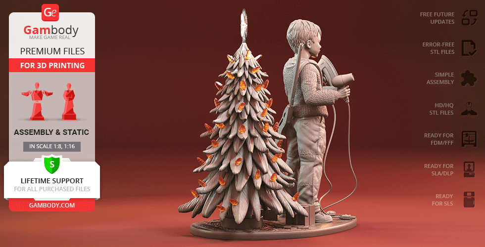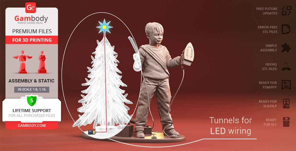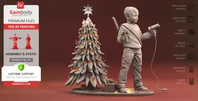 Kevin figurine for 3D printing is a static assembly model and its moderation and adaptation for different types of 3D printers took Gambody team 48 hours in total. Figurine’s anatomy was thoroughly reviewed during the moderation process for the resourceful kid to be depicted harmoniously in the intended pose. The model’s cutting was chosen by our team to minimise the amount of filament needed for generated support and some of the parts were hollowed out for you to save resin in the figurine’s Eco version. In order to conceal the places where the assembly parts of the model must be connected, the figurine was cut along the contour of Kevin’s clothes seams. For the same purpose, the blow dryers were extracted from Kevin’s hold, while the Daisy BB gun was “taken off” and separated from the sling. Every single piece of decoration on the Christmas tree, as well as the star on top, were separated as well. For you to achieve the cleanest 3D printed result, the figurine’s head, shoes, hands, blow dryers, iron, gun, sling, plugs, etc. are provided as separate files. The cords do not come with STL files but can be made of a wire, a thin cable, a thick string, etc. All the assembly parts come in STL files in recommended positions that were worked out in order to ensure the smoothness of the details’ surfaces after printing and so that the 3D printing beginners won't face difficulties when placing the parts on a build plate. When downloading any figurine's file you will also receive "Assembly Manual" for FFF/FDM 1.0 and DLP/SLA 1.0 versions in PDF format.