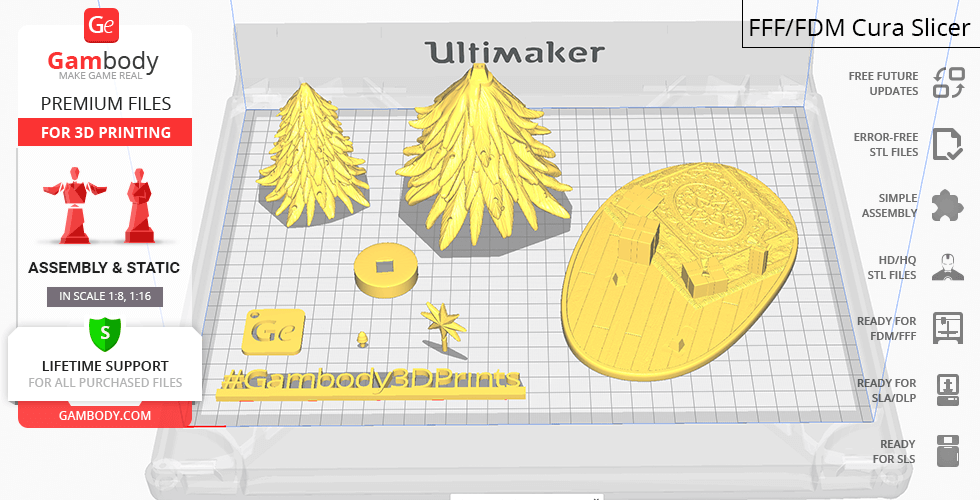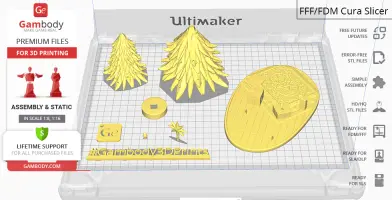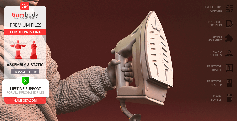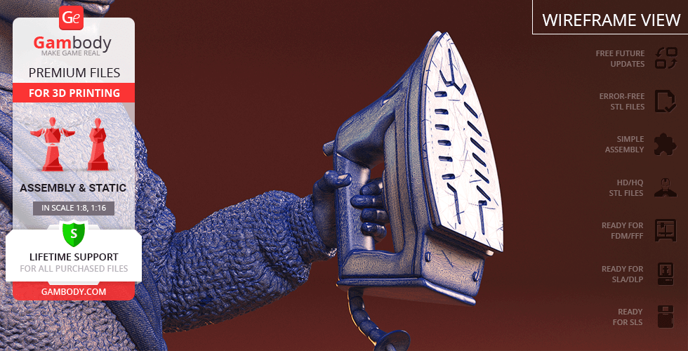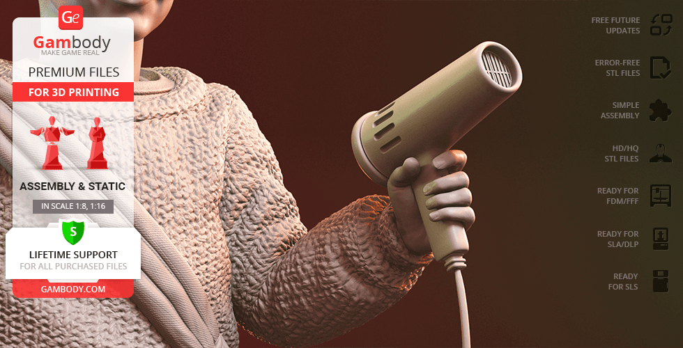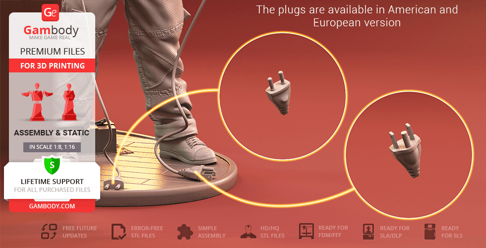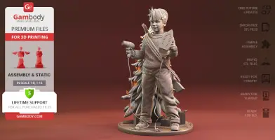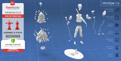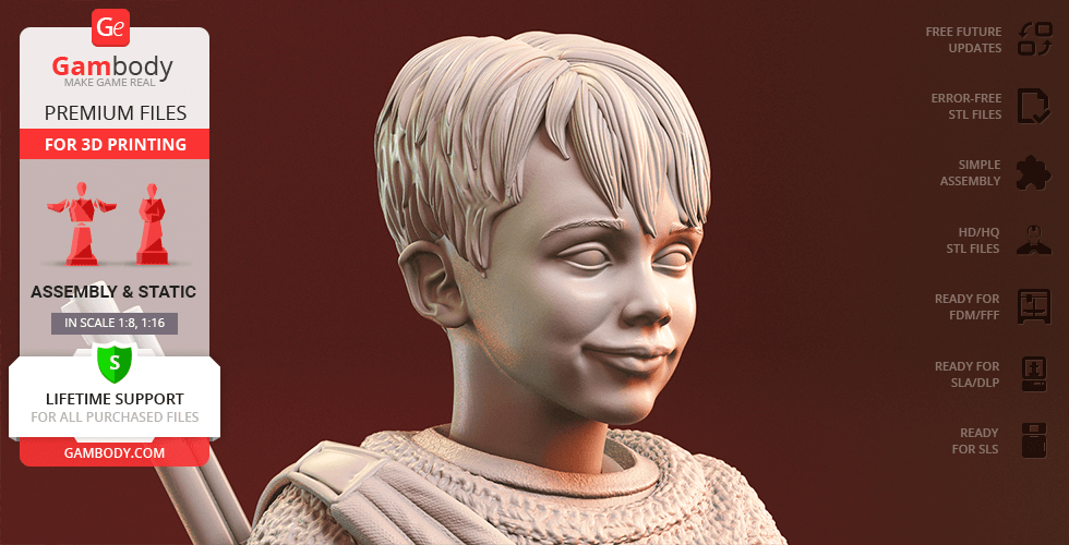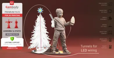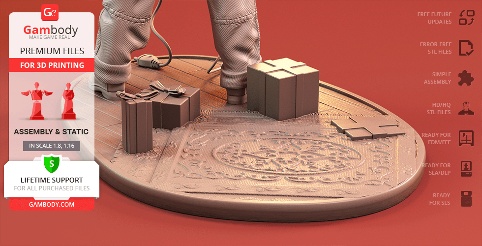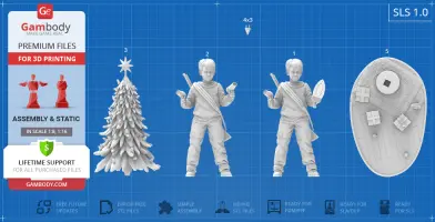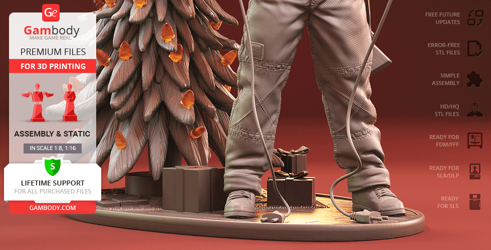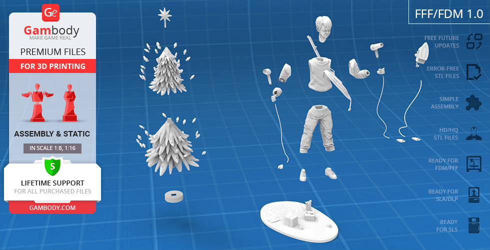 Kevin figurine for 3D printing is a static assembly model and its moderation and adaptation for different types of 3D printers took Gambody team 48 hours in total. Figurine’s anatomy was thoroughly reviewed during the moderation process for the resourceful kid to be depicted harmoniously in the intended pose. The model’s cutting was chosen by our team to minimise the amount of filament needed for generated support and some of the parts were hollowed out for you to save resin in the figurine’s Eco version. In order to conceal the places where the assembly parts of the model must be connected, the figurine was cut along the contour of Kevin’s clothes seams. For the same purpose, the blow dryers were extracted from Kevin’s hold, while the Daisy BB gun was “taken off” and separated from the sling. Every single piece of decoration on the Christmas tree, as well as the star on top, were separated as well. For you to achieve the cleanest 3D printed result, the figurine’s head, shoes, hands, blow dryers, iron, gun, sling, plugs, etc. are provided as separate files. The cords do not come with STL files but can be made of a wire, a thin cable, a thick string, etc. All the assembly parts come in STL files in recommended positions that were worked out in order to ensure the smoothness of the details’ surfaces after printing and so that the 3D printing beginners won't face difficulties when placing the parts on a build plate. When downloading any figurine's file you will also receive "Assembly Manual" for FFF/FDM 1.0 and DLP/SLA 1.0 versions in PDF format.