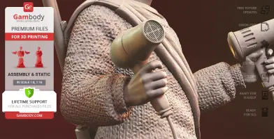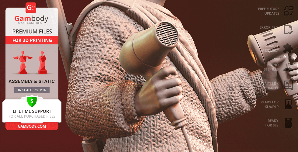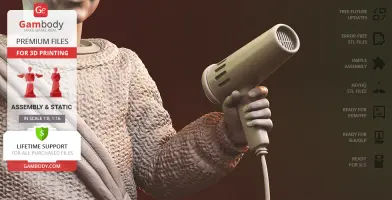 DLP/SLA Eco 1.0 version features:- Contains 16 parts;- A printed model is 89 mm tall, 81 mm wide, 83 mm deep;- Kevin can be displayed holding a blow dryer or an iron in his left hand;- You can use a wire, a thin cable, a thick string, etc. to create the cords for the blow dryers or the iron;- Contains some hollowed out parts to save resin.