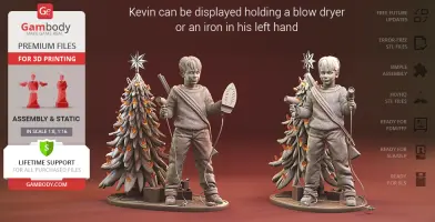 SLS 1.0 version features:- Made as a solid one-piece figurine;- A printed model is 89 mm tall, 81 mm wide, 83 mm deep;- Kevin can be displayed holding a blow dryer or an iron in his left hand;- You can use a wire, a thin cable, a thick string, etc. to create the cords for the blow dryers or the iron;- Contains 5 parts - two figurine variants with the platform separated, the Christmas tree and the plug.