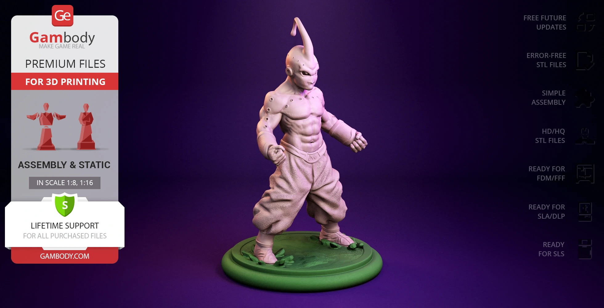 - 4 versions of Kid Buu STL files for FFF/FDM, DLP/SLA, DLP/SLA Eco, and SLS — files for all versions are available for download after the purchase;