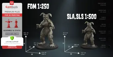 King Caesar for 3D printing is a static assembly model and its moderation and adaptation for different types of 3D printers took the Gambody team 87 hours in total. The 3D print's anatomy and proportions were thoroughly reviewed during the moderation process for the creature.