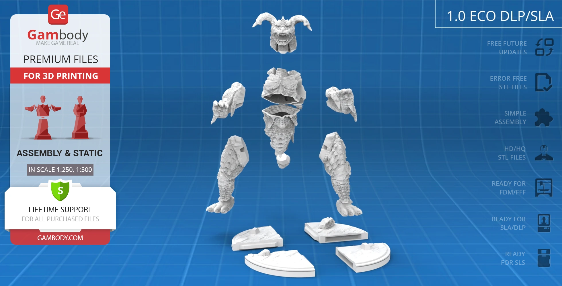 All assembly parts in the 1.0 FFF/FDM version are provided in STL files in recommended positions that were worked out in order to ensure the smoothness of the details’ surfaces after printing and that the 3D printing beginners won't face difficulties when placing the parts on a build plate. When downloading any model's file you will also receive "Assembly Manual" for 1.0 FFF/FDM and 1.0 DLP/SLA versions in PDF format. We highly recommend that you get acquainted with the "Assembly Video" and "Assembly Manual" before getting down to King Caesar Kaiju.