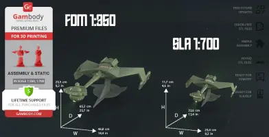 The model’s scale was calculated from the length of the Klingon D7 Battlecruiser which is 228 000 mm. The 3D printing model’s chosen scales are 1:350 for the FFF/FDM version and 1:700 for the DLP/SLA version.