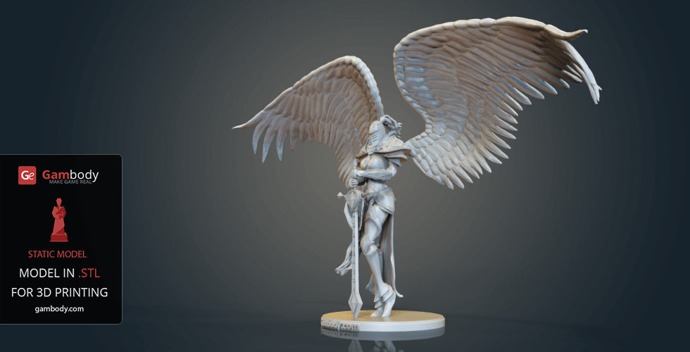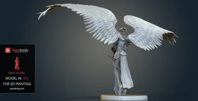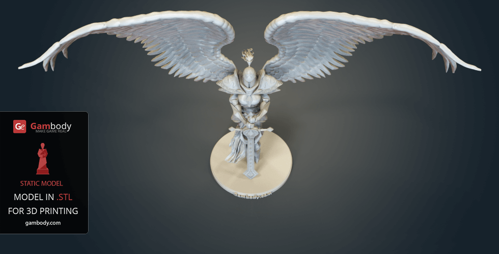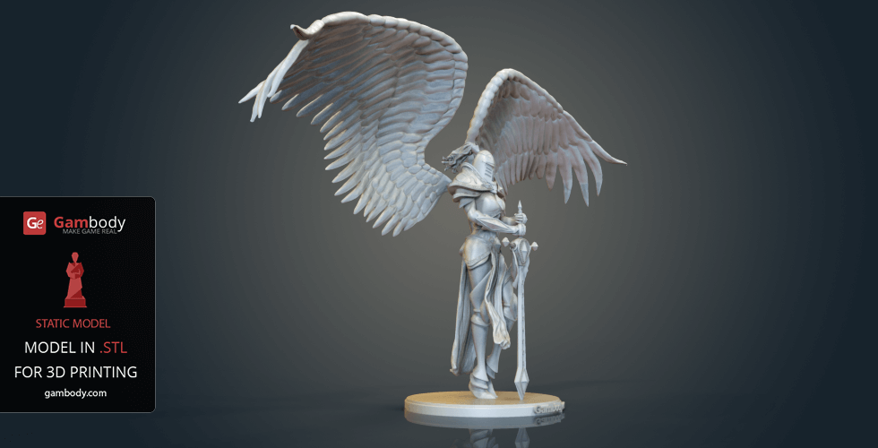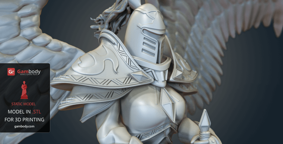 Kayle 3D model showcases superb surface detailing, with an accurate representation of the video game protagonist’s graphic lines. It features astonishing wings and the unmistakable flaming sword that has been forged before time itself. The model is available in static form, mounted on a nicely crafted support, to facilitate its display on the desk or shelf.