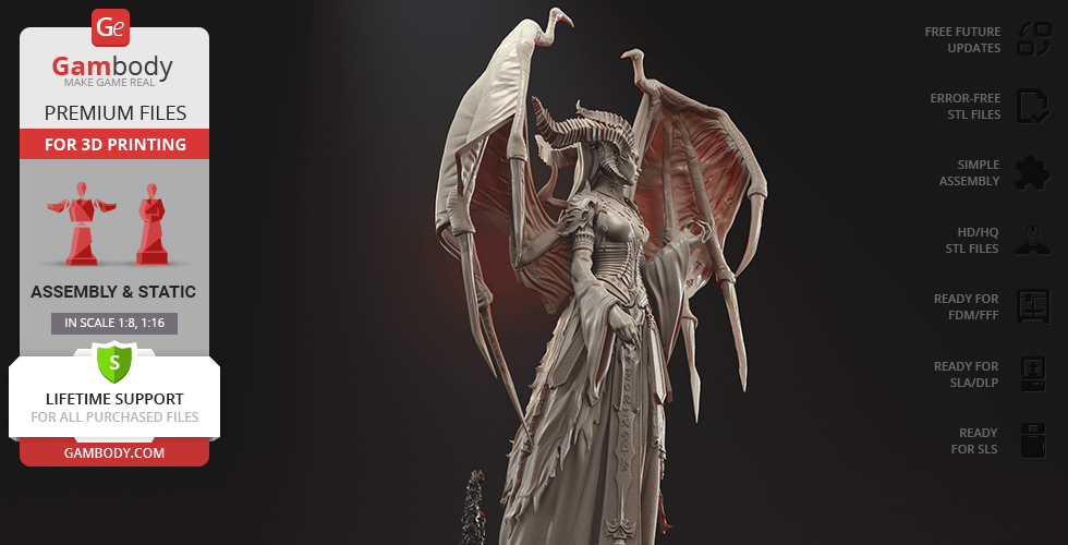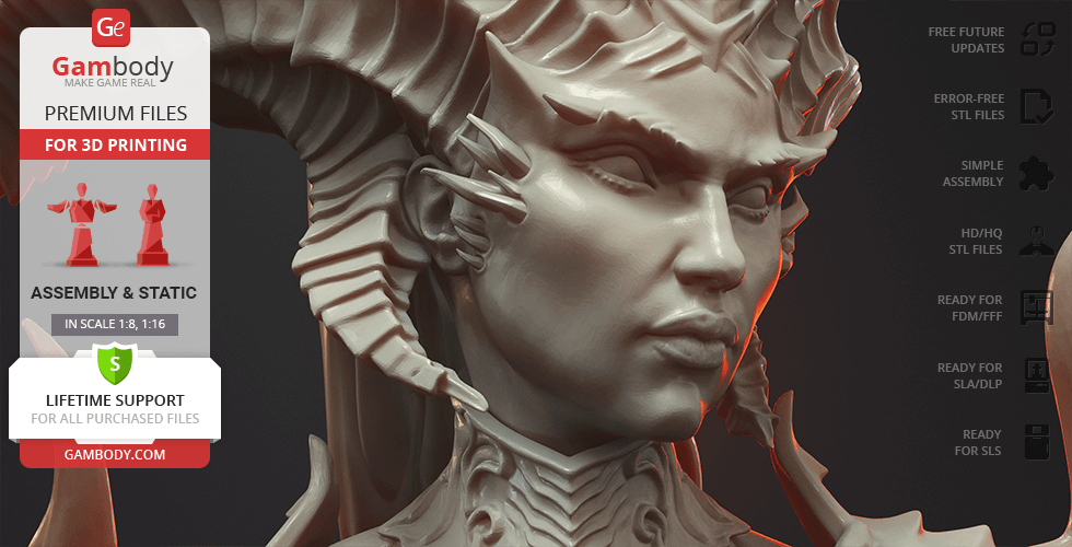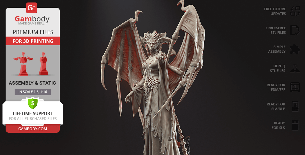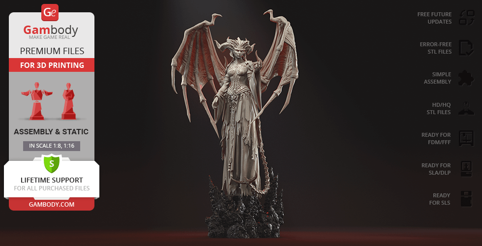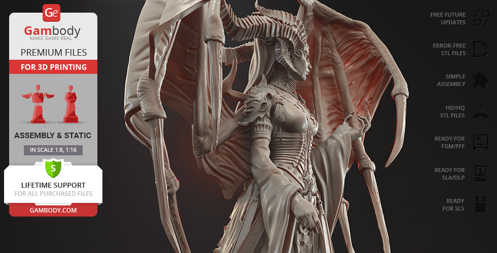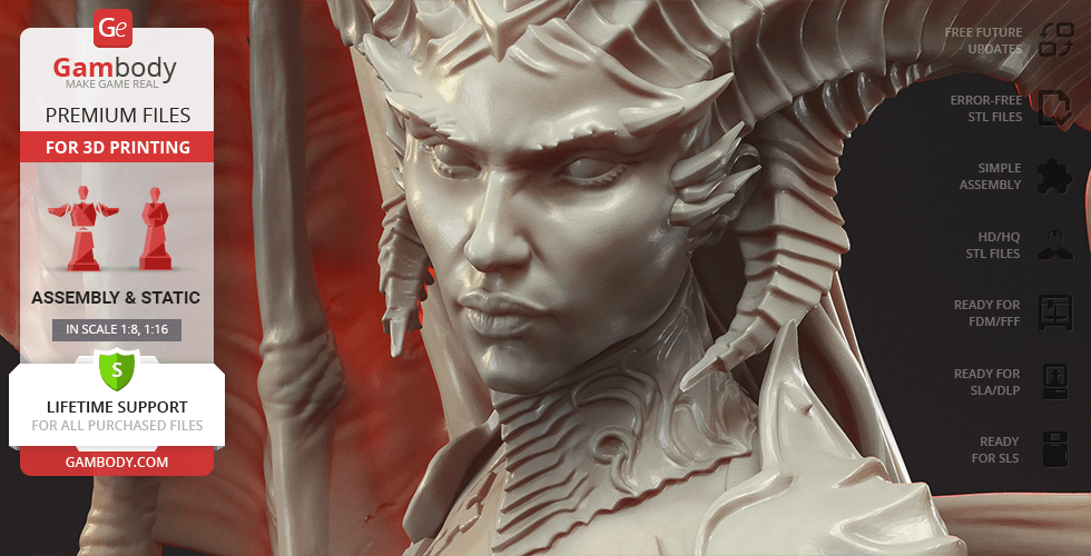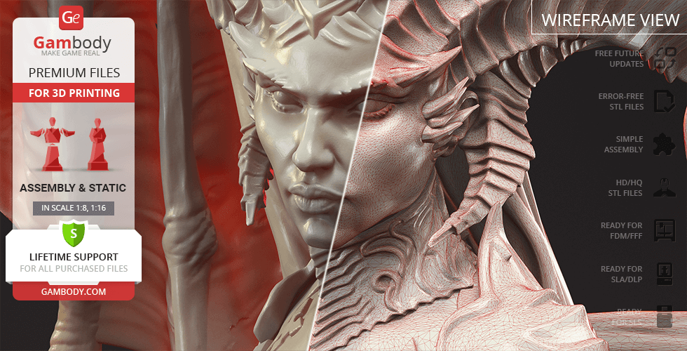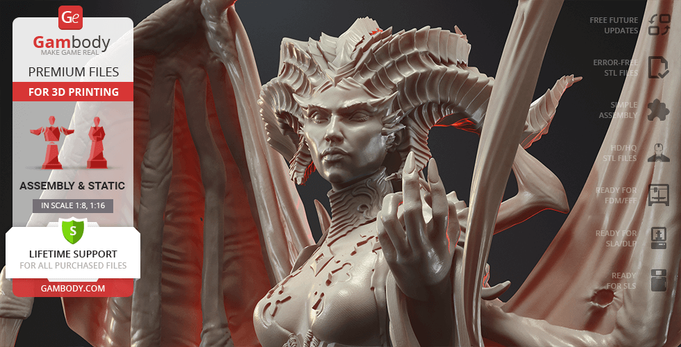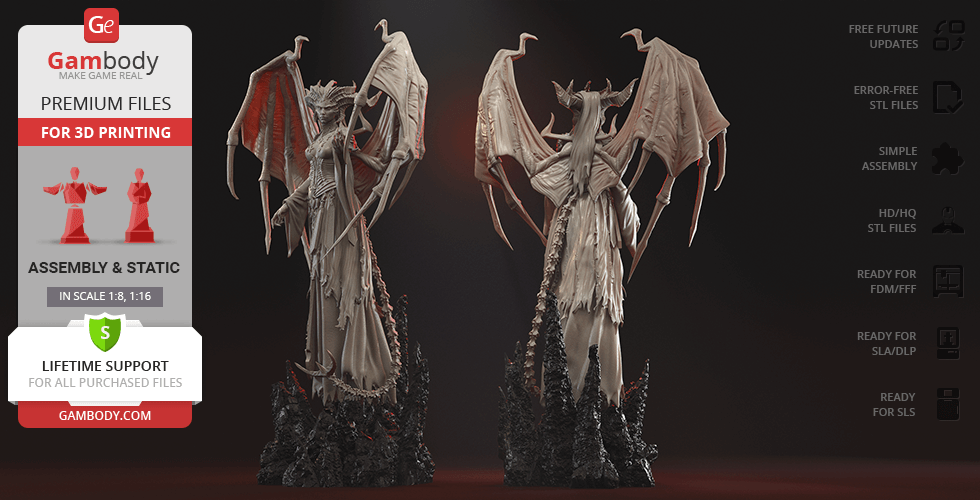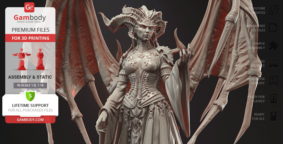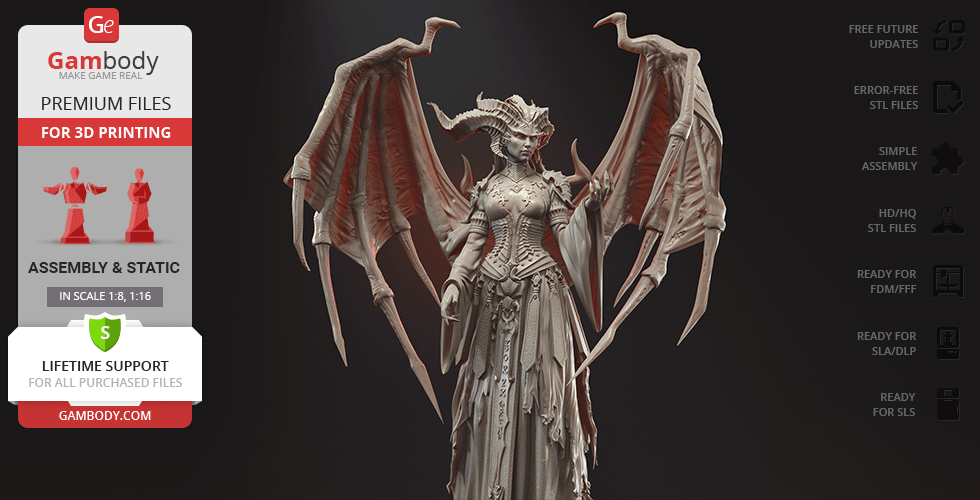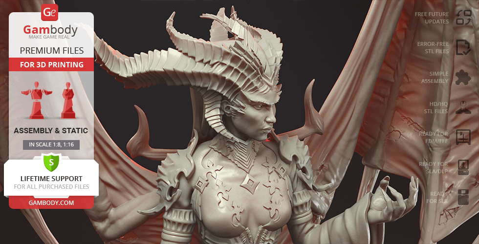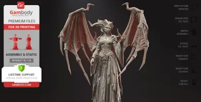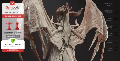Beautiful and vicious, the demoness Lilith inspired our contributing 3D artist to create this incredibly impressive 3D print model. Despite having a human body, Lilith looks markedly different from this race, primarily because of the giant vanity wings and broad sinuous horns that adorn her head. The wings embrace the silhouette of the heroine and create an aura of danger and mystery. The medieval long-sleeved dress with intricate patterns and numerous decorative elements emphasizes the elegant figure of the demoness. The penetrating look of Lilith can instantly subdue and enslave everyone who meets it. When looking at the malicious expression of Lilith, you unconsciously start thinking of the hidden sinister intentions of the Daughter of Mephisto. These premium STL files will give a special charm to each Diablo fan collection!