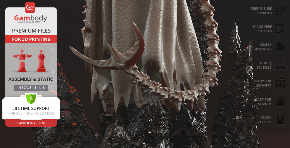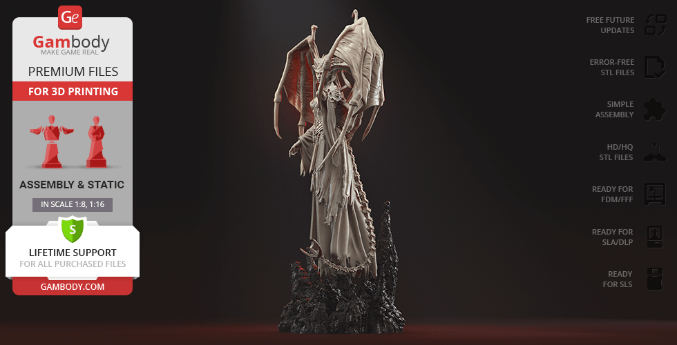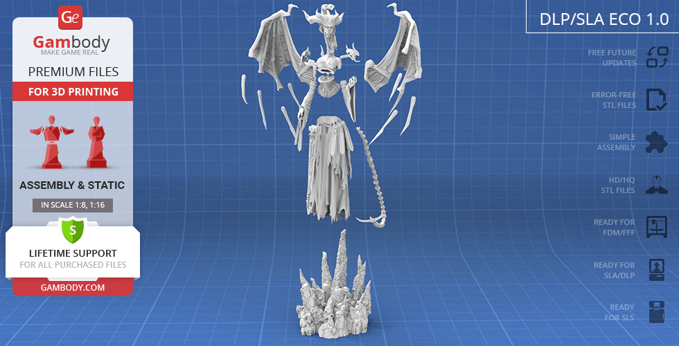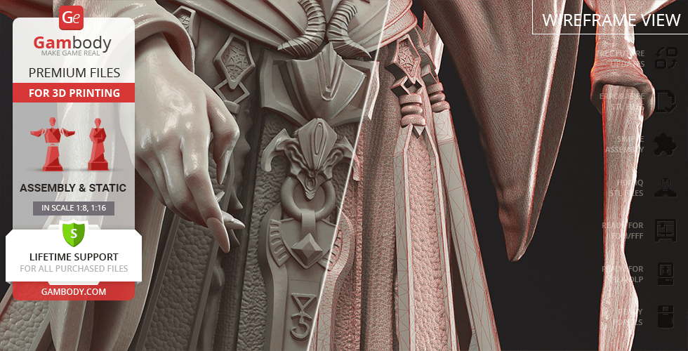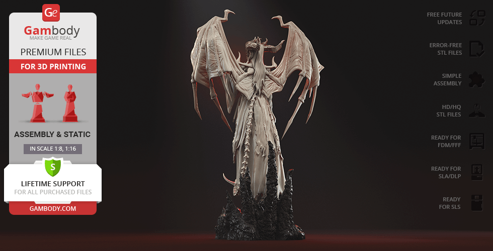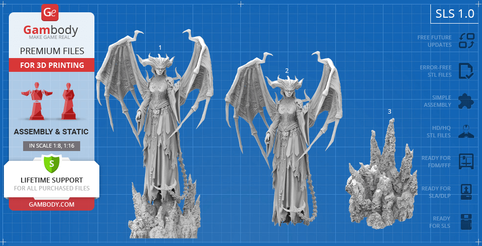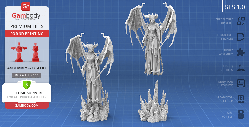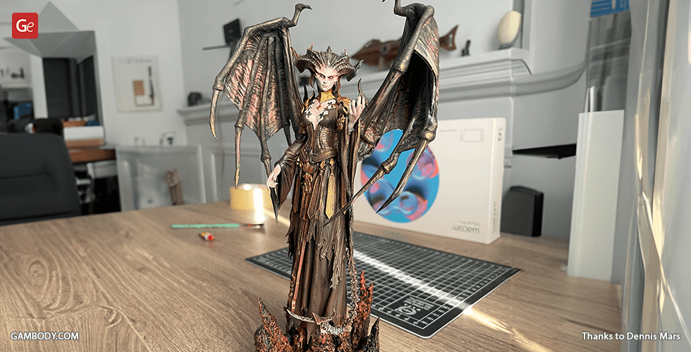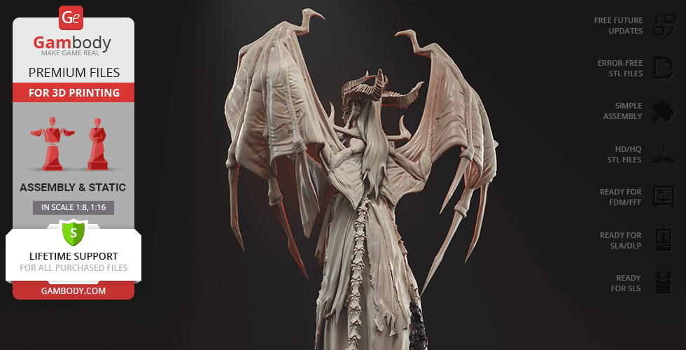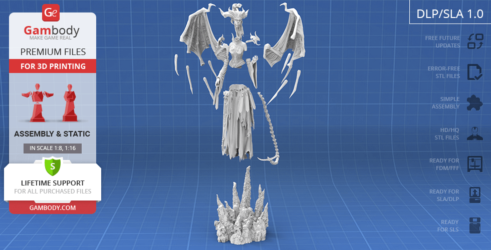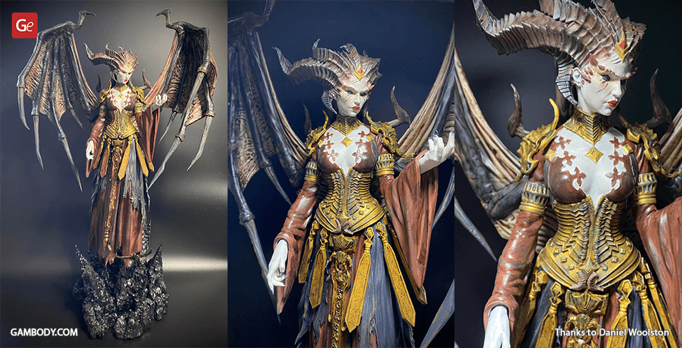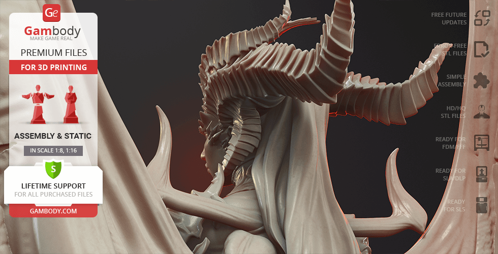 Beautiful and vicious, the demoness Lilith inspired our contributing 3D artist to create this incredibly impressive 3D print model. Despite having a human body, Lilith looks markedly different from this race, primarily because of the giant vanity wings and broad sinuous horns that adorn her head. The wings embrace the silhouette of the heroine and create an aura of danger and mystery. The medieval long-sleeved dress with intricate patterns and numerous decorative elements emphasizes the elegant figure of the demoness. The penetrating look of Lilith can instantly subdue and enslave everyone who meets it. When looking at the malicious expression of Lilith, you unconsciously start thinking of the hidden sinister intentions of the Daughter of Mephisto. These premium STL files will give a special charm to each Diablo fan collection!