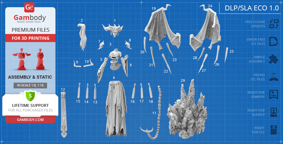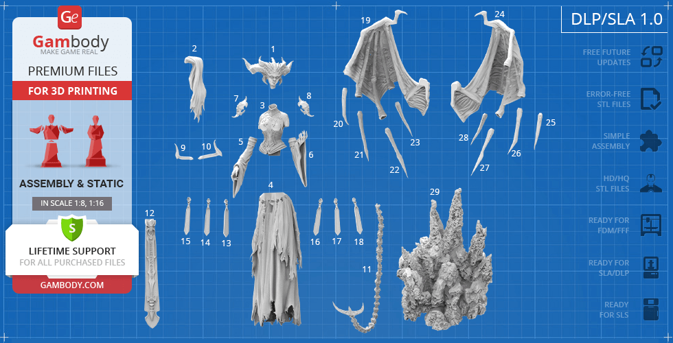 - 4 versions of Lilith Diablo IV STL files for FFF/FDM, DLP/SLA, DLP/SLA Eco, and SLS — files for all versions are available for download after the purchase;