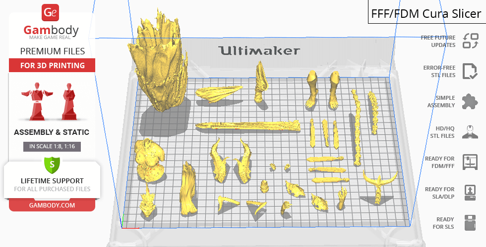 - Optimized part division minimizes support material and ensures smooth surface detail;