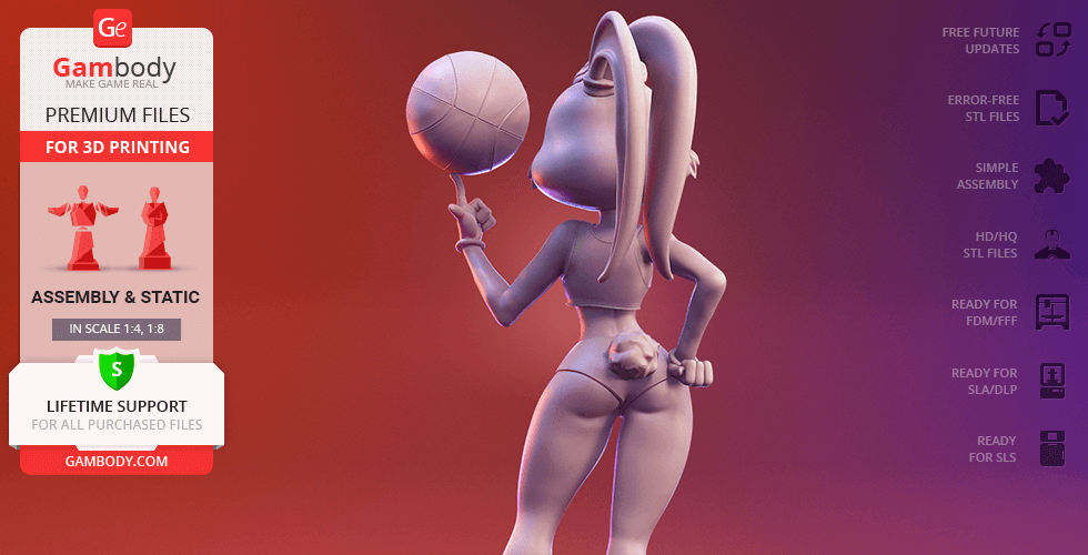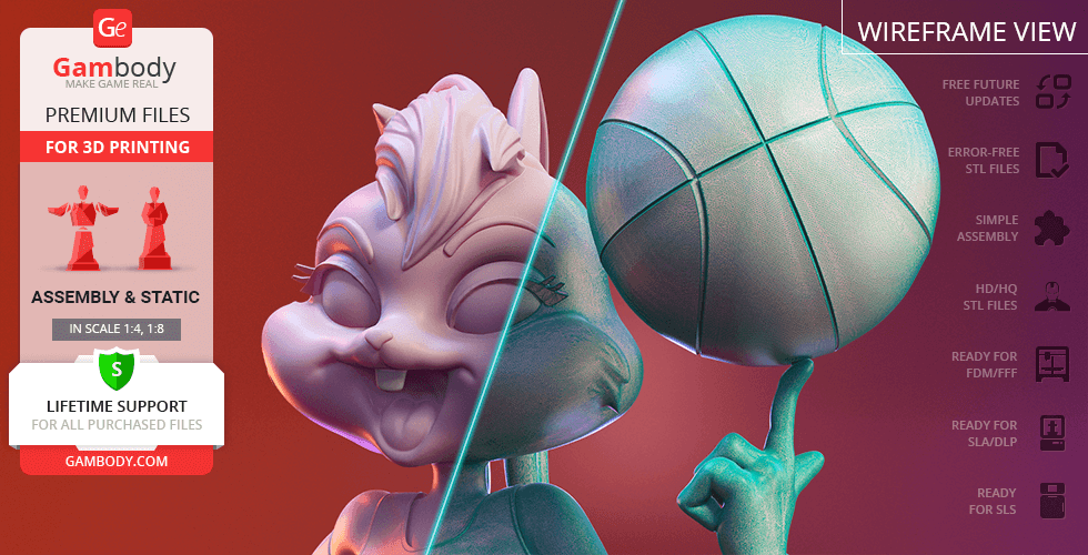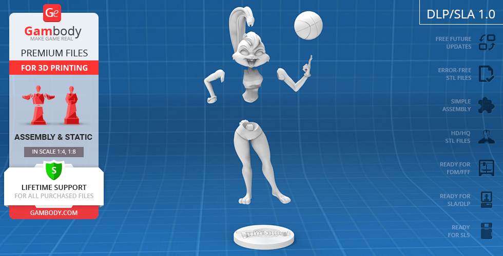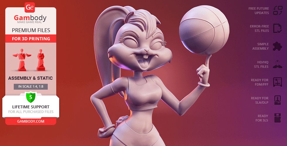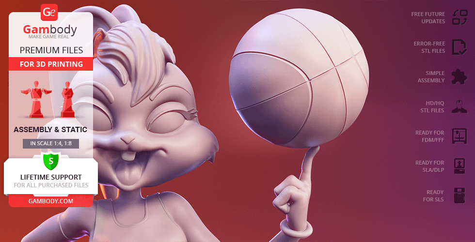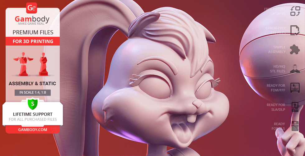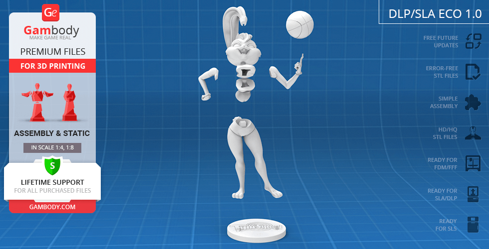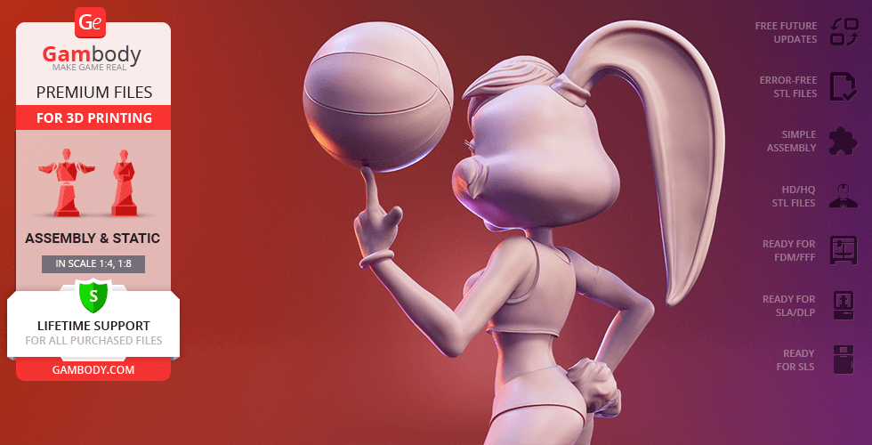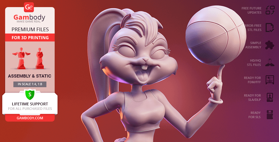 Lola Bunny figurine for 3D printing is a static assembly model and its moderation and adaptation for different types of 3D printers took Gambody team 25 hours. The figurine’s anatomy and proportions were thoroughly reviewed during the moderation process for the animated basketball star to be depicted harmoniously in the intended pose.