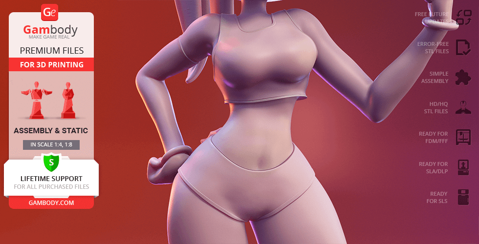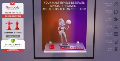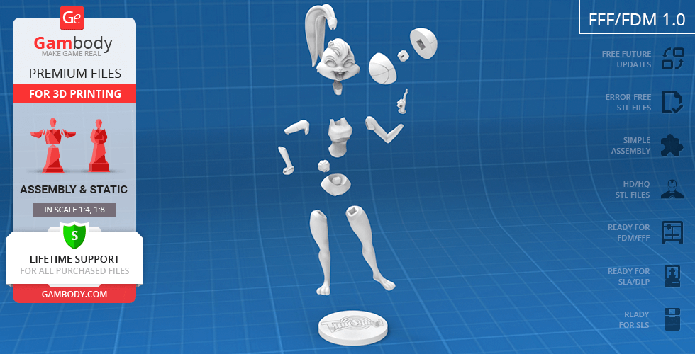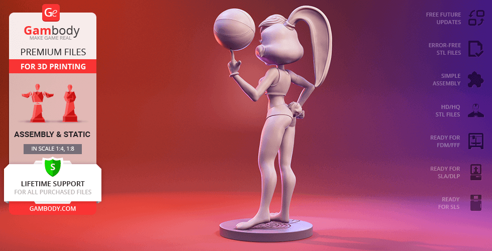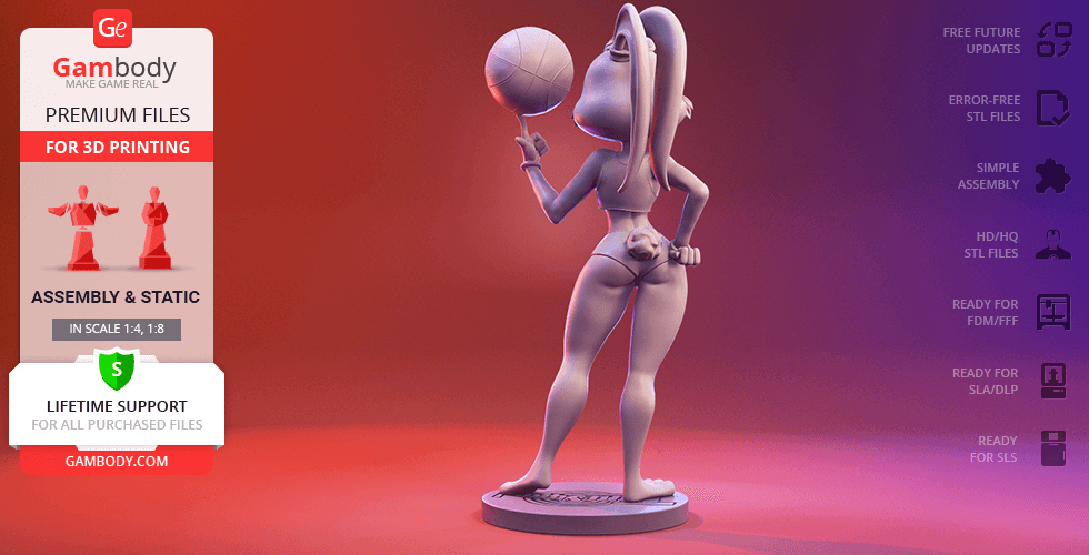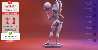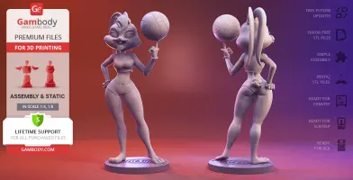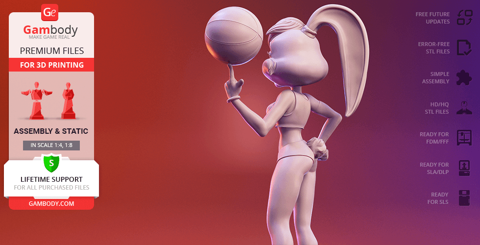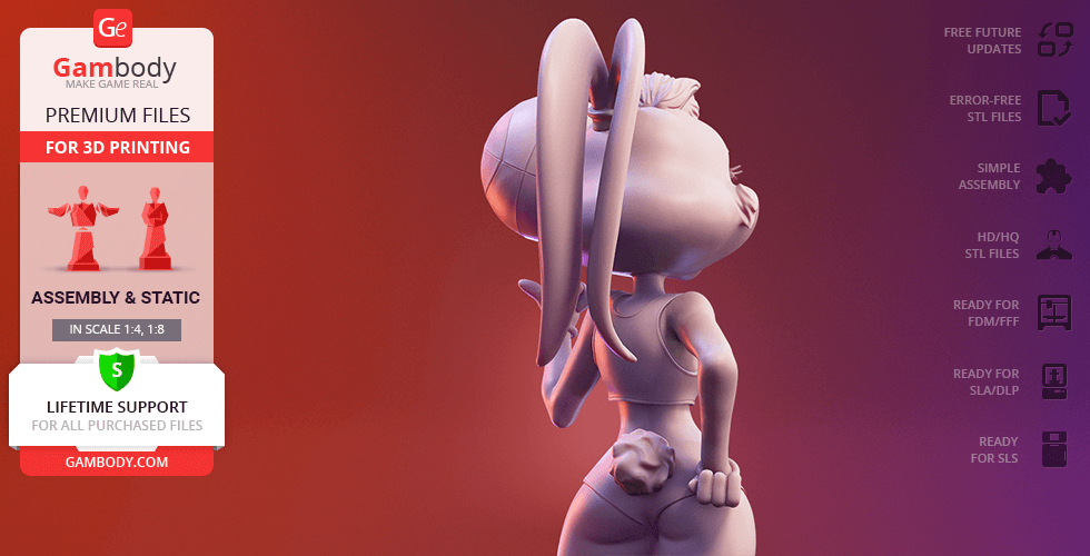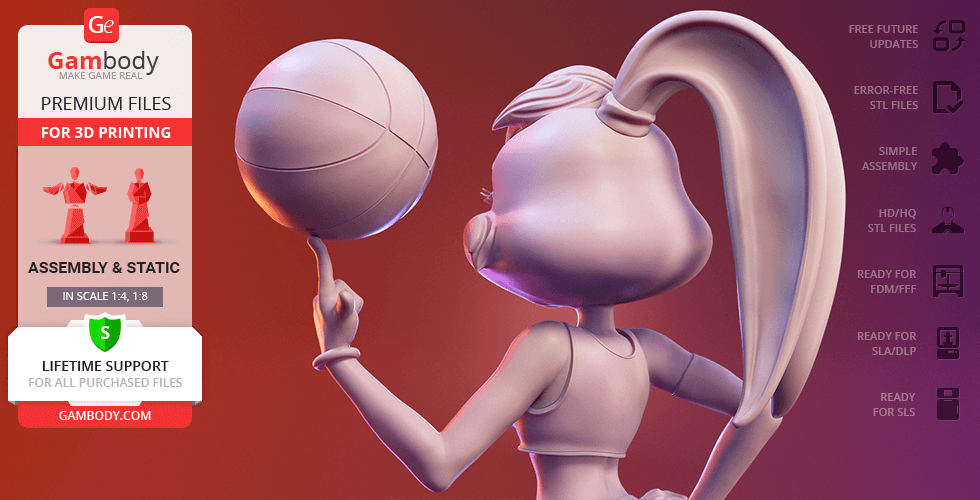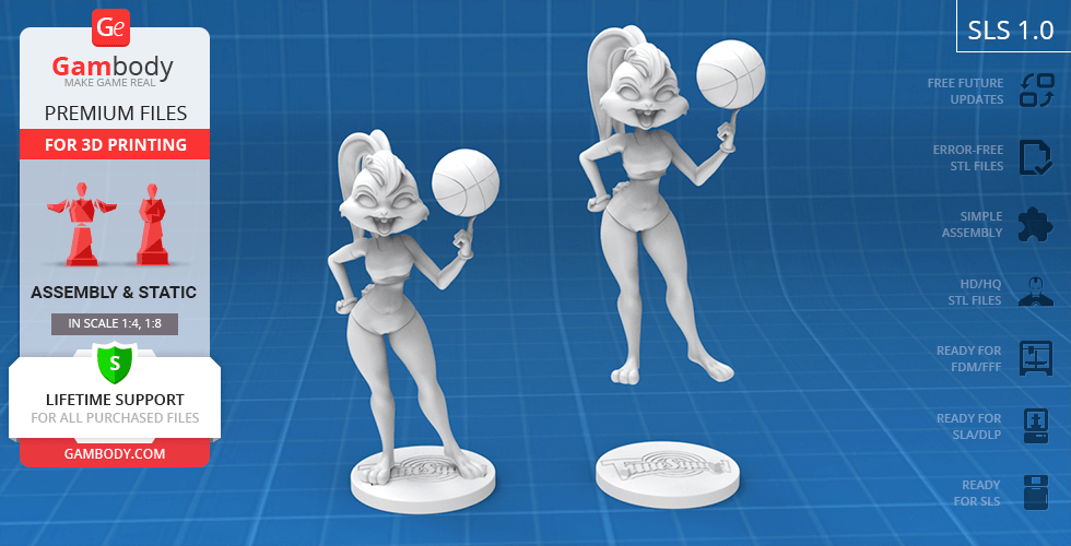 Lola Bunny figurine for 3D printing is a static assembly model and its moderation and adaptation for different types of 3D printers took Gambody team 25 hours. The figurine’s anatomy and proportions were thoroughly reviewed during the moderation process for the animated basketball star to be depicted harmoniously in the intended pose.