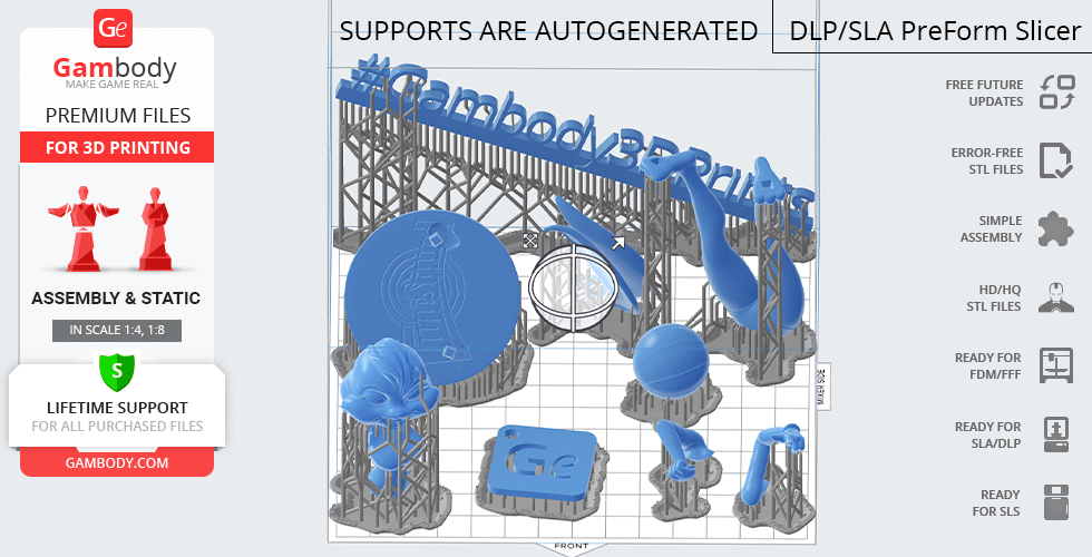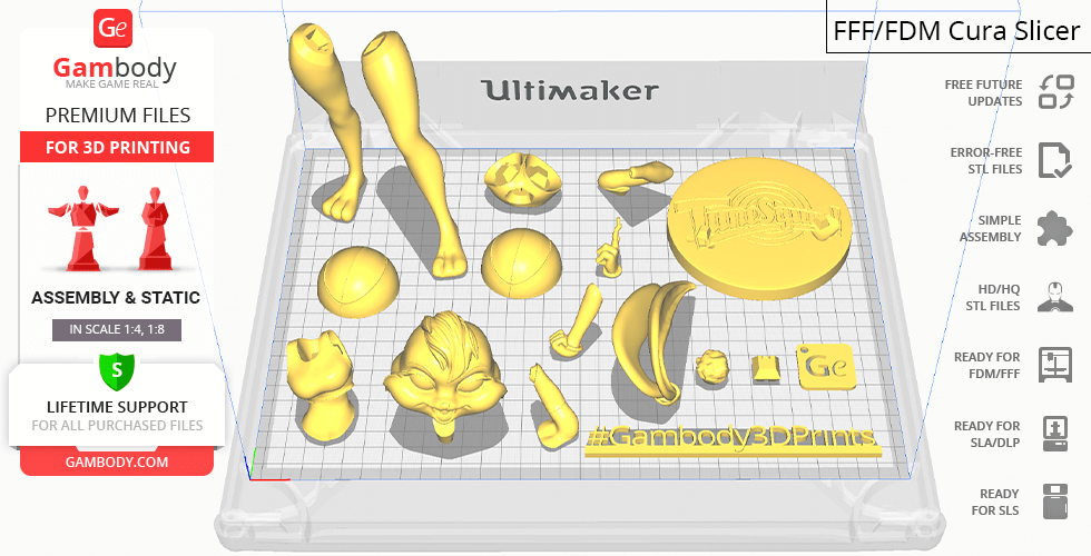 All assembly parts come in STL files of FFF/FDM version in recommended positions that were worked out in order to ensure the smoothness of the details’ surfaces after printing and so that the 3D printing beginners won't face difficulties when placing the parts on a build plate. When downloading any figurine's file you will also receive "Assembly Manual" for FFF/FDM 1.0 and DLP/SLA 1.0 versions in PDF format.