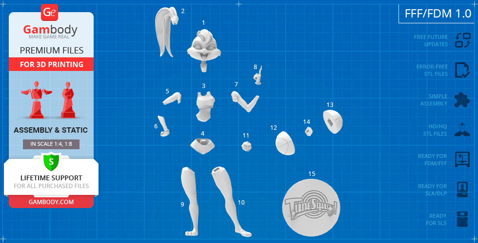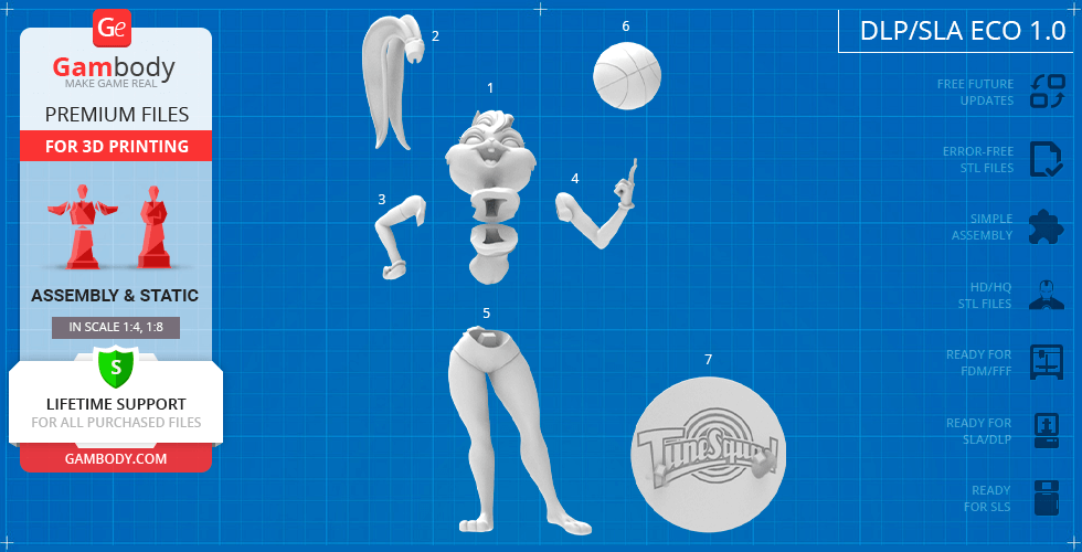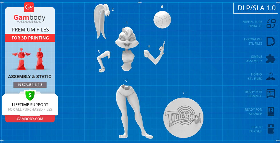 - 5 versions of Lola Bunny 3D print files for FFF/FDM, DLP/SLA, DLP/SLA Eco, and SLS - files for each version are available for download after the purchase