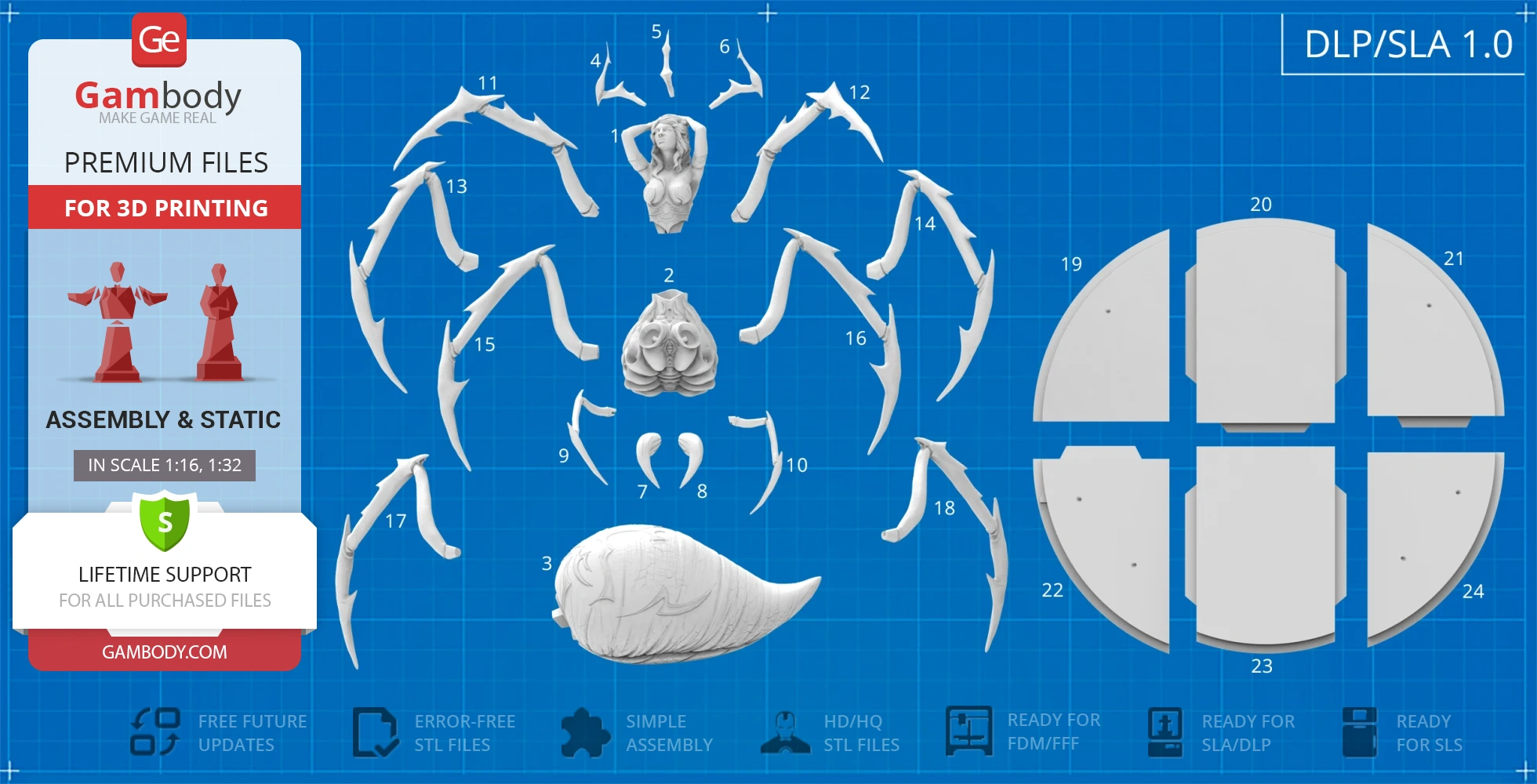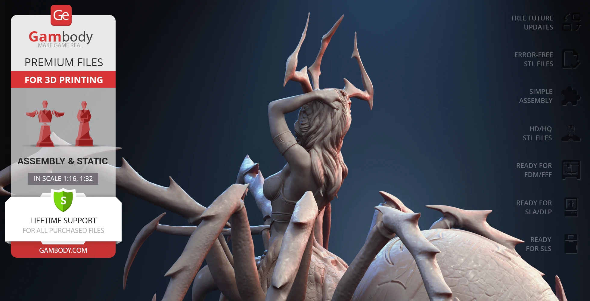 - 4 versions of Lolth STL files for FFF/FDM, DLP/SLA, DLP/SLA Eco and SLS - files for all versions are available for download after the purchase;
