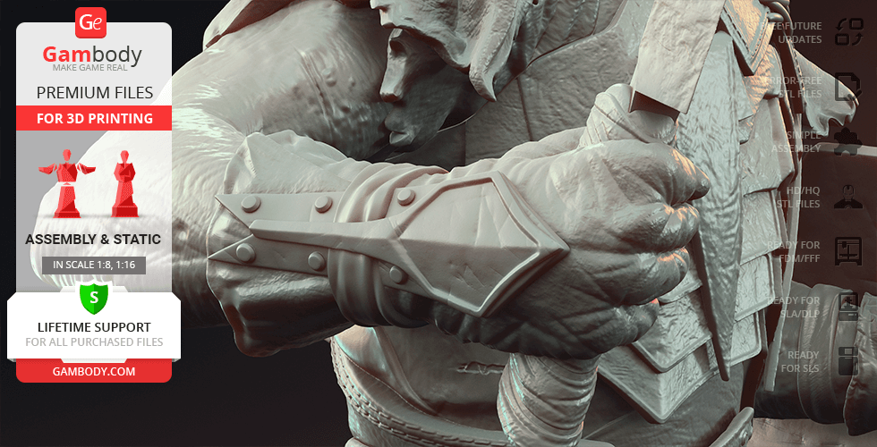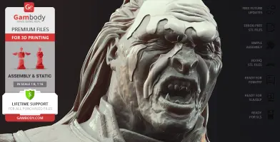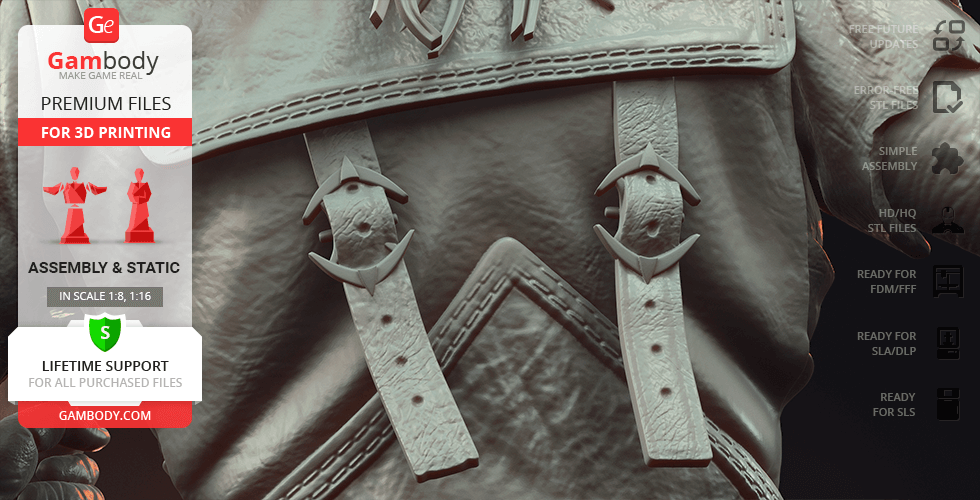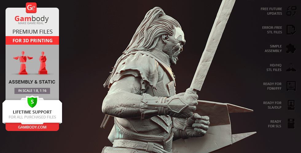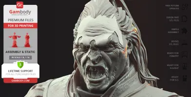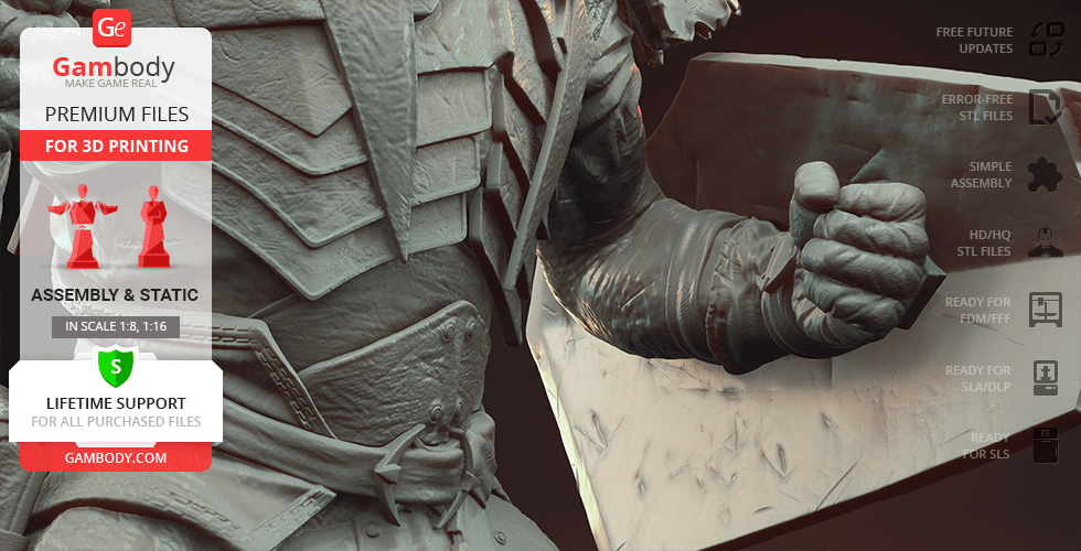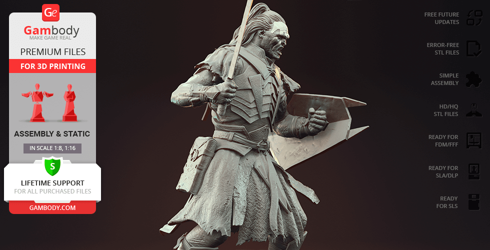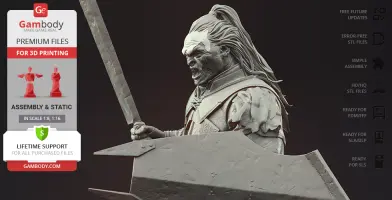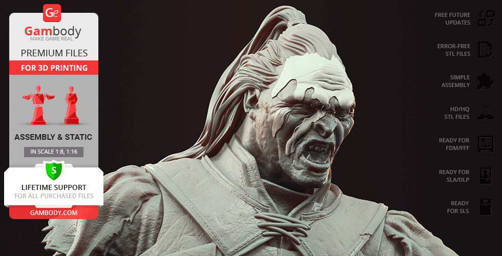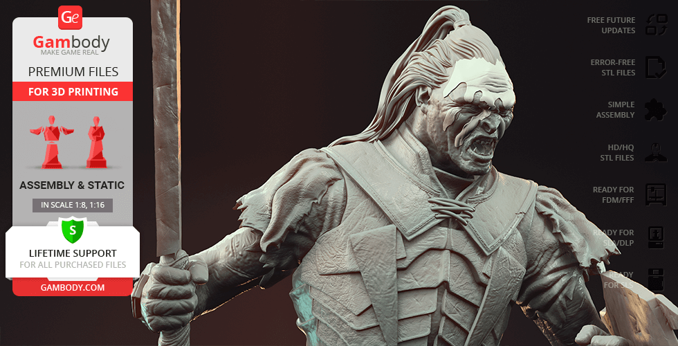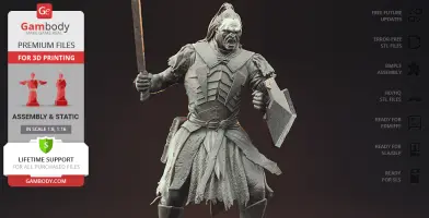 The Lurtz 3D printer model is filled with the warrior spirit and dangerous sharp edges. The Uruk with stunning likeness is dressed in layers of tattered leather and plates of armour that almost look like a part of his torso. His weapons of choice are a hooked scimitar and a bladed shield that once almost cost Aragorn his life. Many interesting details are hidden in the model's design, so make sure you print it to unravel more!
