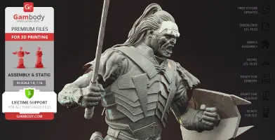 • A highly detailed Lurtz 3D printer model that perfectly captures the Uruk-hai warrior's formidable appearance, including his tattered leather, armor, hooked scimitar, and bladed shield.