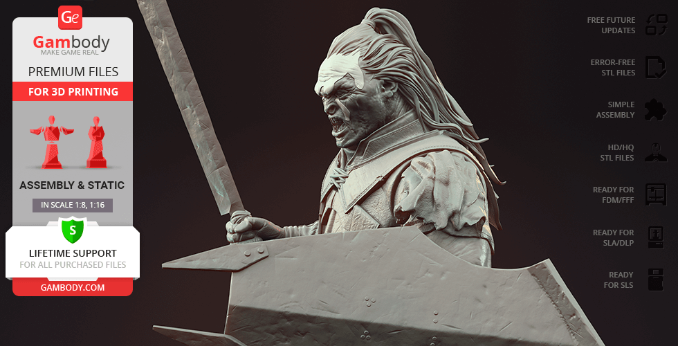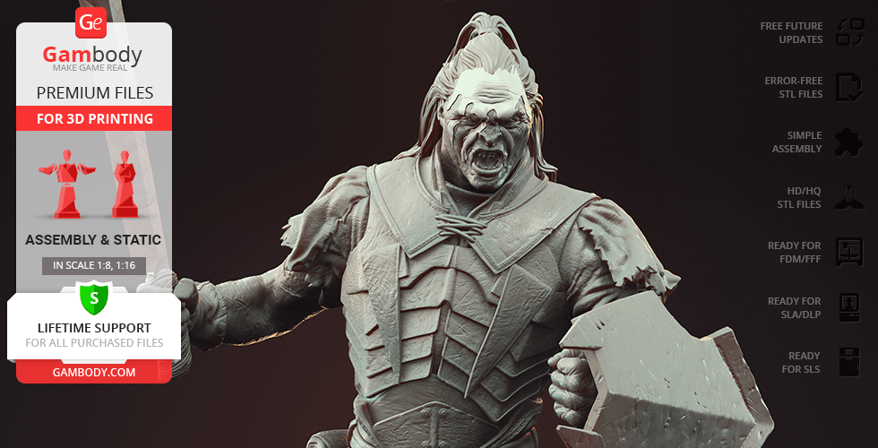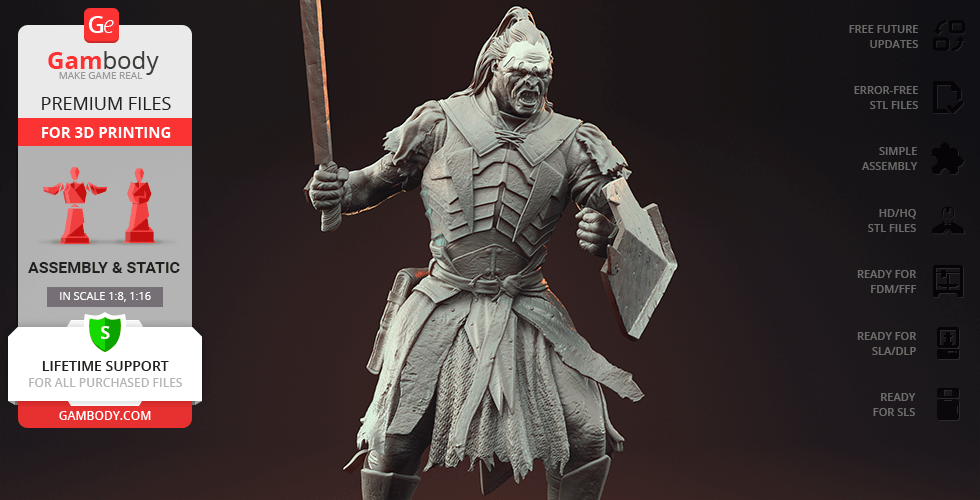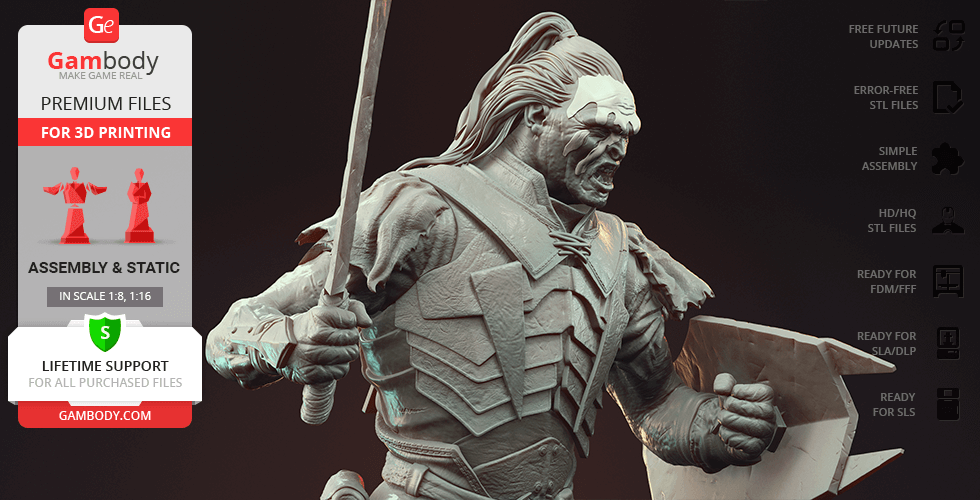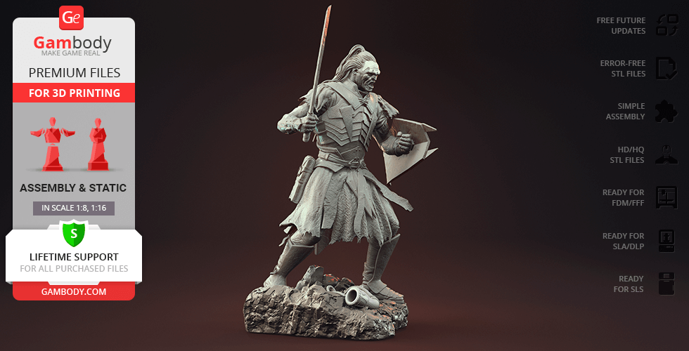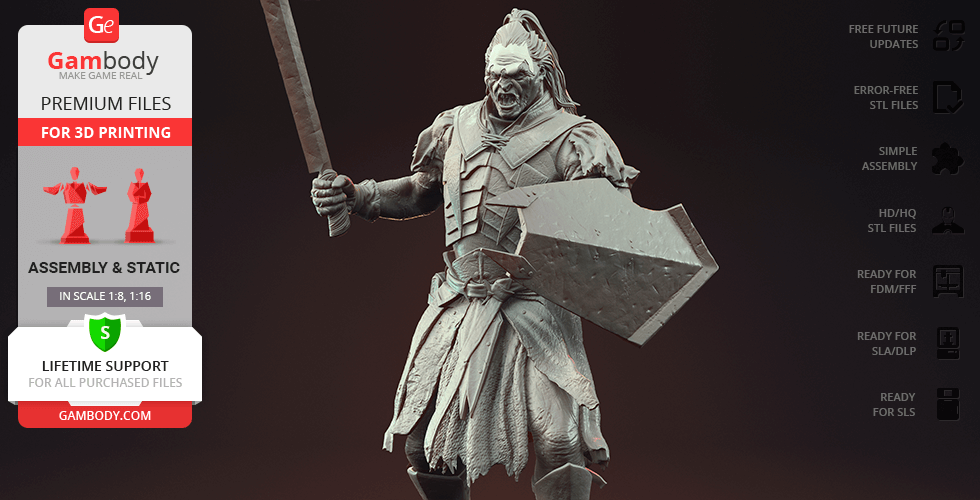 - A highly detailed Lurtz 3D printer model that perfectly captures the Uruk-hai warrior's formidable appearance, including his tattered leather, armor, hooked scimitar, and bladed shield.