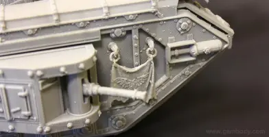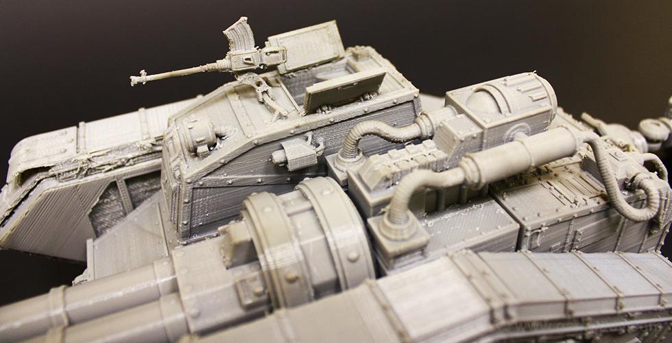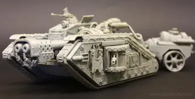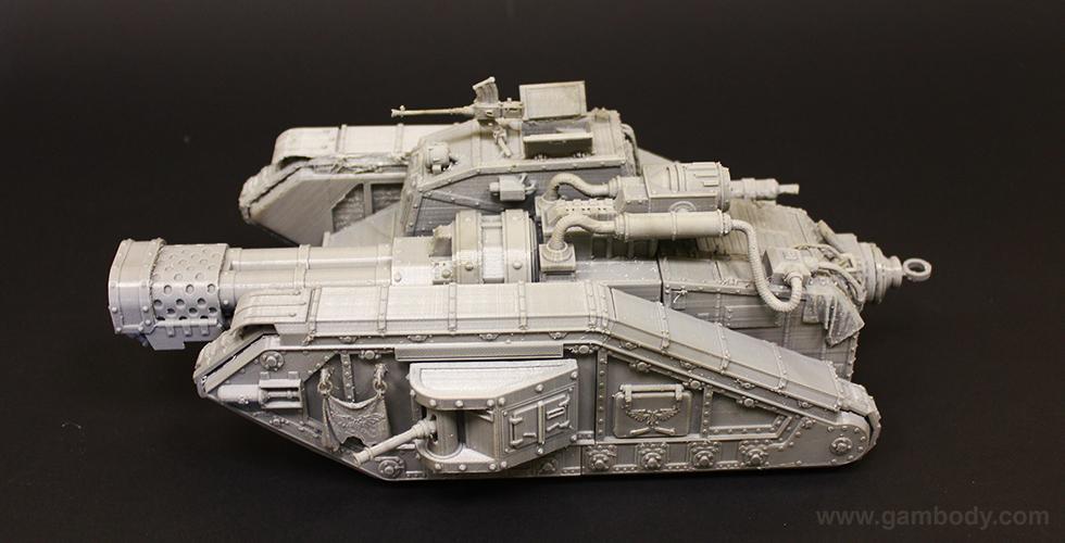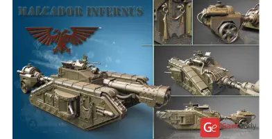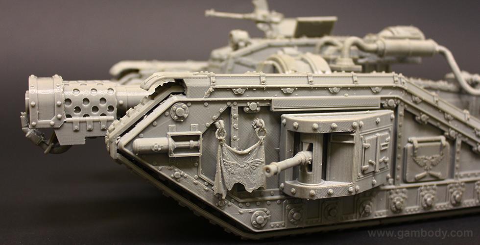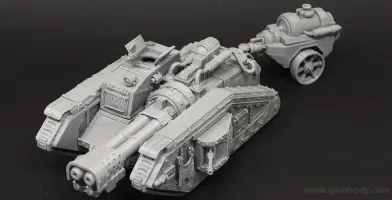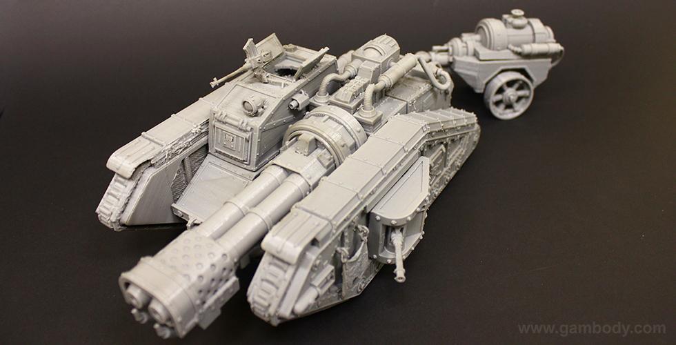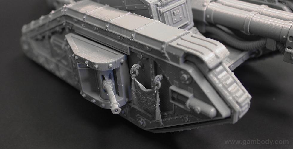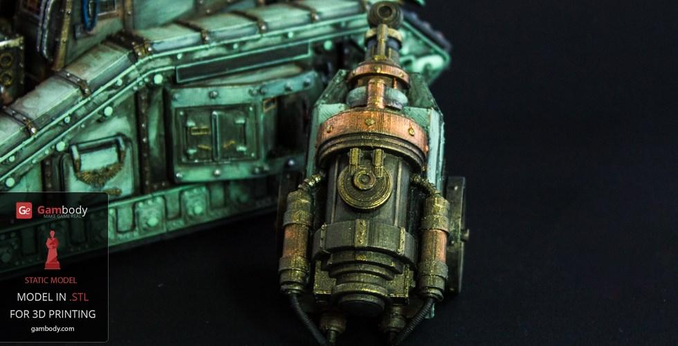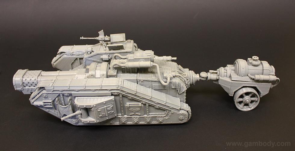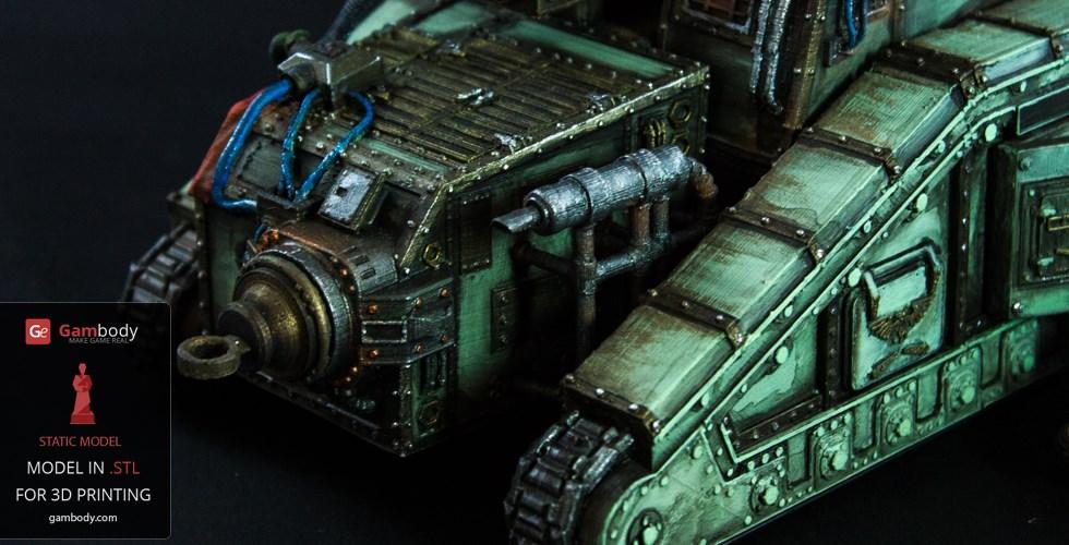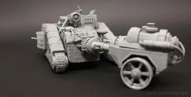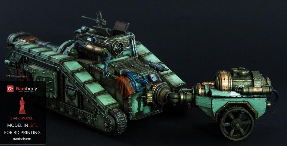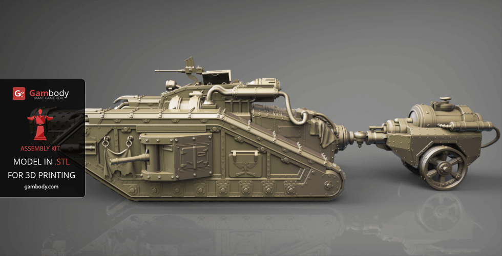 Flamethrower battle tank made for 3D printing showcases the fuel trailer attached to the tank’s rear. It is accurately reproduced and features another important element of the WH40KMalcador Tank – its Inferno Gun, capable of throwing immense flames. Its fuel trailer and Inferno Gun gave the tank the name of flame thrower tank, clearing mine areas and making them safer for passage.