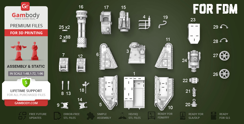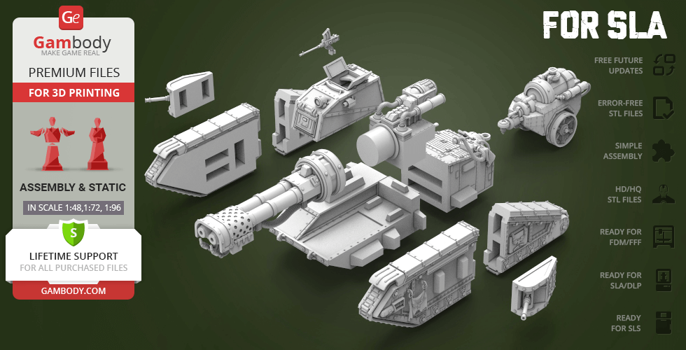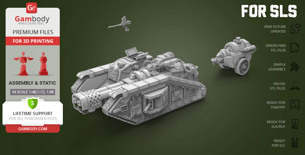 The model was completely redone. Here is the list of changes:1. Changed the cutting of the model for more comfortable printing with the smallest amount of supports.2. Reworked assembly of the model and Locks were added for connecting the parts.3. Increased detalization, as well as worked out small technical details in order to maximize the repeat of the game analog model.4. This update was divided into 4 versions, for comfortable printing on different types of printers. The SLS version of Flamethrower Tank was divided into 2 new scale versions of 1:72 and 1:96.