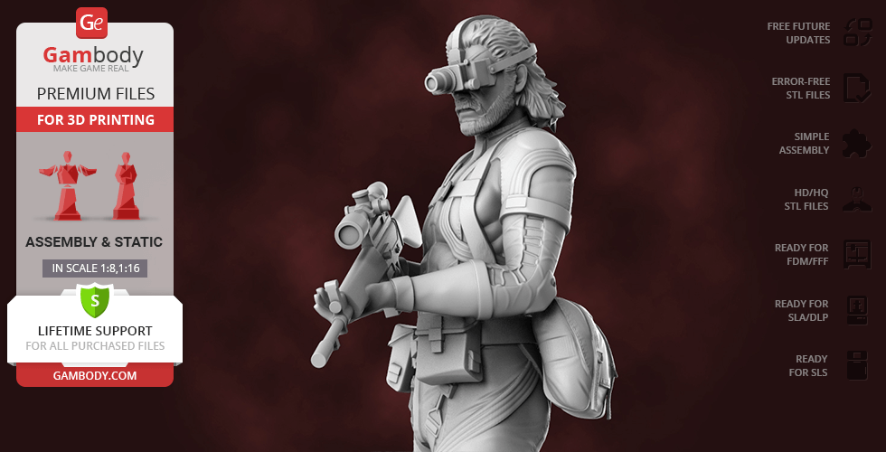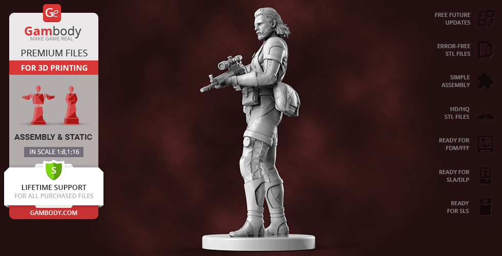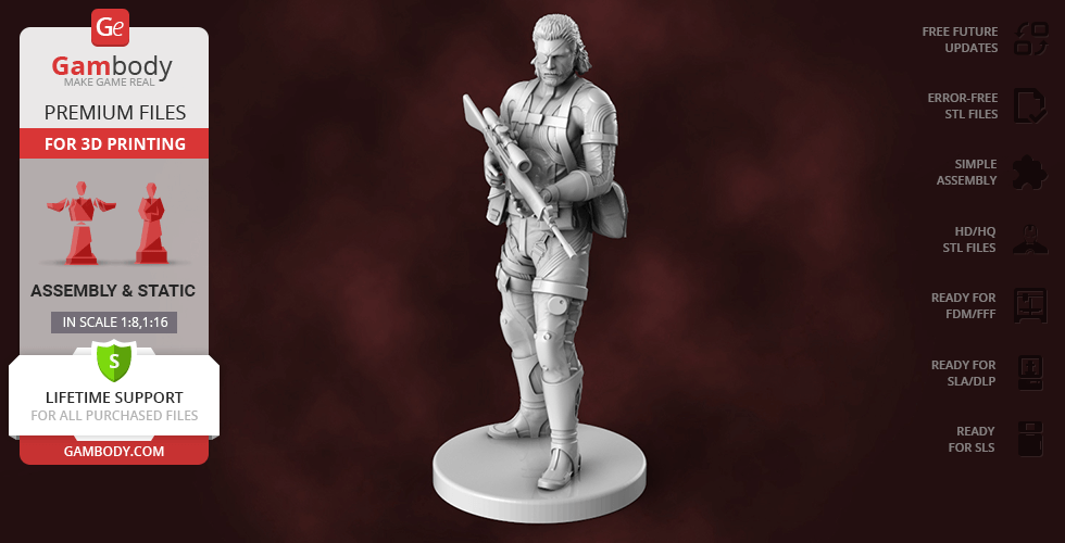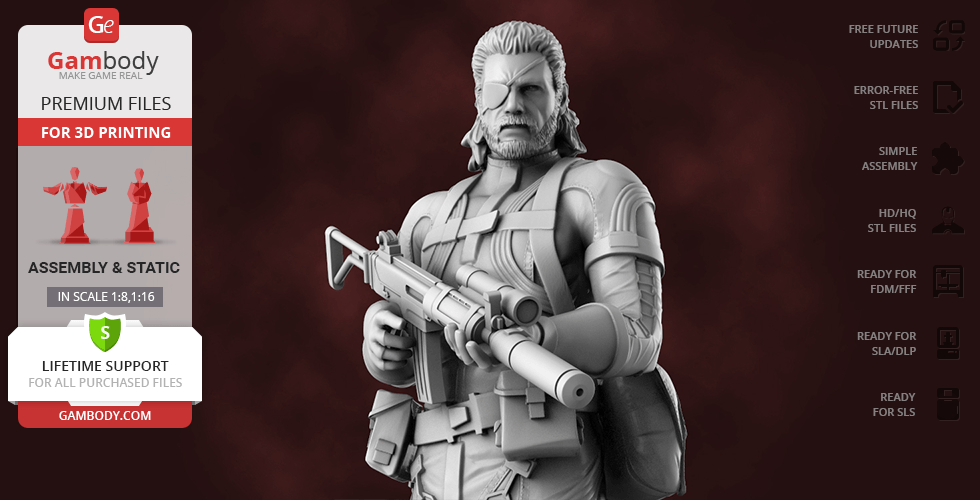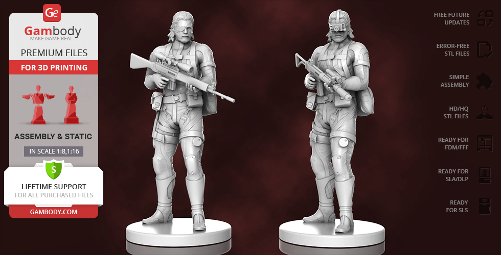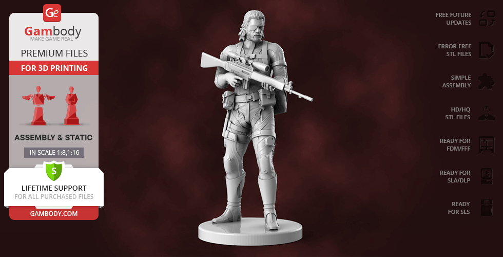 Big Boss 3D Printing Figurine comes in 4 versions for each 3D printer type (FDM/FFF, DLP/SLA and SLS). Files for each version are available for download after the purchase.