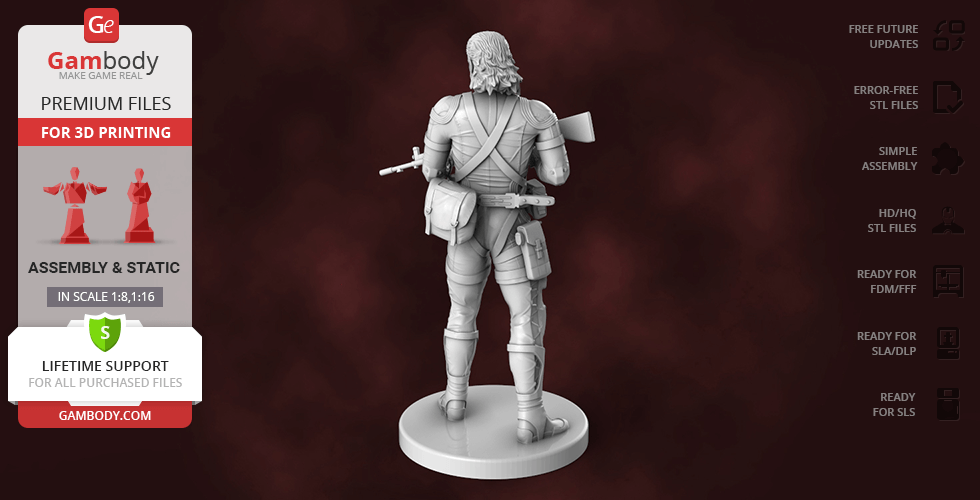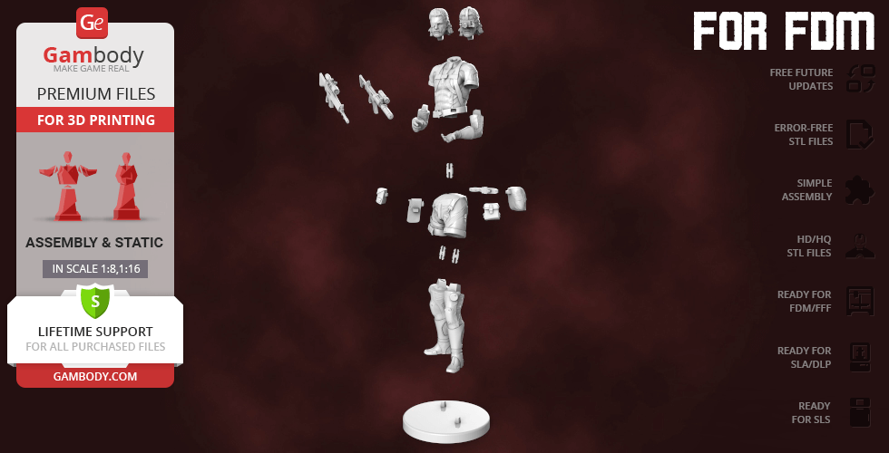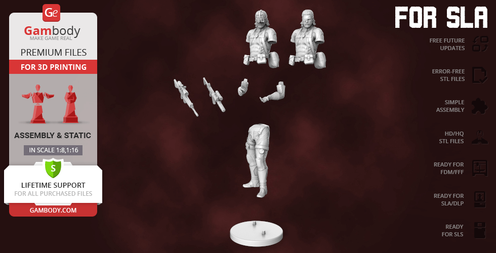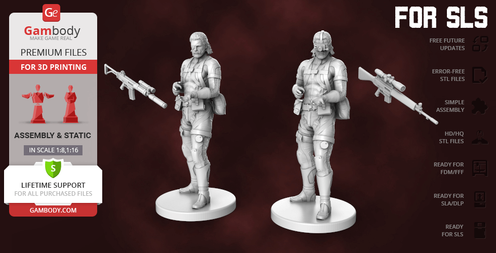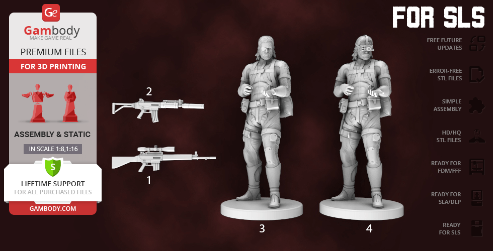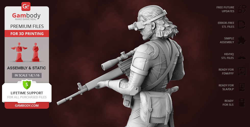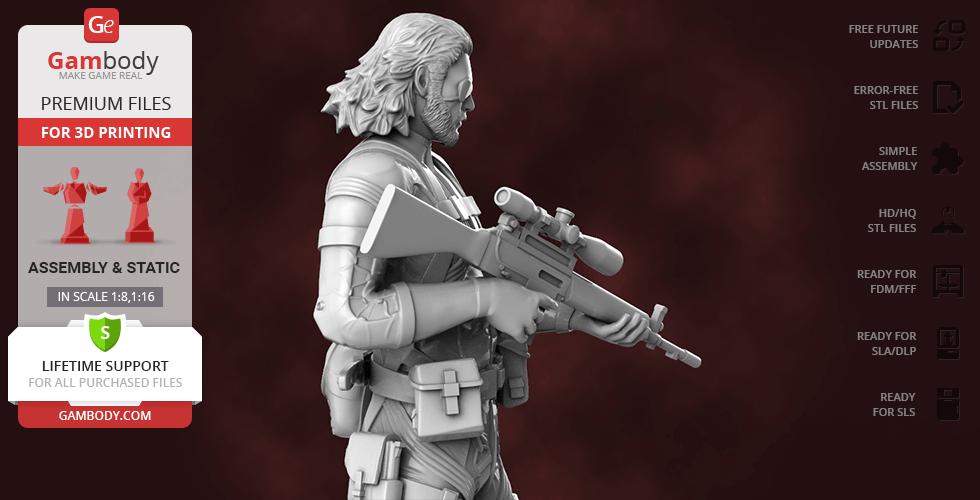 Big Boss 3D Printing Figurine comes in 4 versions for each 3D printer type (FDM/FFF, DLP/SLA and SLS). Files for each version are available for download after the purchase.