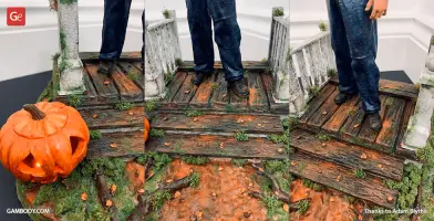 Michael Myers figurine for 3D printing is a static assembly model and its moderation and adaptation for different types of 3D printers took Gambody team 36 hours in total. Figurine’s anatomy was thoroughly reviewed during the moderation process for the slasher films legend to be depicted harmoniously in the intended malicious pose. The model’s cutting was chosen by our team to minimise the amount of filament needed for generated support and some of the parts were hollowed out for you to save resin in the figurine’s Eco version. For you to receive the cleanest result possible the knife that Myers is holding up was extracted from the raised hand and in order to conceal the places where the assembly parts of the model must be connected, the figurine was cut along the contour of Michael Myers clothes’ seams. What is more, to ensure an excellent quality of the 3D printed result, the platform was also divided into many assembly pieces, i.e. each tread is provided separately, as well as balusters and holiday pumpkin. All the assembly parts are provided in STL files in recommended positions that were worked out so to ensure the smoothness of the details’ surfaces after printing and that the 3D printing beginners won't face difficulties when placing the parts on a build plate.