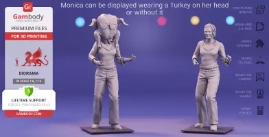 DLP/SLA Eco 1.0 version features:- Contains 7 parts;- A printed model is 123 mm tall, 50 mm wide, 46 mm deep;- Monica can be displayed wearing a Turkey on her head or without it;- Can be assembled into the Thanksgiving Diorama together with Chandler Bing;- Contains some hollowed out parts to save resin.