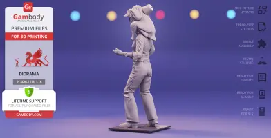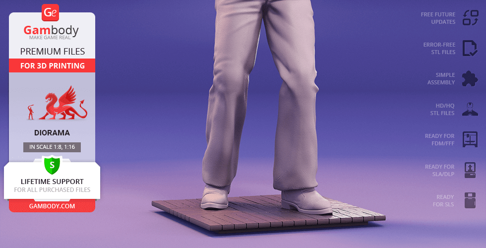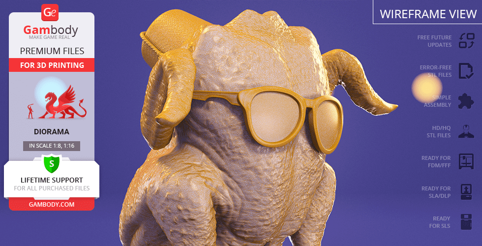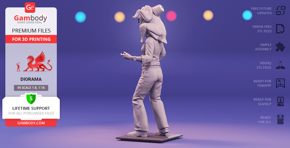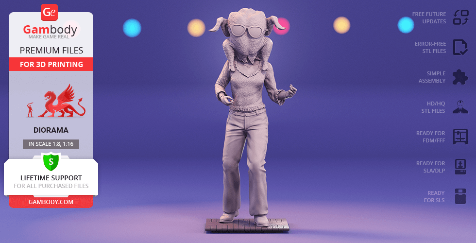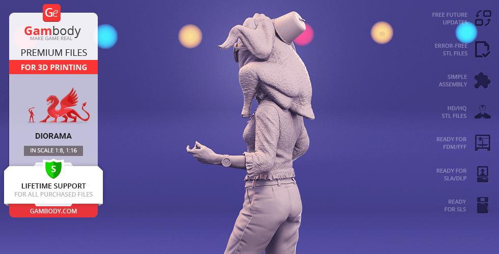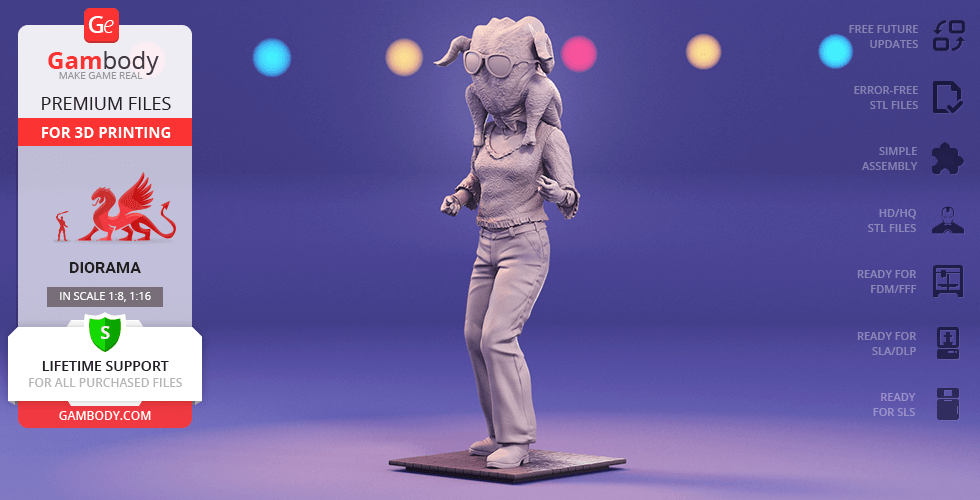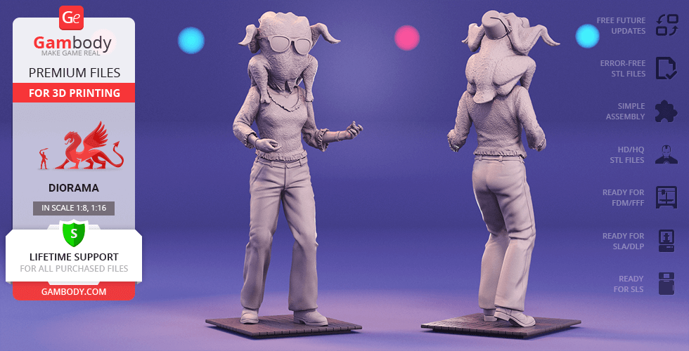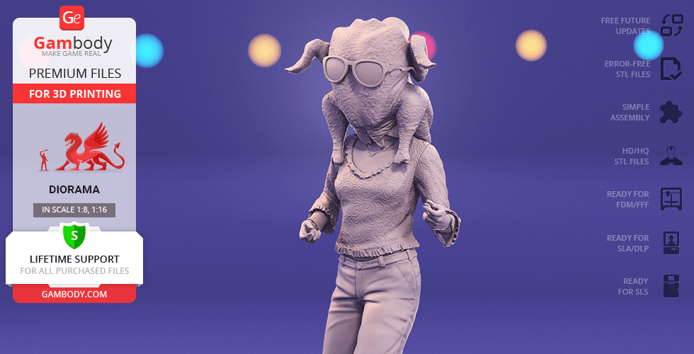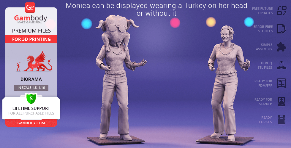 Monica Geller figurine for 3D printing is a static assembly model and its moderation and adaptation for different types of 3D printers took Gambody team 42 hours in total. Figurine’s anatomy was thoroughly reviewed during the moderation process for the joyful friend to be depicted harmoniously while dancing with a large turkey on her head. The model’s cutting was chosen by our team to minimise the amount of filament needed for generated support and some of the parts were hollowed out for you to save resin in the figurine’s Eco version. In order to conceal the places where the assembly parts of the model must be connected, the figurine was cut along the contour of Monica’s clothes seams. For you to achieve the cleanest 3D printed result, the figurine’s head, shoes, hands, turkey, fez, a pair of large sunglasses, etc. are provided as separate files. All the assembly parts come in STL files in recommended positions that were worked out in order to ensure the smoothness of the details’ surfaces after printing and so that the 3D printing beginners won't face difficulties when placing the parts on a build plate. When downloading any figurine's file you will also receive "Assembly Manual" for FFF/FDM 1.0 and DLP/SLA 1.0 versions in PDF format.