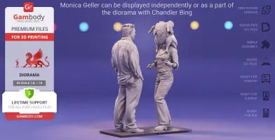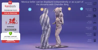 FFF/FDM 1.0 version features:- Contains 16 parts;- A printed model is 247 mm tall, 101 mm wide, 92 mm deep;- Assembly kit includes lock 16_ge_lock_7S(x1) to attach the figurine's body to legs securely without glue that needs to be printed once;- Monica can be displayed wearing a Turkey on her head or without it;- Can be assembled into the Thanksgiving Diorama together with Chandler Bing;- All parts are divided in such a way that you will print them with the smallest number of support structures.