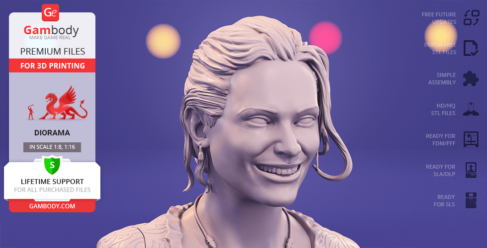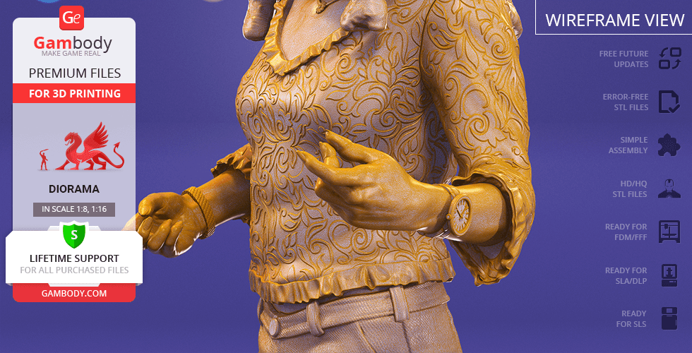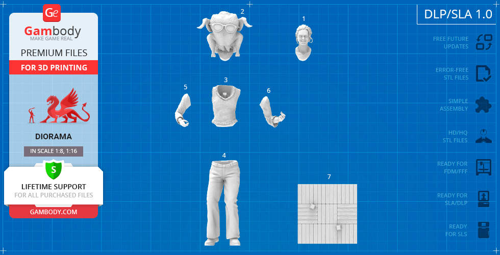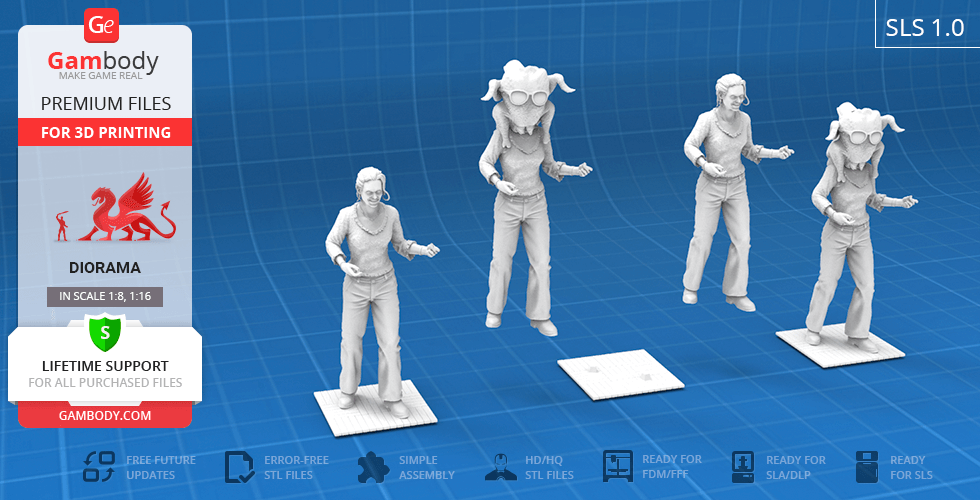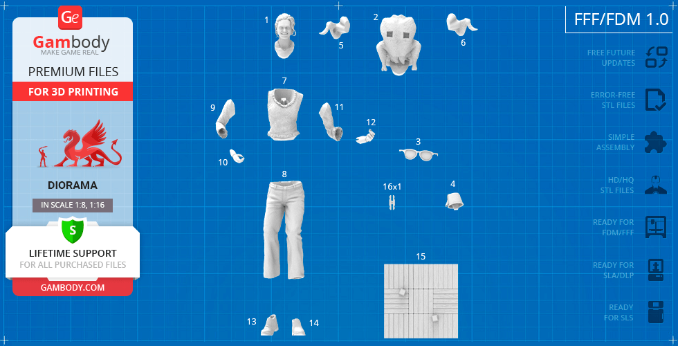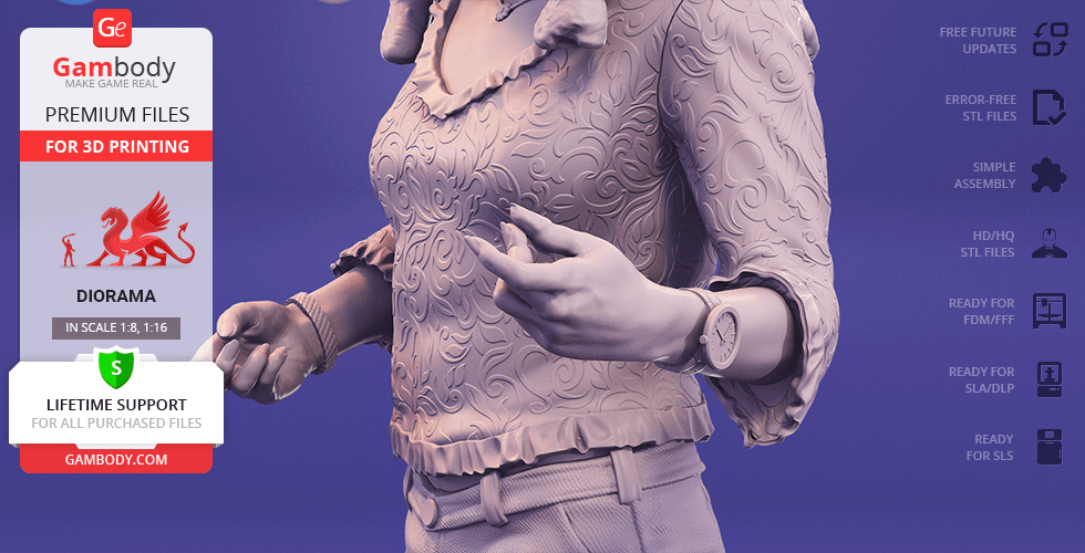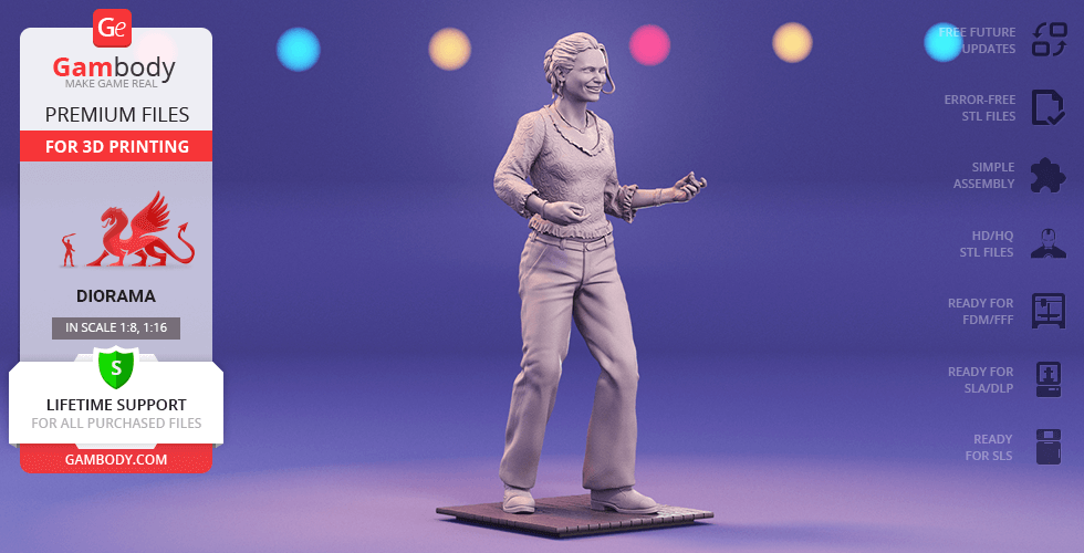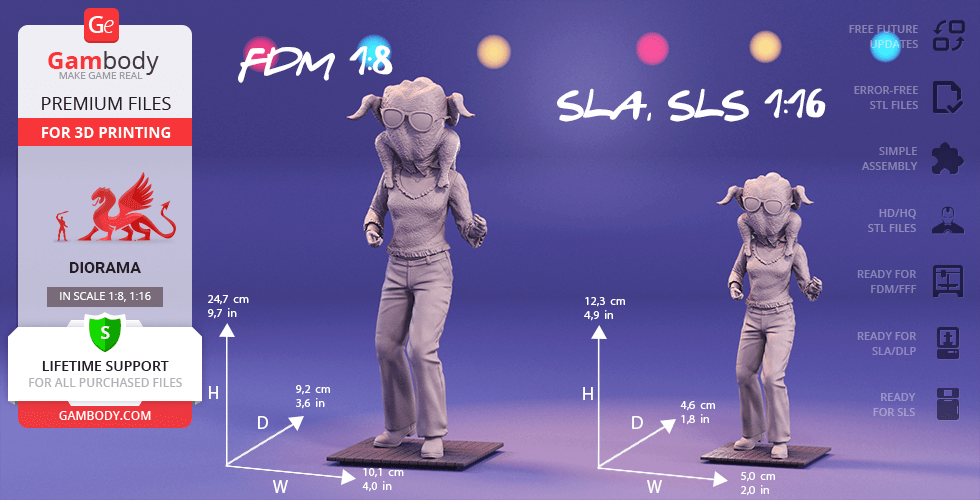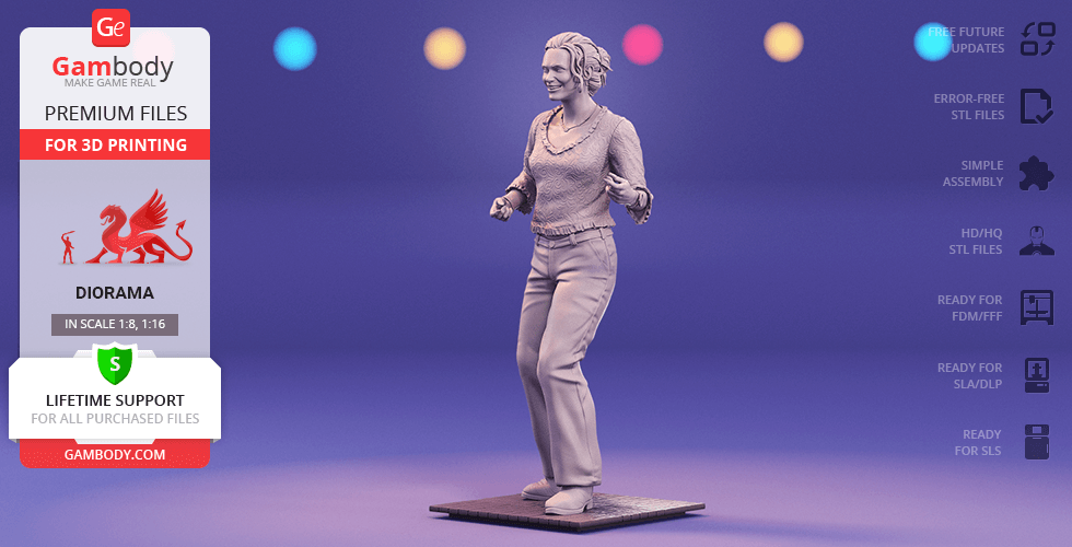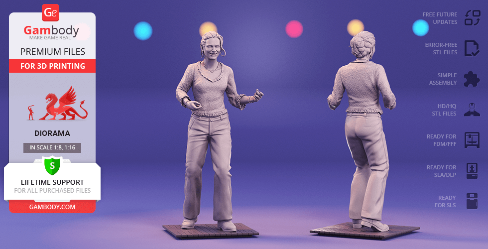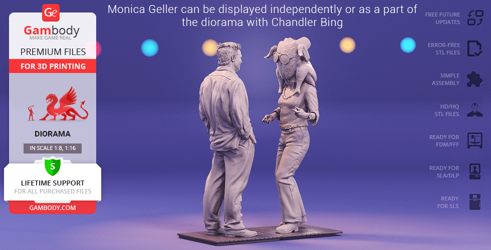 - STL files of Monica Geller 3D Model for 3D printing which consist of 35 parts;- 4 versions of files for this model for FFF/FDM, DLP/SLA, DLP/SLA Eco and SLS;- High-poly detailed figurine of Monica Geller;- Assembly Manual for FFF/FDM 1.0 and DLP/SLA 1.0 versions in PDF format;- Detailed settings that we provide as a recommendation for Cura , Simplify3D and Slic3r for the best print;- Full technical support from the Gambody Support Team.